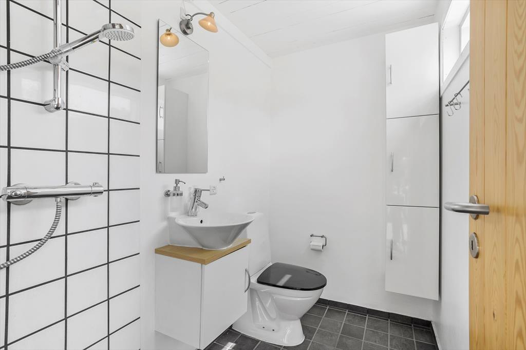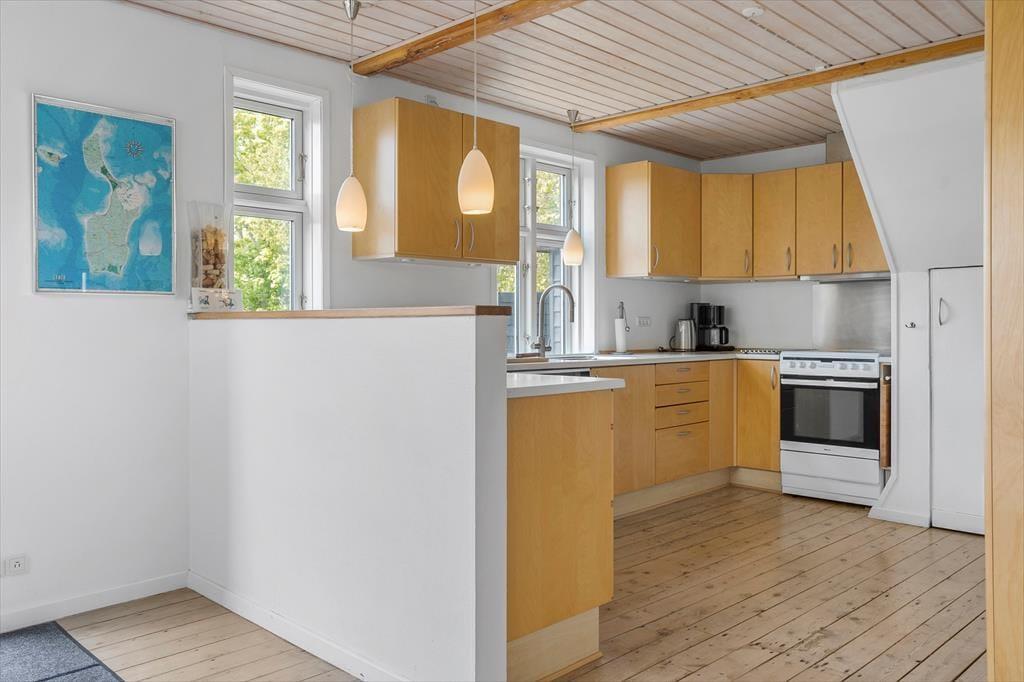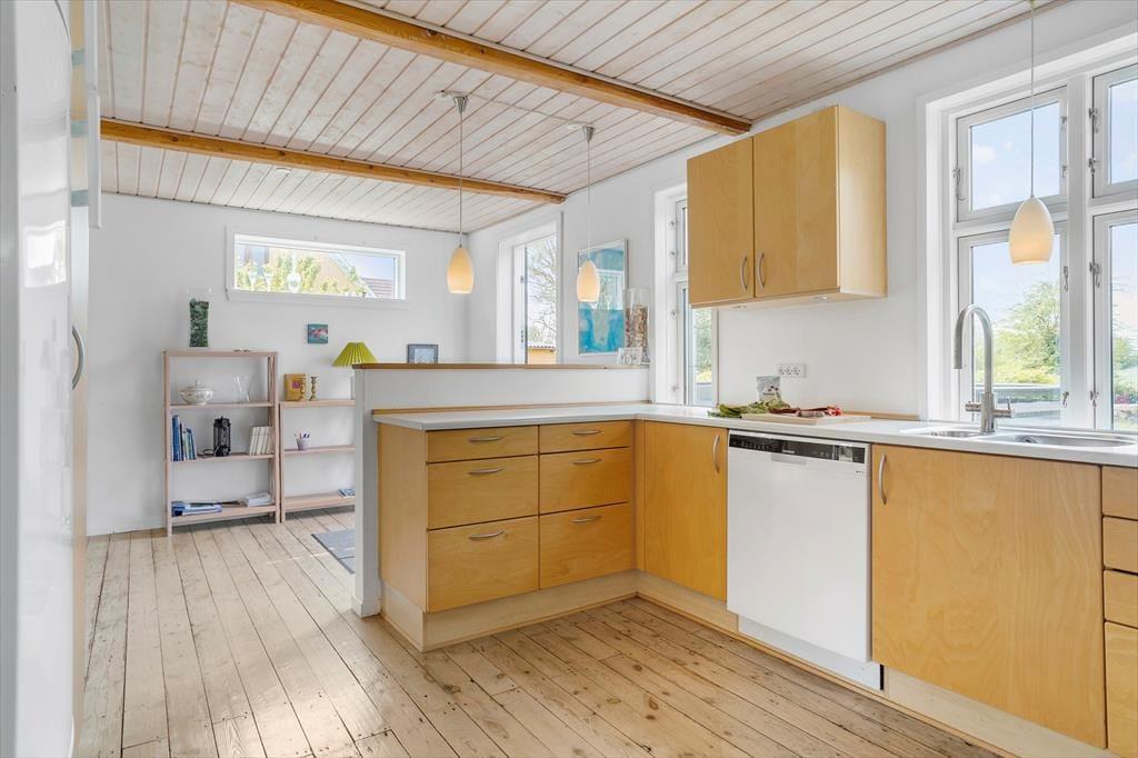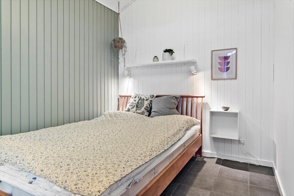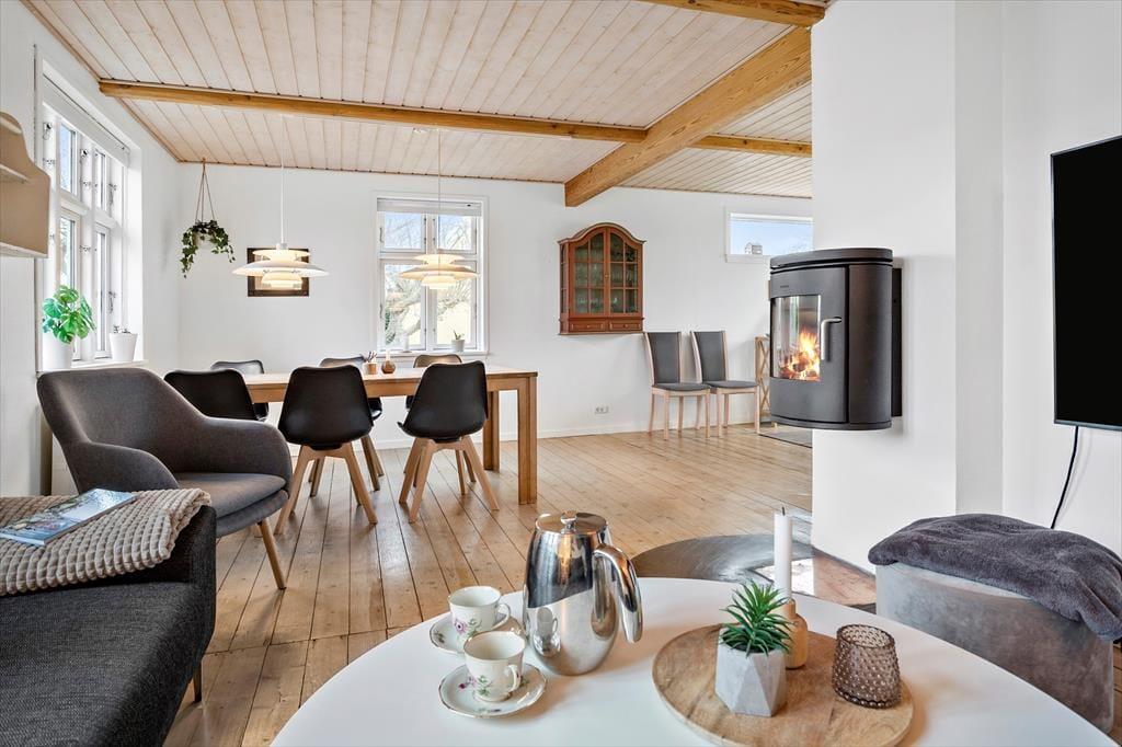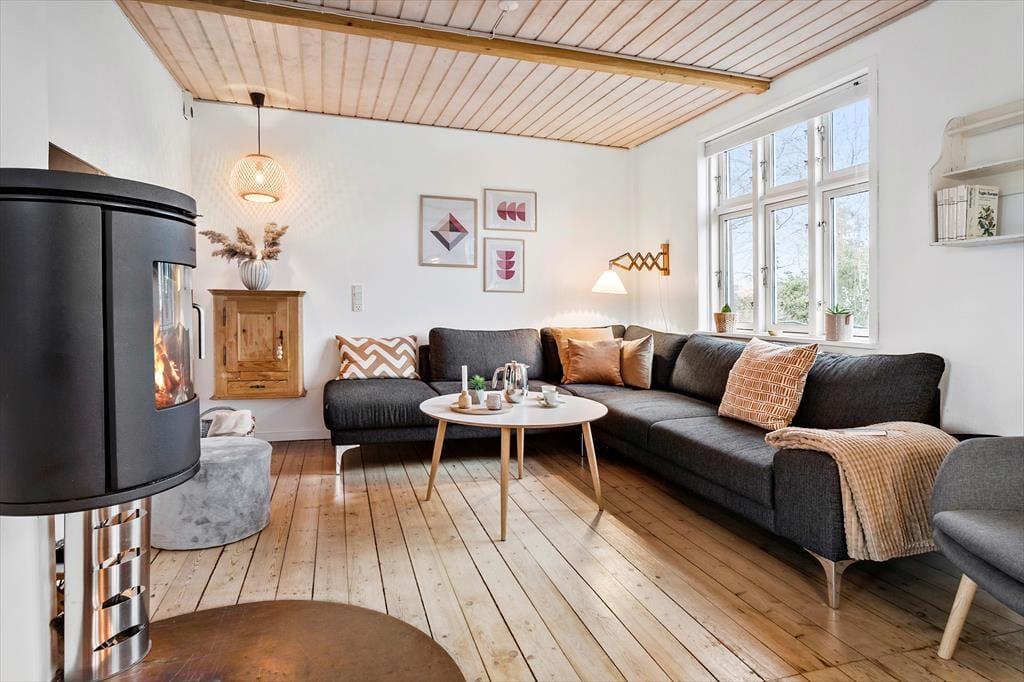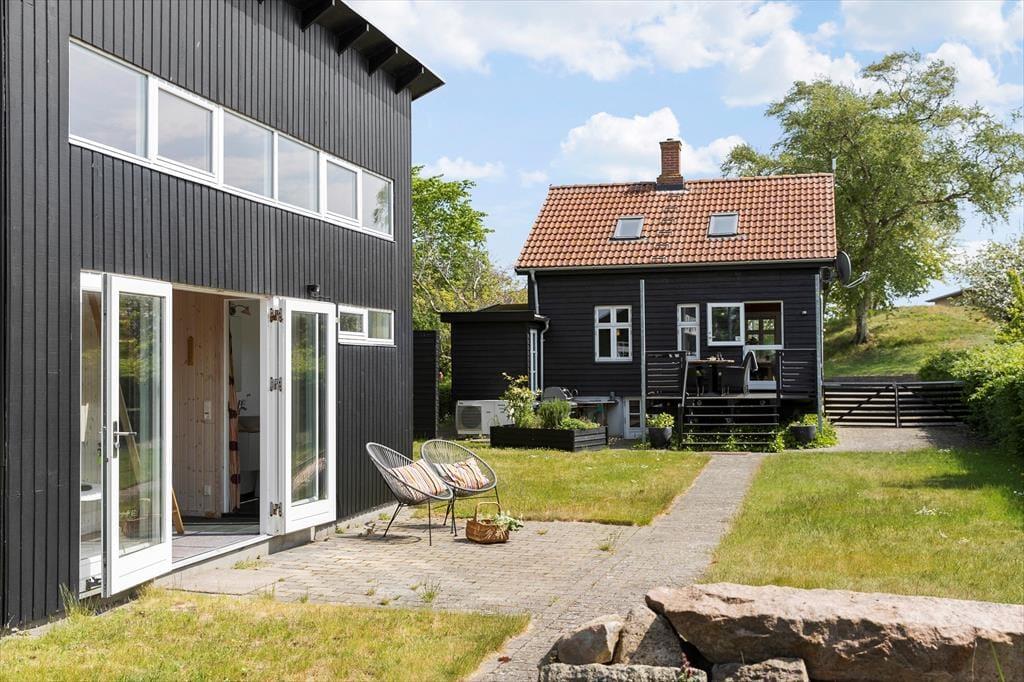 Das Sommerhaus samt Nebengebäude bieten zusammen eine Menge Platz für sowohl gemütliches Beisammensein als auch für ein wenig Zeit jeweils allein. Das helle Wohnzimmer mit Holzfußboden, Kamin und Tür zur Terrasse bildet mit der gut ausgestatteten Küche eine Einheit. Vom Eingang eine Stufe hinunter gelangt man zum Badezimmer mit Dusche und Handtuchtrockner. Im ersten Stock befindet sich ein geräumiger Absatz; hier sind zwei schöne Schlafräume mit doppelten Boxspringbetten untergebracht. Hier hat man Meerblick im einen Zimmer, während das andere über einen französischen Balkon verfügt. Auf der gesamten Etage ist Holzfußboden verlegt. Das hübsche Nebengebäude aus dem Jahr 2007 beherbergt außerdem zwei Schlafzimmer mit jeweils zwei Boxspringbetten, ferner einen Schlafboden und ein herrliches Badezimmer mit Fußbodenheizung. An der Ostseite des Nebengebäudes befindet sich eine Außendusche.