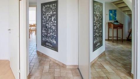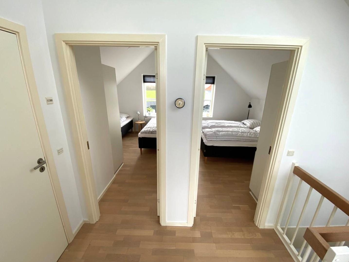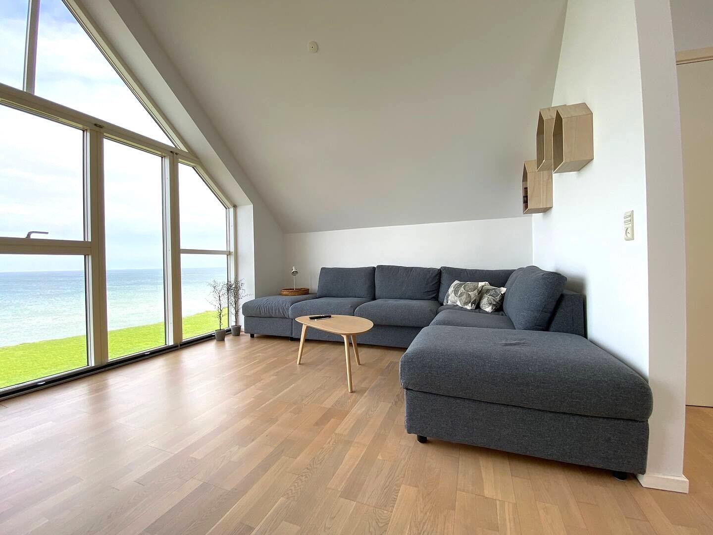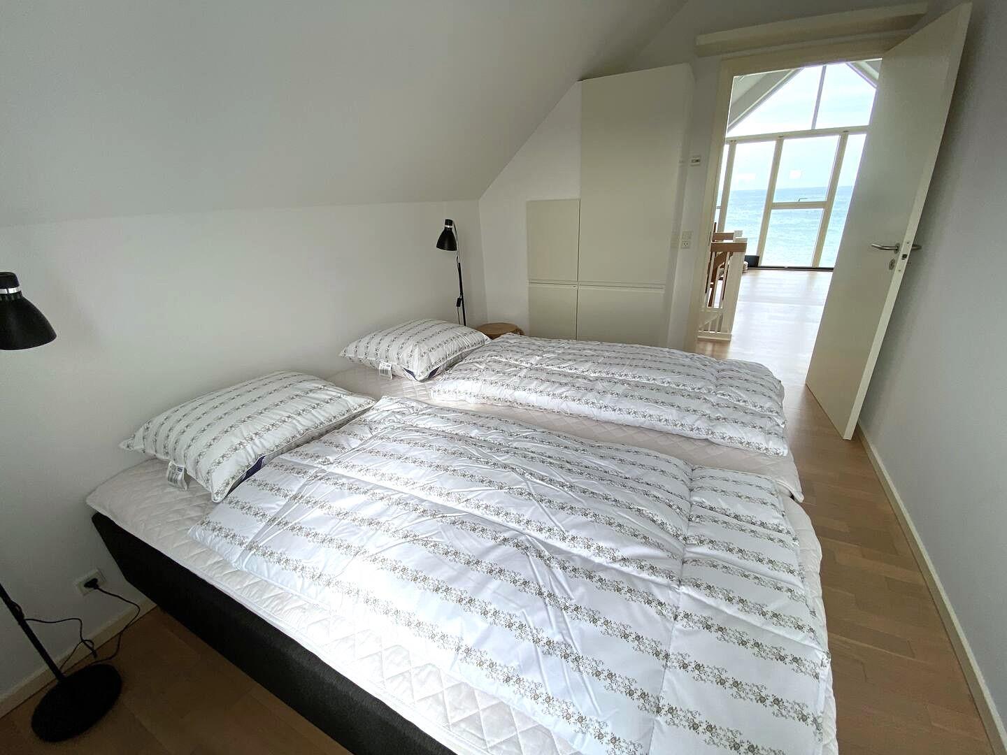 On the first floor, you step directly into the bright living room with large panoramic windows, where you can enjoy the view of the sea and the green areas. Sit down on the soft sofa, turn on the TV – or let your gaze wander towards the horizon. Up here you will find two more bedrooms (one with a double bed and one with two single beds) and another bathroom with a shower cubicle.