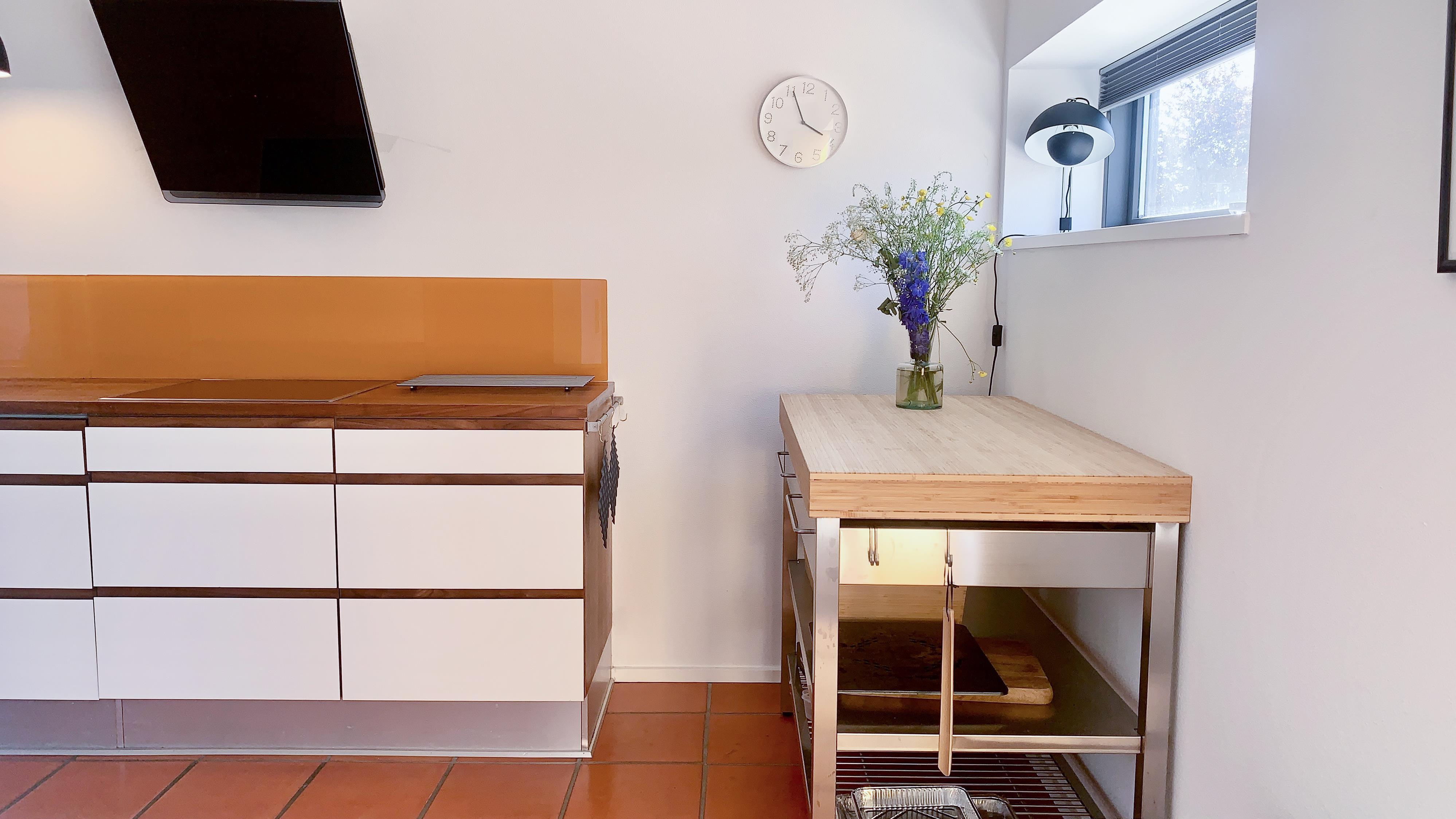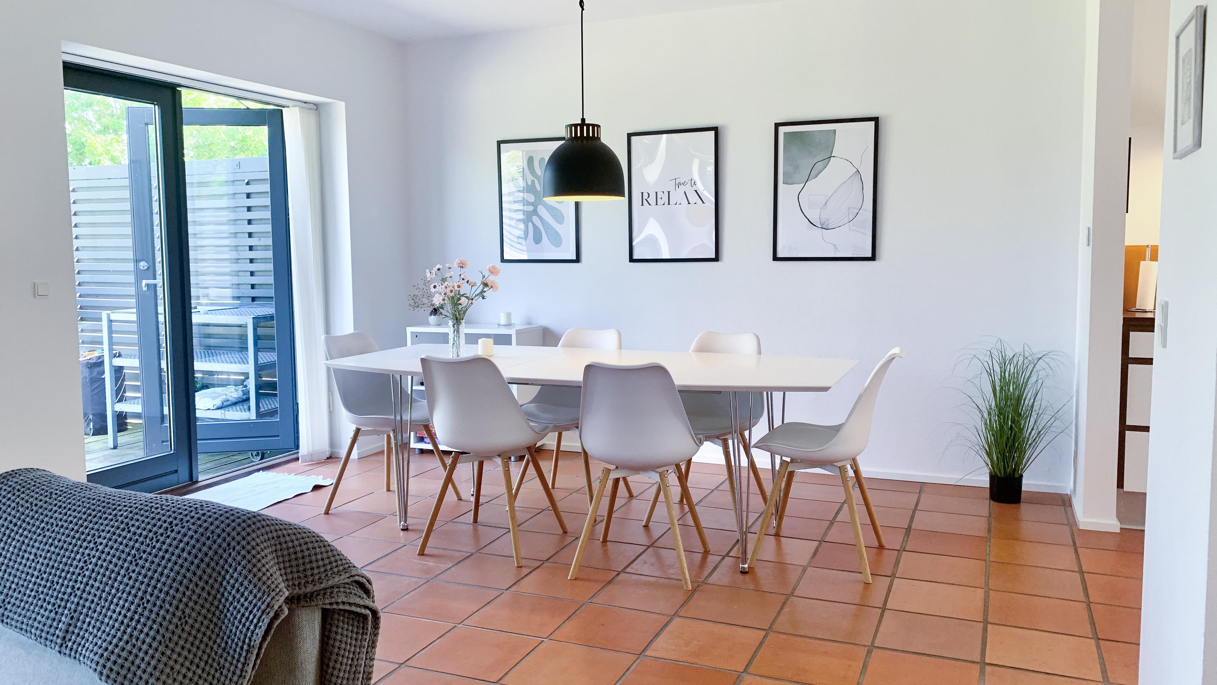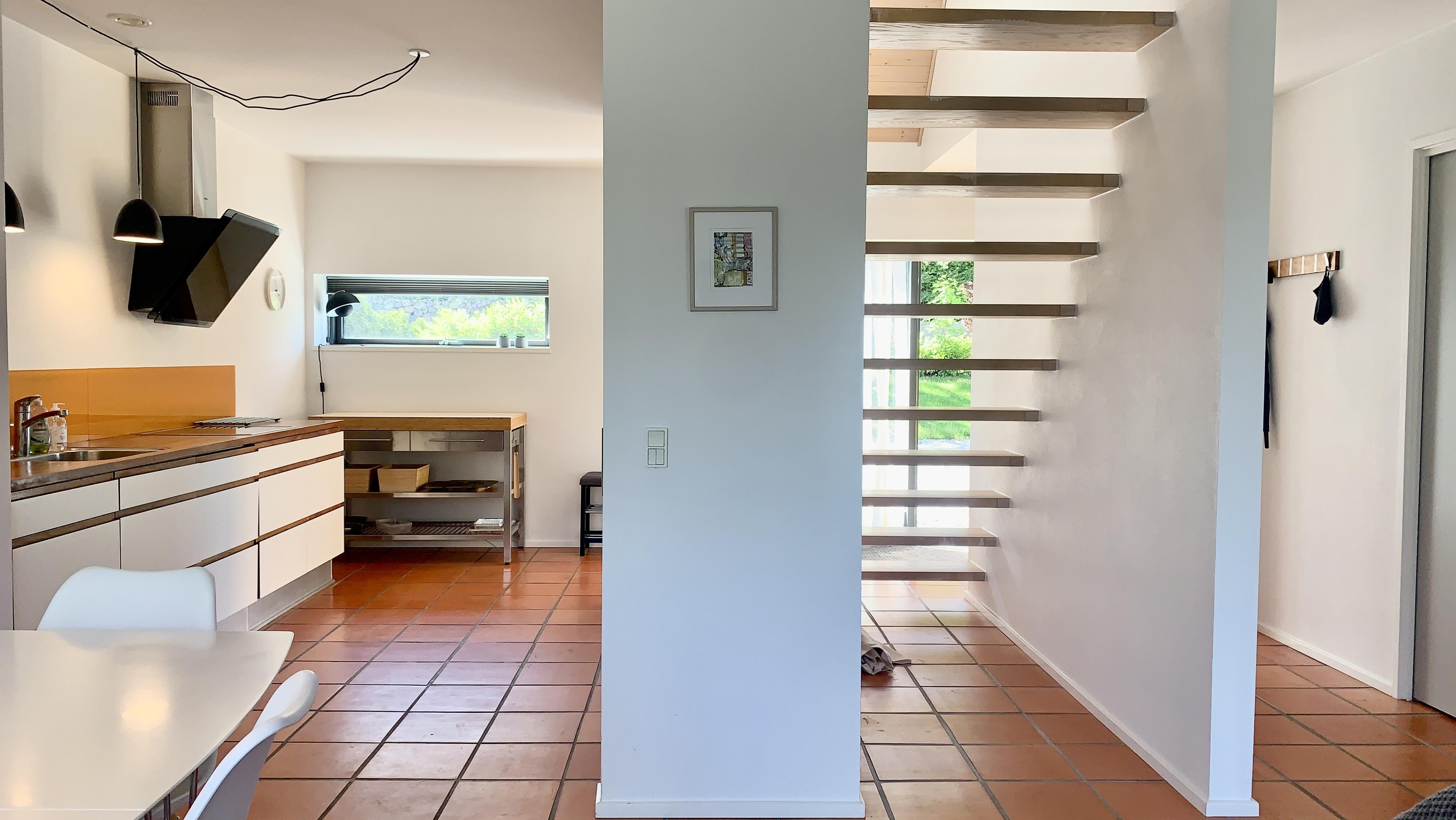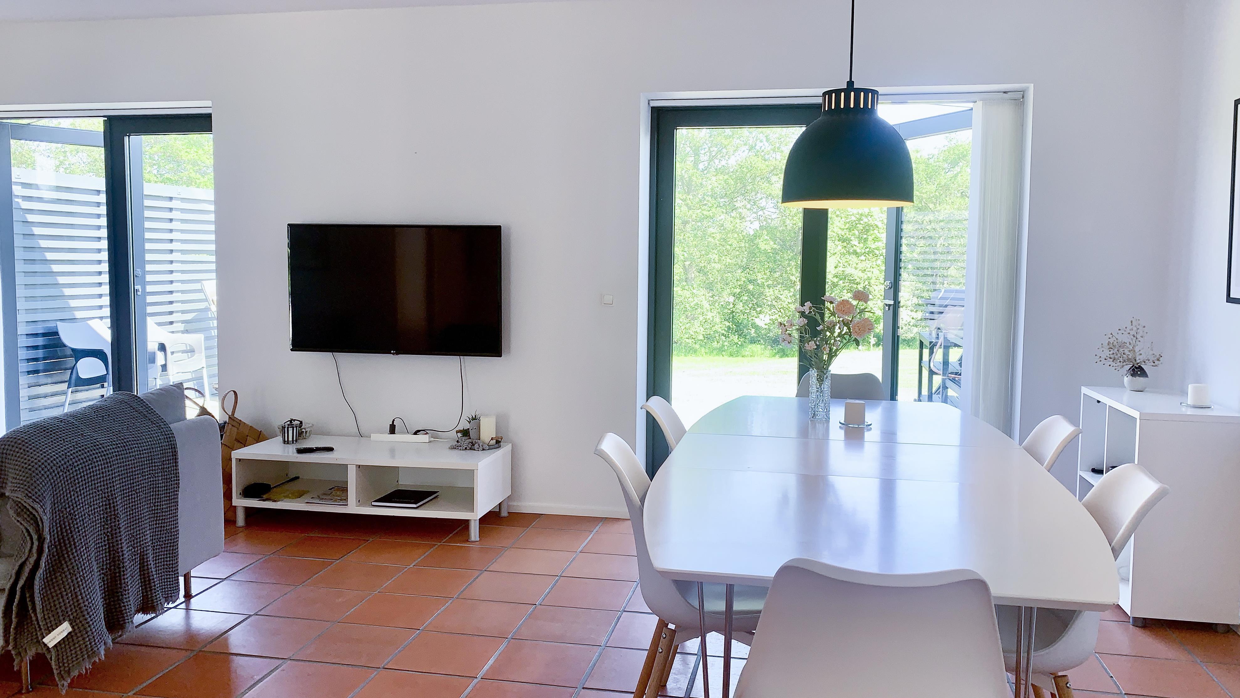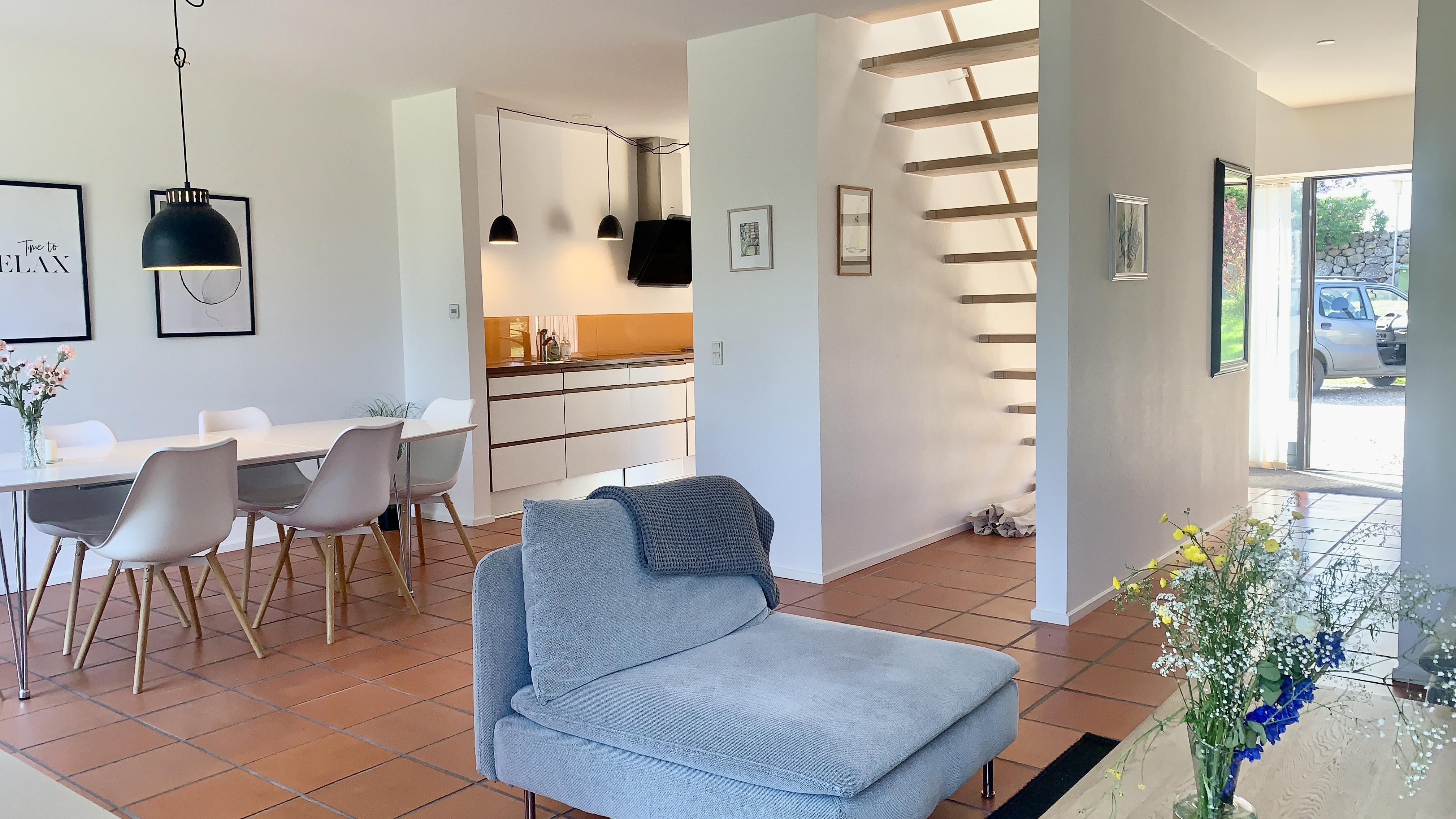 The house is bright, modern, and inviting with a good layout. On the ground floor, you will find an open kitchen-living room with a dining area and sofa corner, large windows, and direct access to the terrace. Here you can gather for meals, enjoy games, or watch TV with Chromecast. The bathroom is also located on the ground floor.