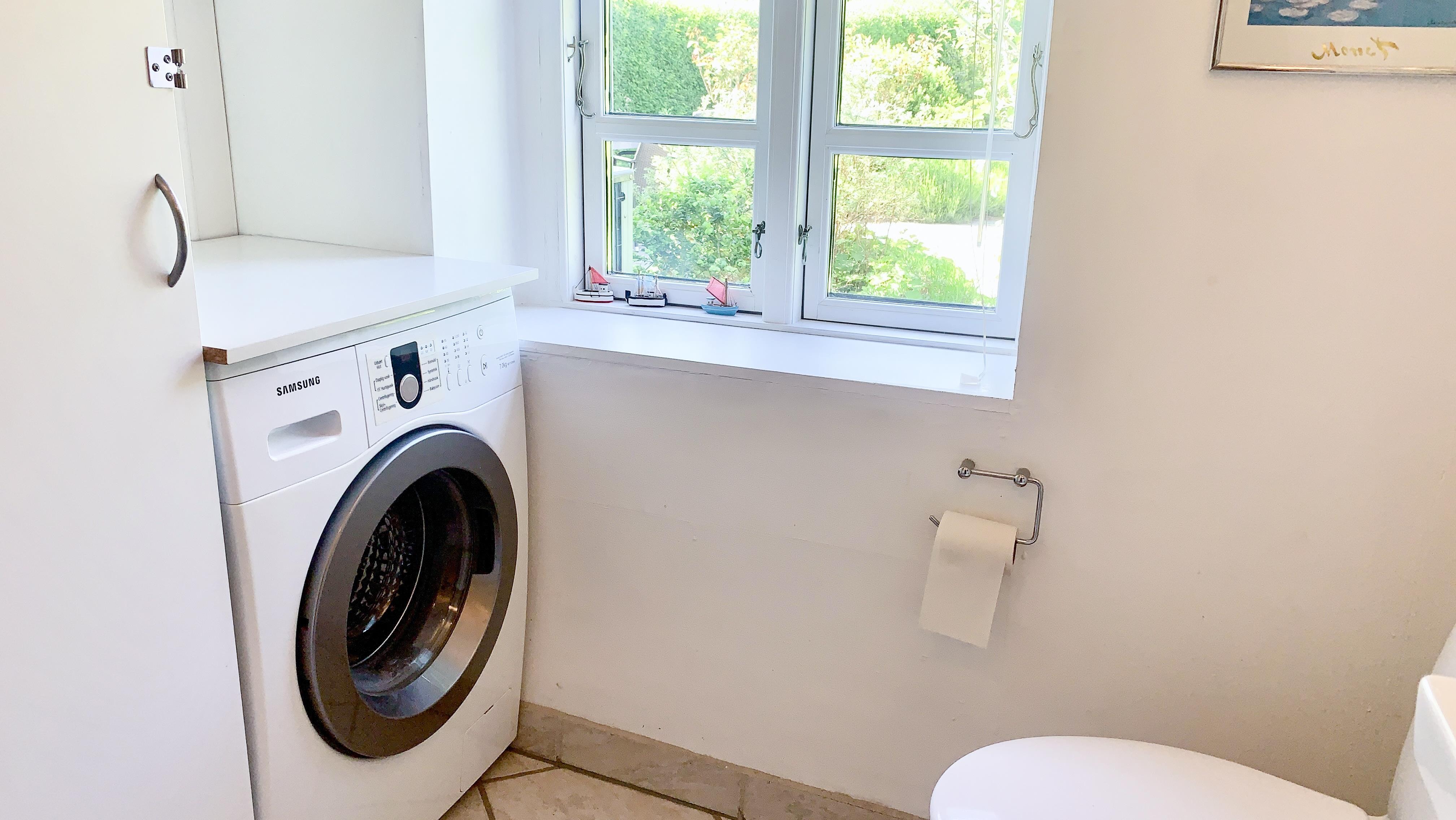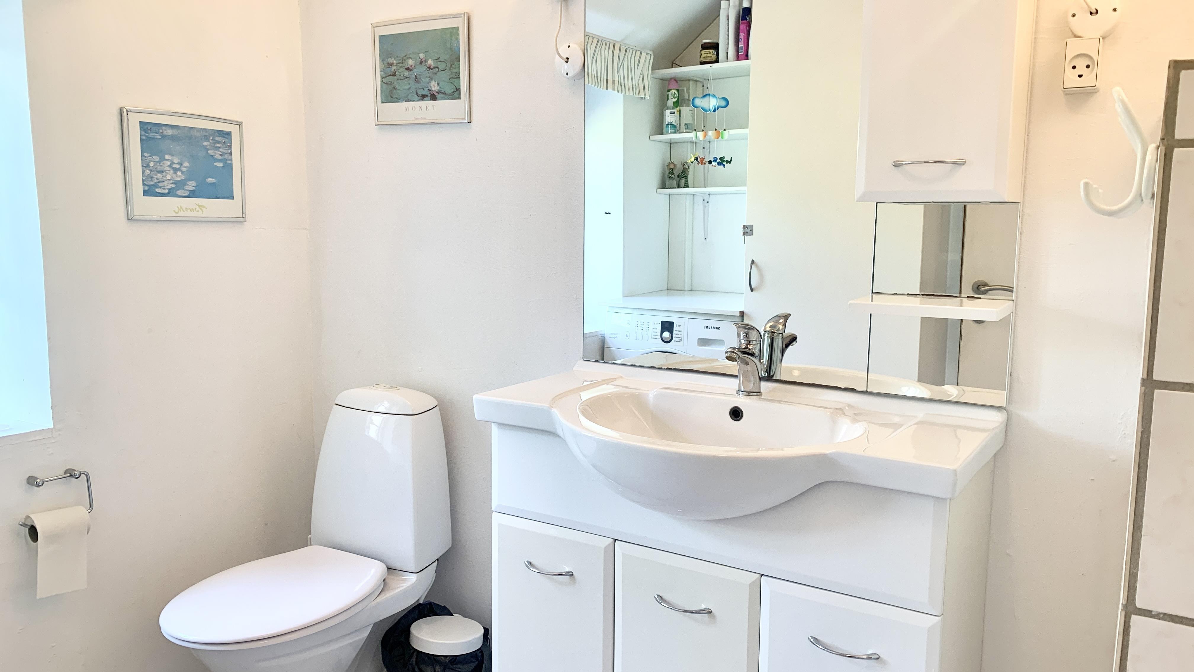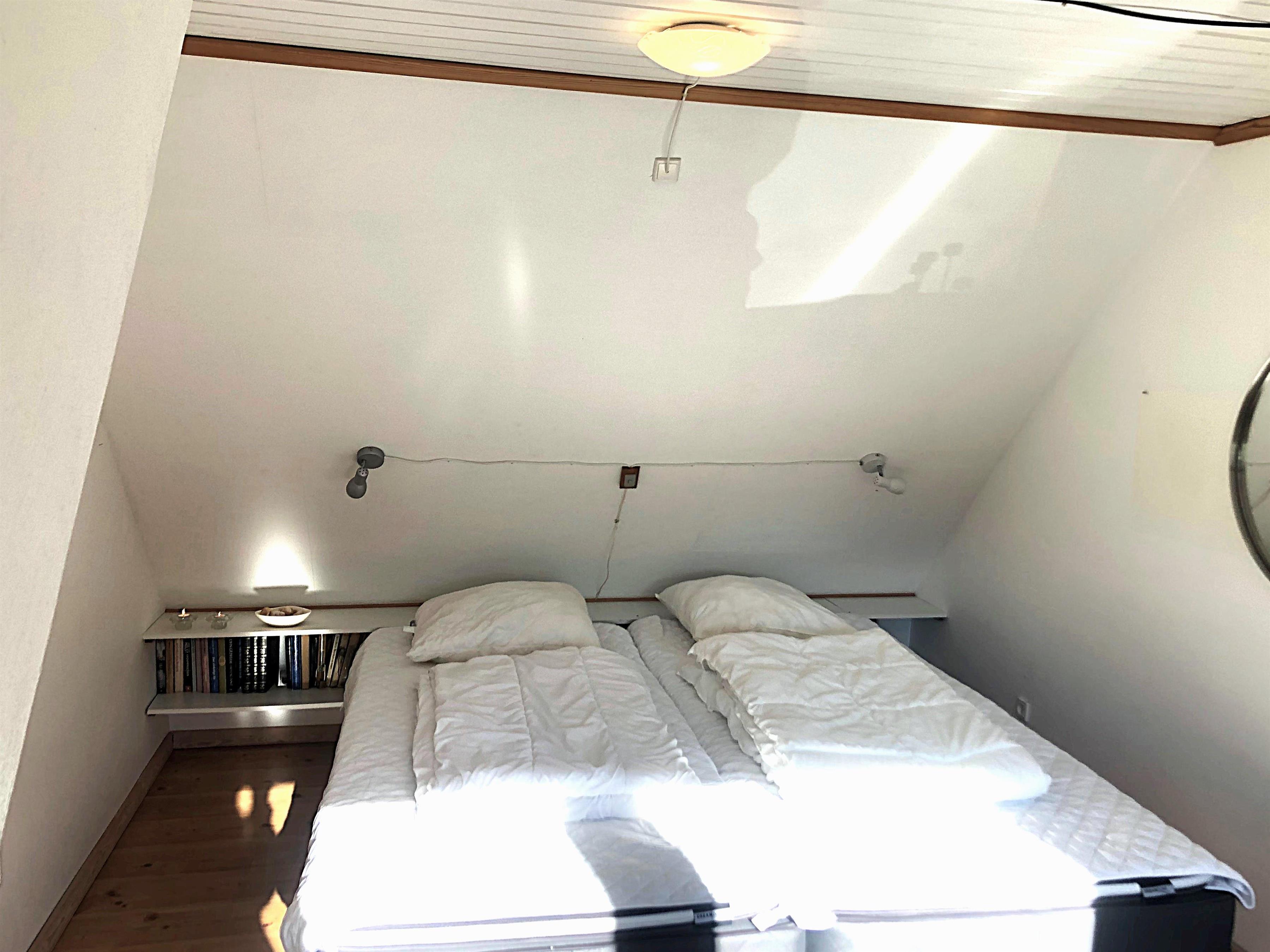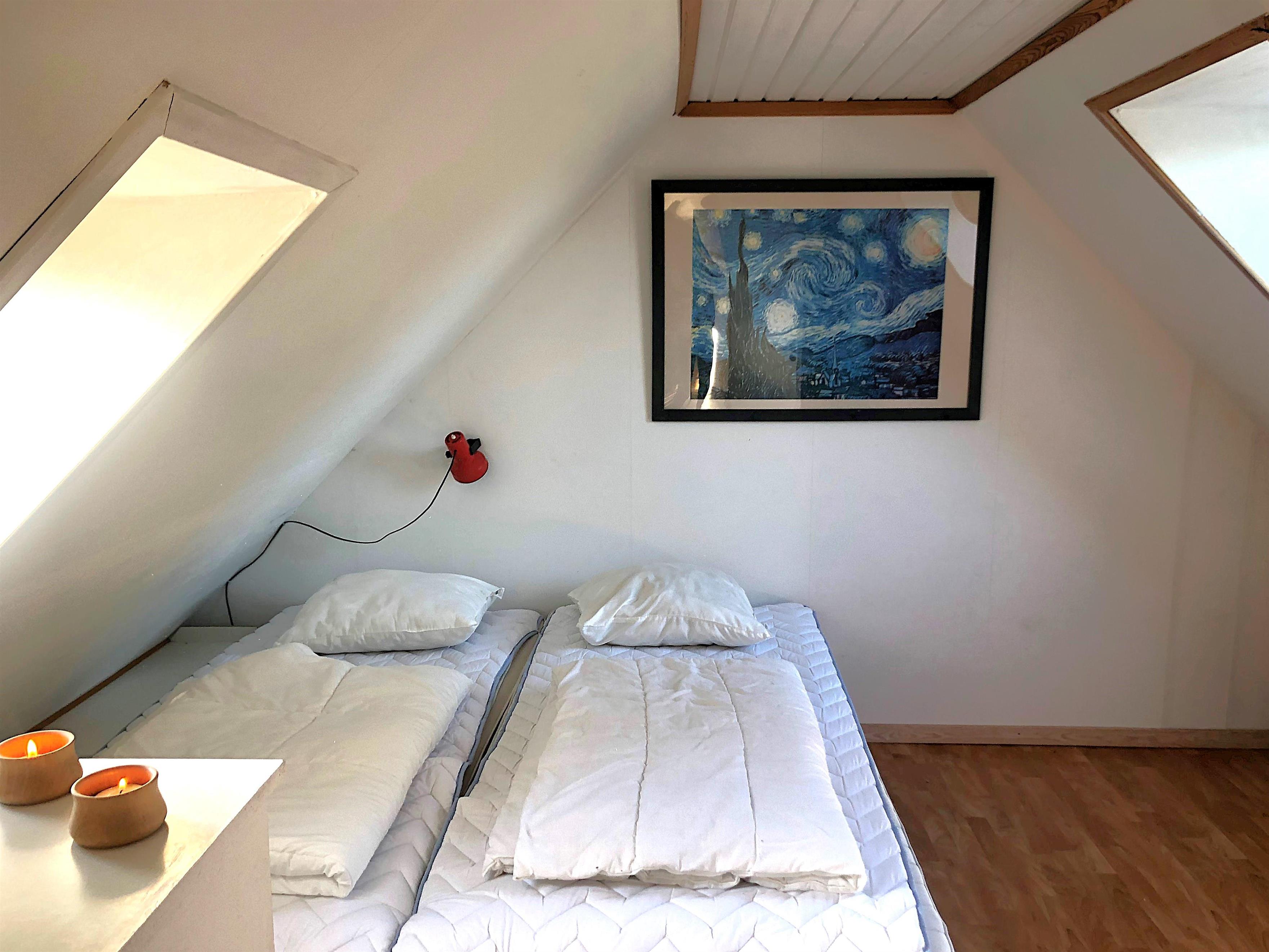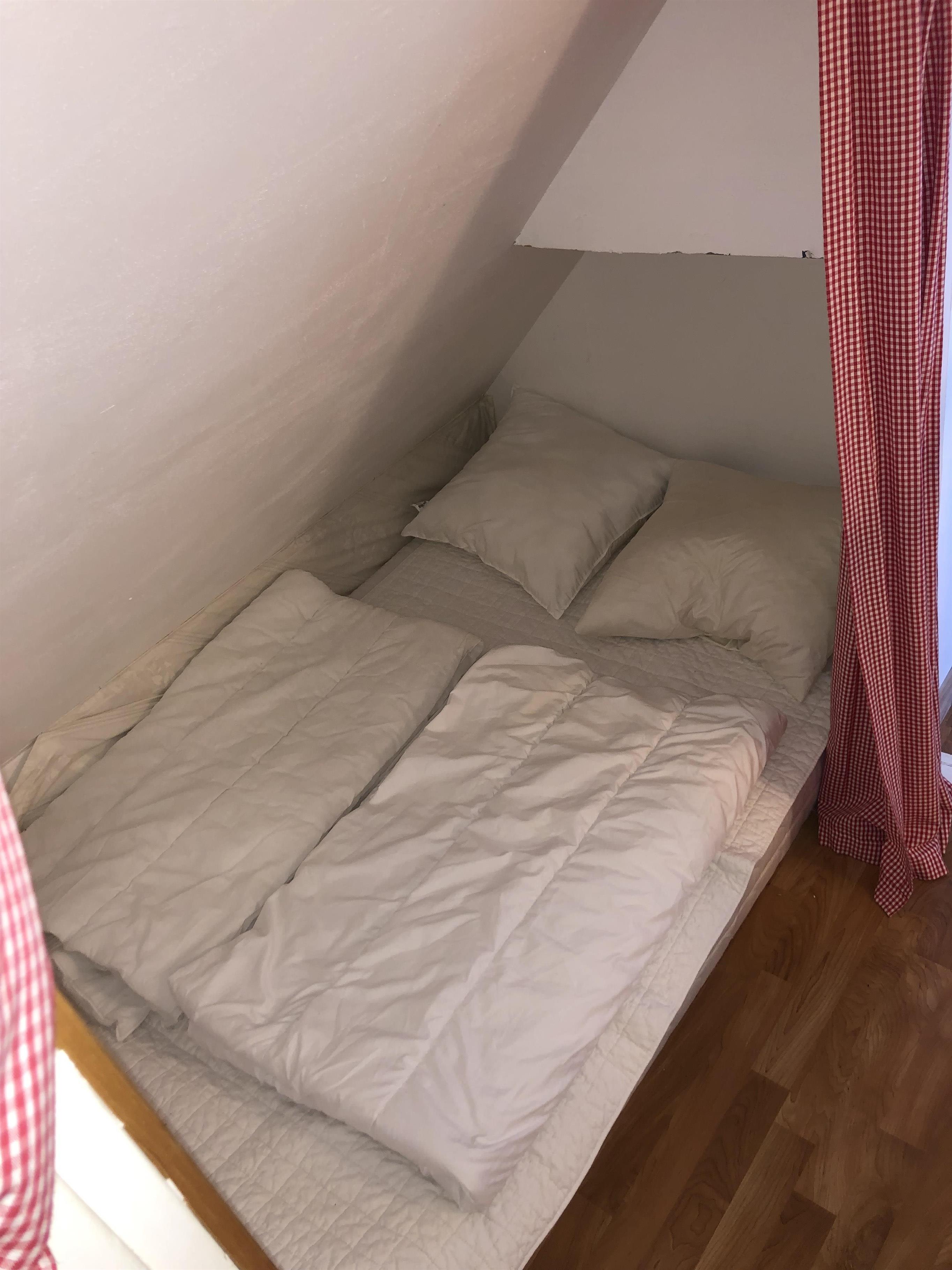 The house has a bright and inviting kitchen-dining area where you can gather family and friends for cooking and cosy moments together. You can relax in the sofa corner – and, if necessary, transform it into an extra, screened-off sleeping area. When the weather turns cooler, you can light the wood-burning stove and enjoy the warmth and tranquillity. The bathroom is also located on the ground floor.