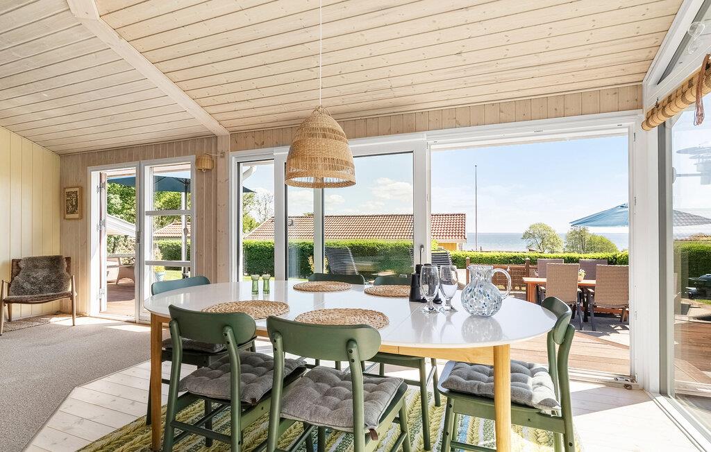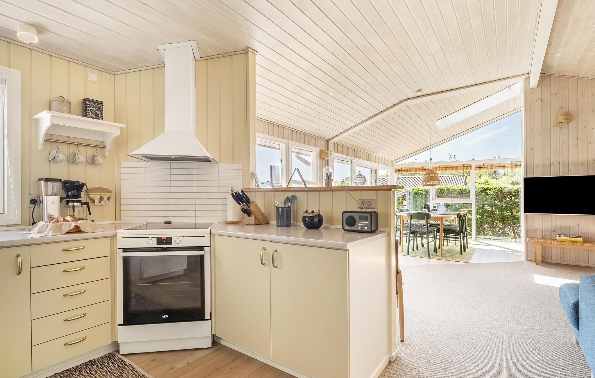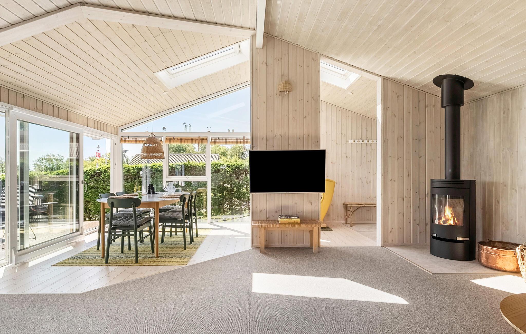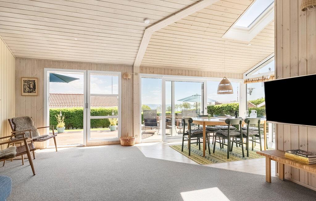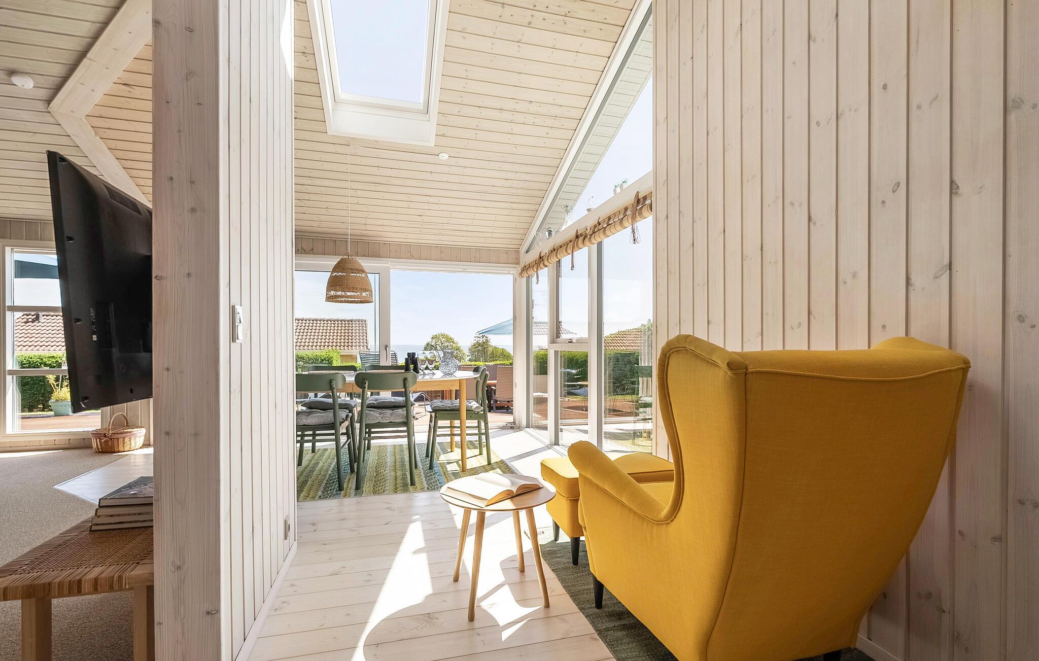 Nur wenige Schritte vom kinderfreundlichen Strand entfernt, genießen Sie in diesem Ferienhaus Erholung pur. Das Haus beeindruckt mit seiner behaglichen Einrichtung und einem durchdachten Design. Der offene Wohnbereich lädt mit seinen bequemen Sofas und einem Kaminofen zum Verweilen ein. Genießen Sie den Panoramablick auf das Wasser durch die großen Fenster, während Sie in der Küche Ihre Mahlzeiten zubereiten. Der angrenzende Wintergarten ist ein Highlight des Hauses und bietet Ihnen zu jeder Jahreszeit einen geschützten Platz mit Aussicht.