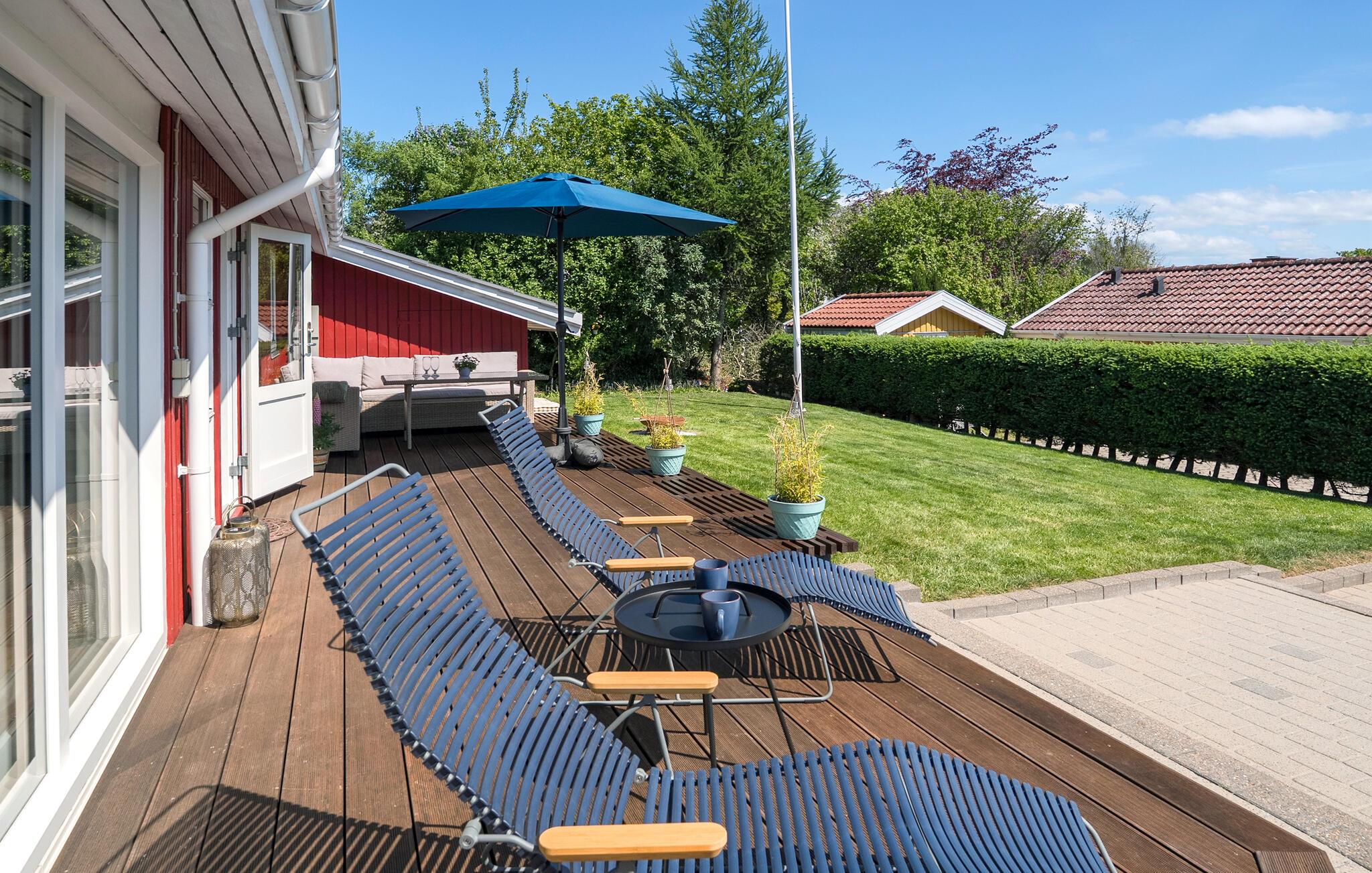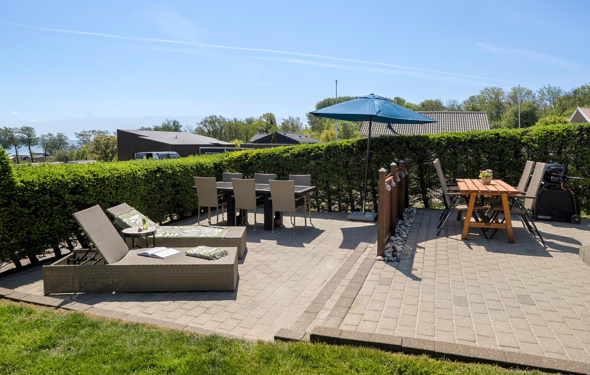 Draußen erwartet Sie eine große Terrasse mit Gartenmöbeln und Sonnenliegen. Nutzen Sie die Gelegenheit, bei einem gemütlichen Frühstück oder einem entspannten Grillabend die frische Luft zu genießen. Der gepflegte Garten mit seiner Hecke sorgt für Privatsphäre und bietet Kindern ausreichend Platz zum Spielen. Vom Grundstück aus können Sie den Blick auf das Meer und die umliegende Natur schweifen lassen.