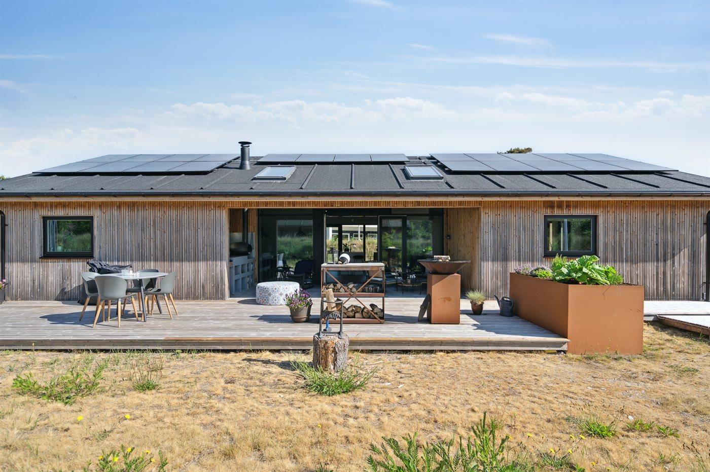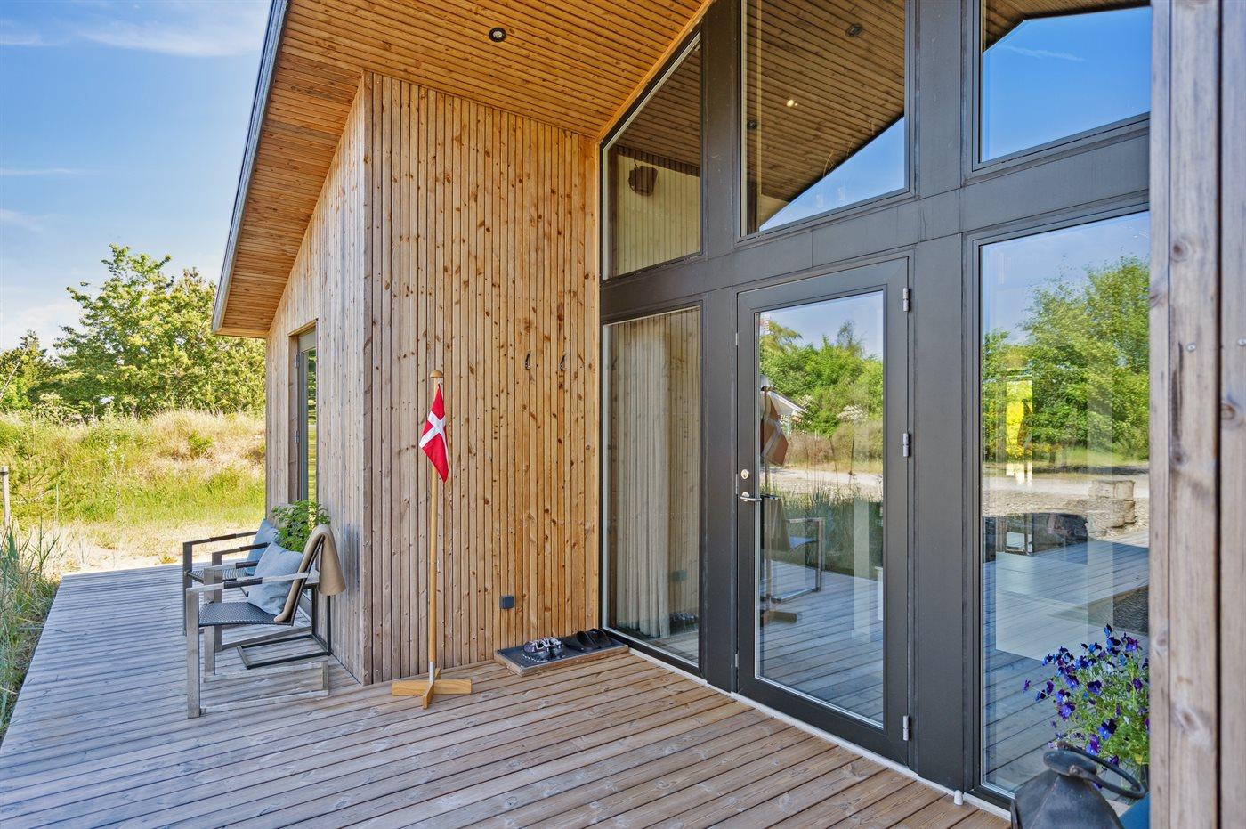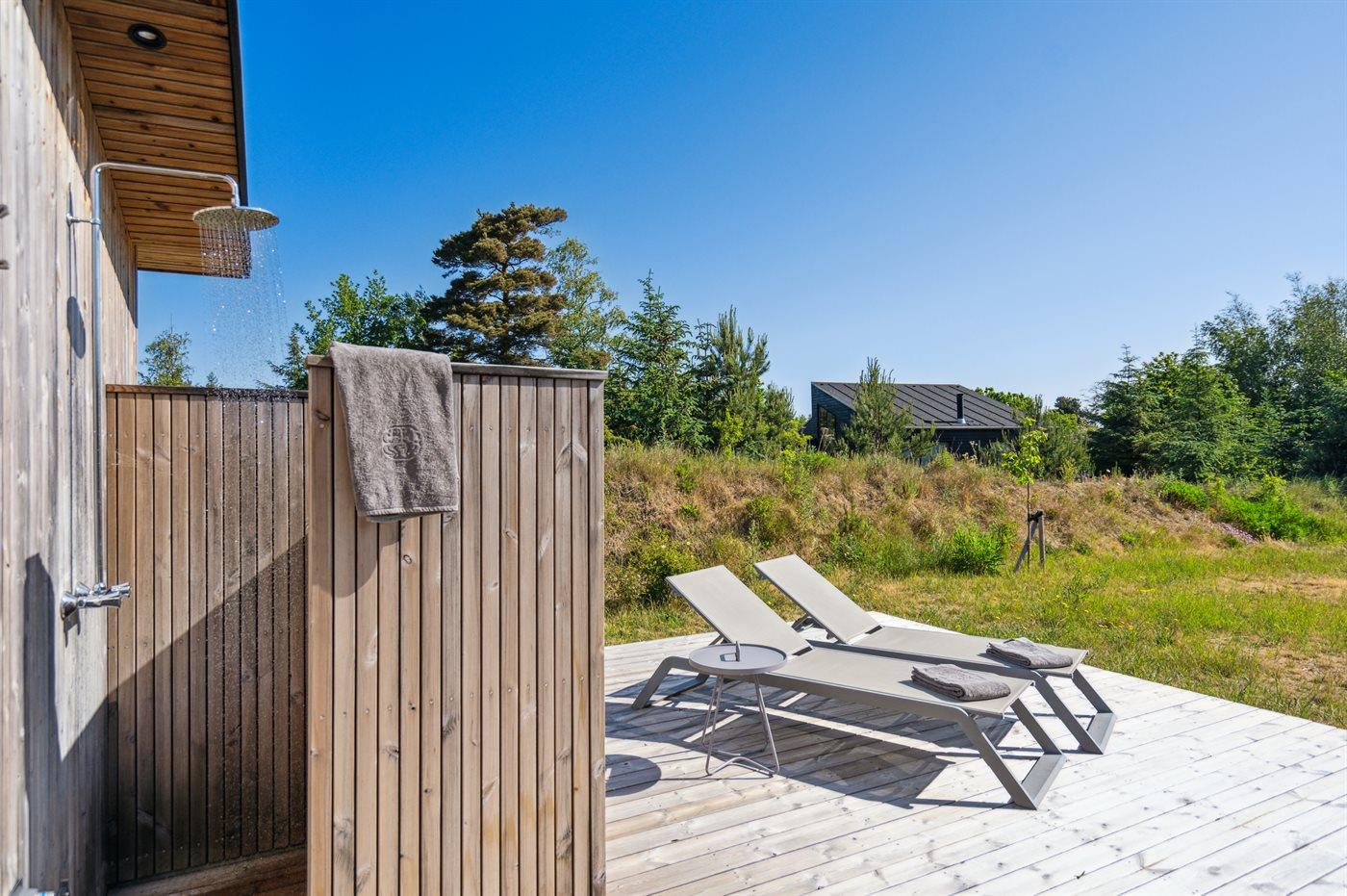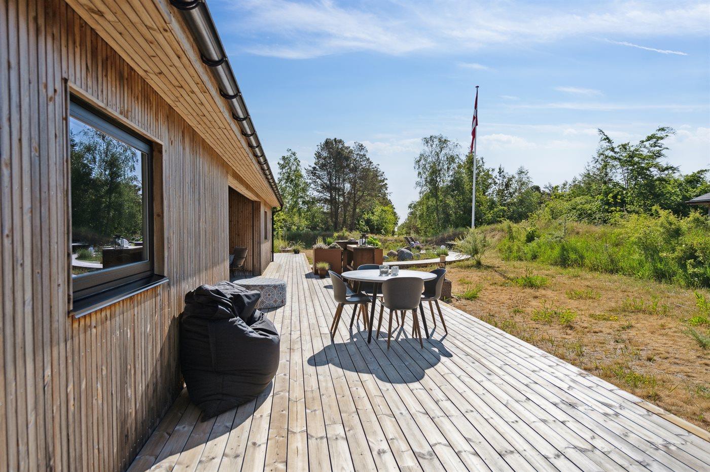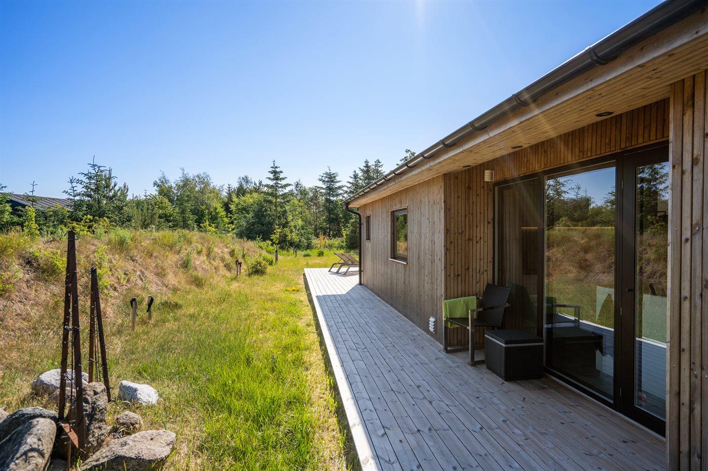 The holiday home is situated on a 1550 m² natural site. Situated 200 m from the sea. Situated 5500 m from inlet. Situated 1000 m from lake. Nearest shop is 3300 m away. You will find a golf course in a distance of 5700 m. A 200 m² terrace belong to the holiday home. Furthermore the house has a 40 m² covered terrace.Fire place. Outdoor shower. On warm nights the outdoor fireplace ensures a cosy atmosphere. It is possible to prepare the food in the outdoor kitchen. Barbecue at your disposal. Plug for charging electric car is available. Parking place by the holiday home.