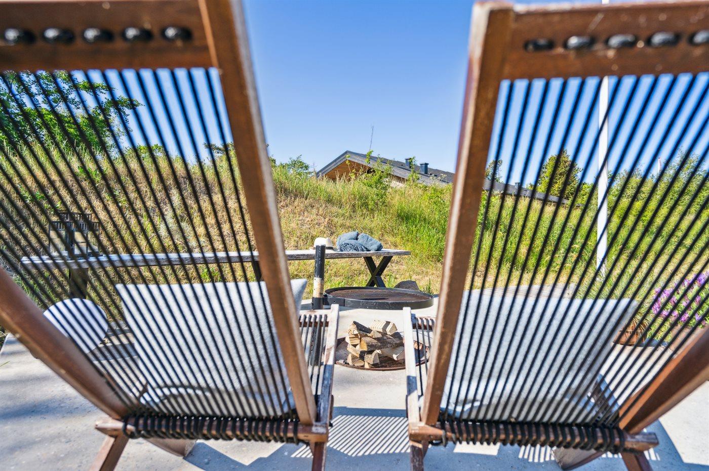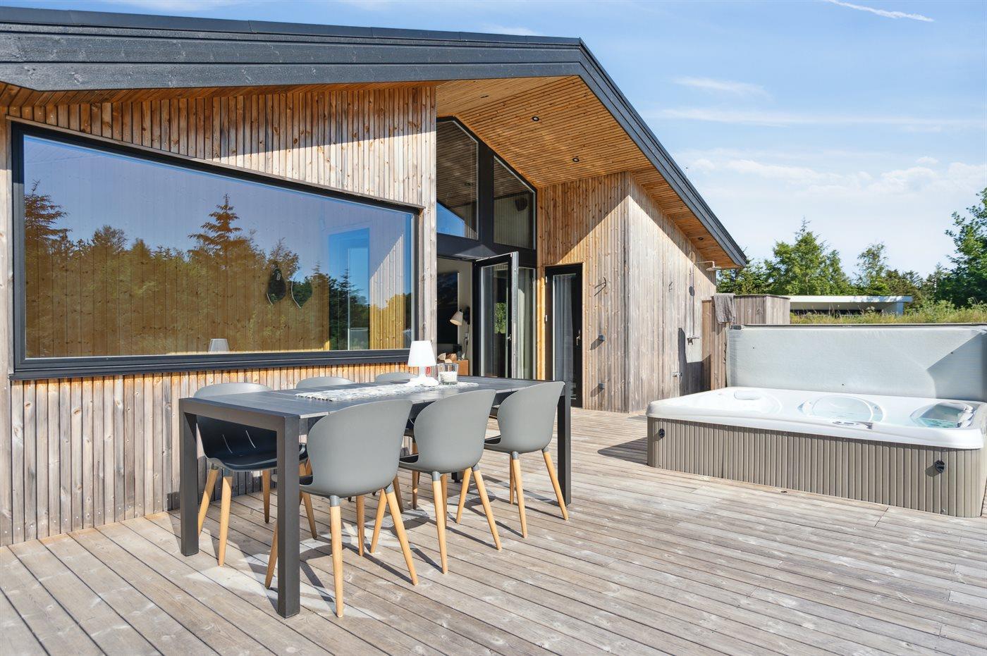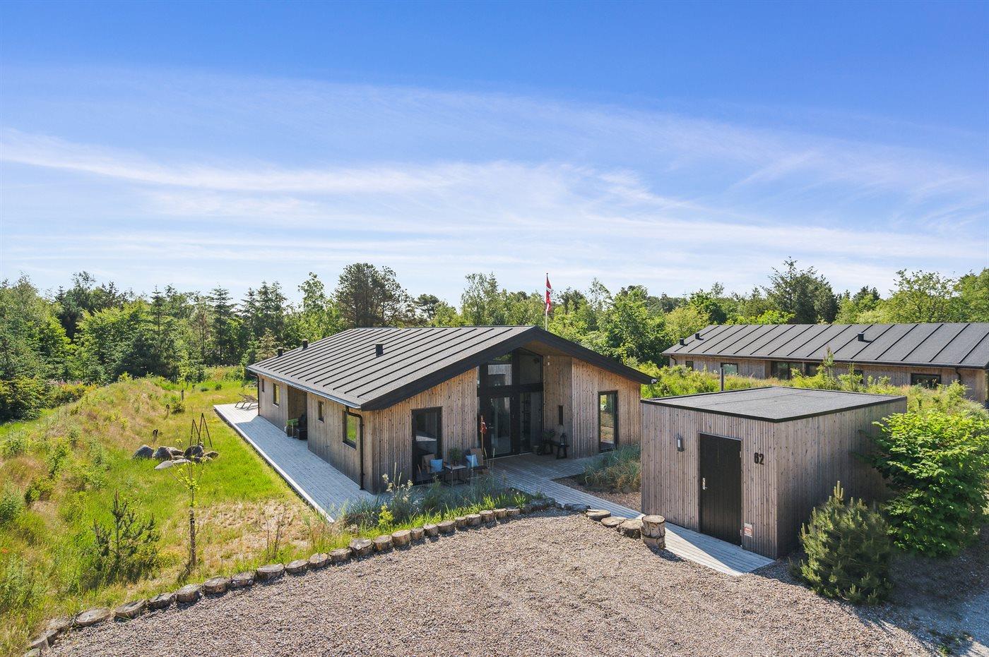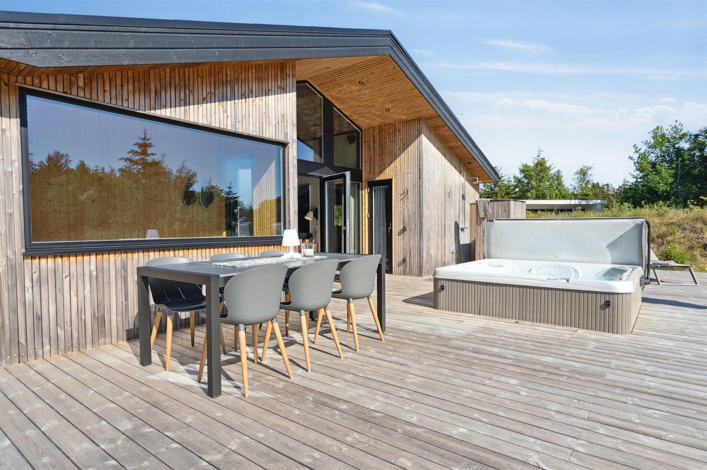 The holiday home is situated on a 1550 m² natural site. Situated 200 m from the sea. Situated 5500 m from inlet. Situated 1000 m from lake. Nearest shop is 3300 m away. You will find a golf course in a distance of 5700 m. A 200 m² terrace belong to the holiday home. Furthermore the house has a 40 m² covered terrace.Fire place. Outdoor shower. On warm nights the outdoor fireplace ensures a cosy atmosphere. It is possible to prepare the food in the outdoor kitchen. Barbecue at your disposal. Plug for charging electric car is available. Parking place by the holiday home.