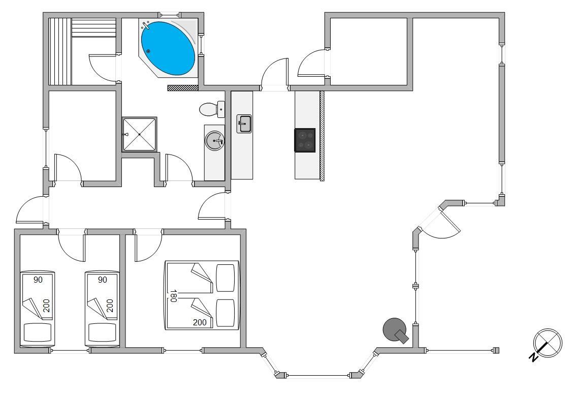 The summer house has two bedrooms: one with a double bed (180 x 200 cm) and the second with two single beds.