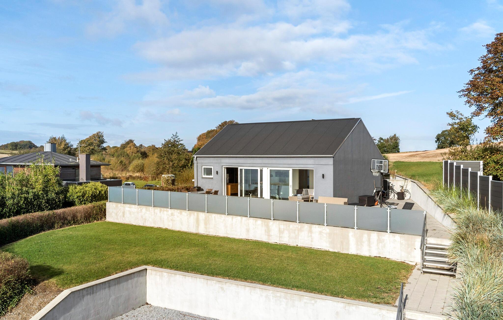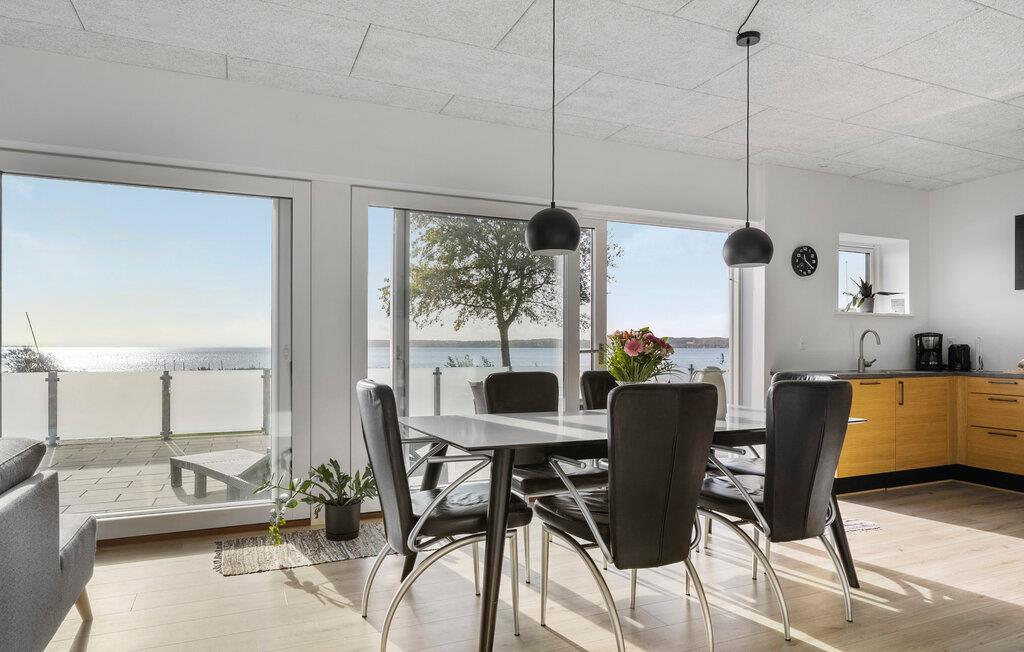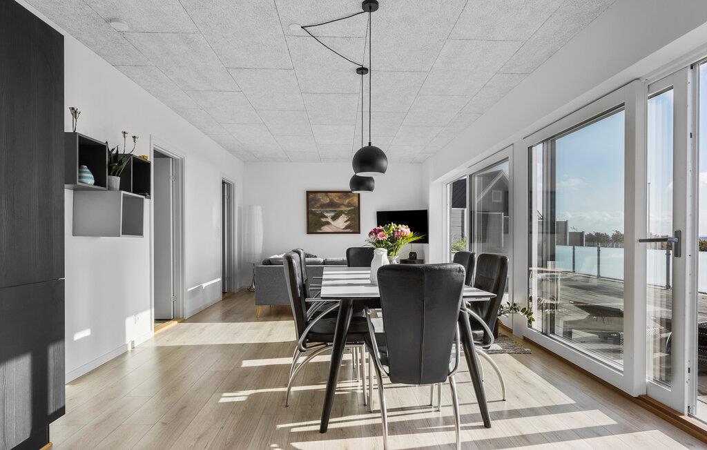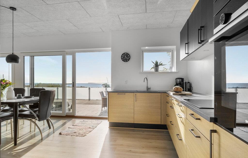 In unmittelbarer Nähe zum Bjert Strand besticht Ihr Ferienhaus durch seine elegante Ausstattung, wodurch ein echtes Wohlfühlambiente entsteht. Im großzügigen Wohnbereich mit seinen großen Fenstern und der offenen Küche können Sie gemeinsam Zeit verbringen, sei es beim Spielen, Essen oder einfach beim Entspannen. Der Esstisch bietet ausreichend Platz für alle und lädt dazu ein, den sagenhaften Blick auf das Meer zu genießen. Relaxen Sie auch auf den gemütlichen Sitzgelegenheiten im Wohnbereich. Ein Grillabend auf der Terrasse zum Tagesabschluss ist eine wunderbare Möglichkeit, den Tag ausklingen zu lassen.