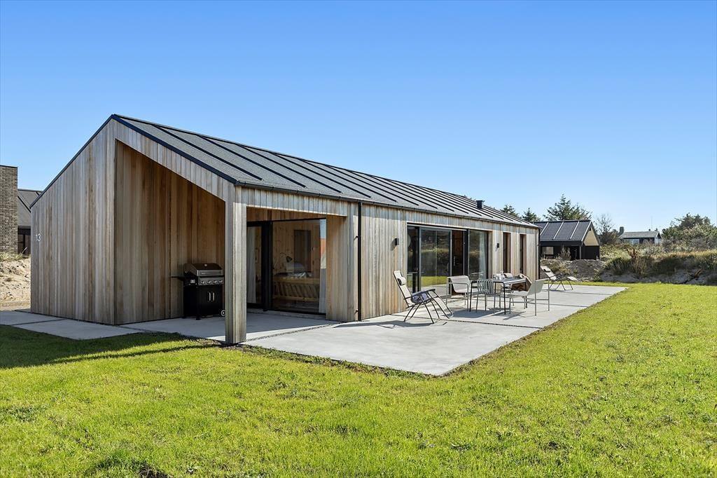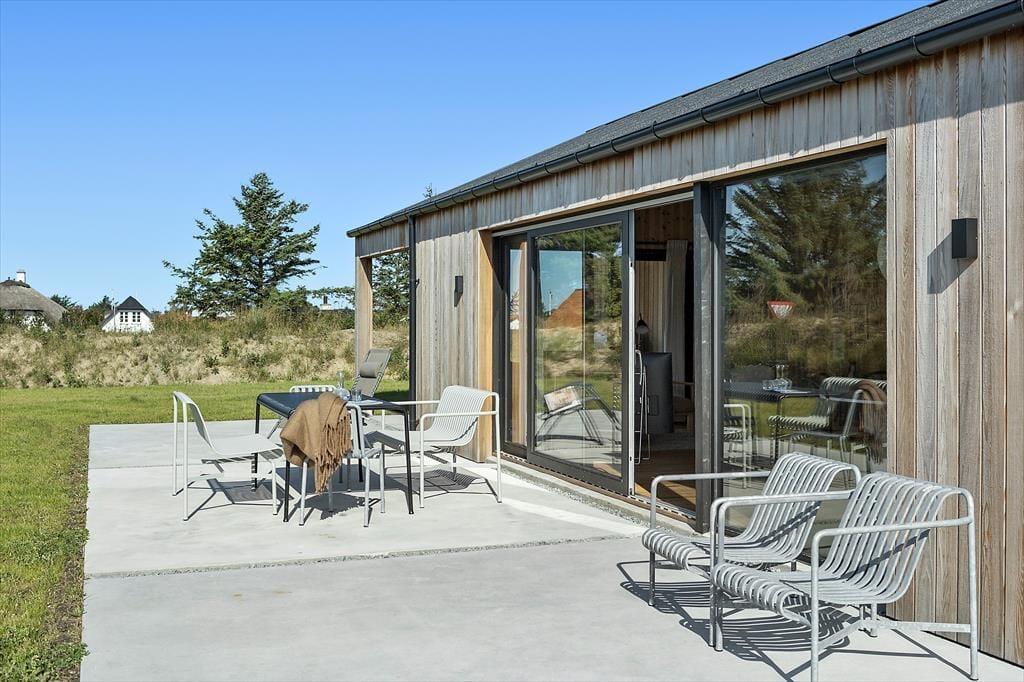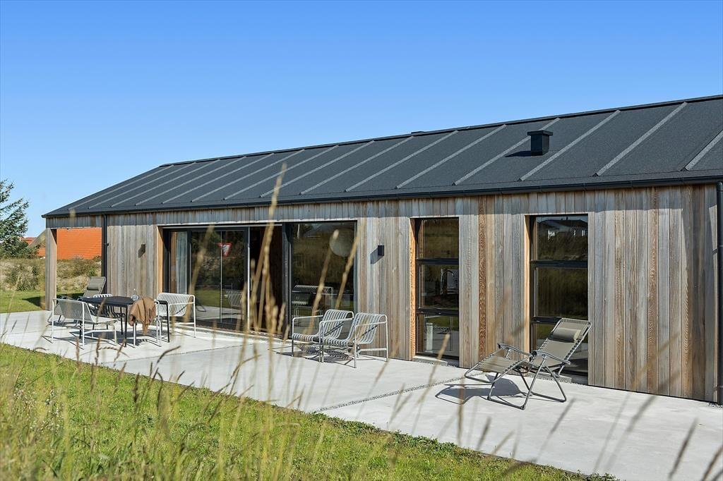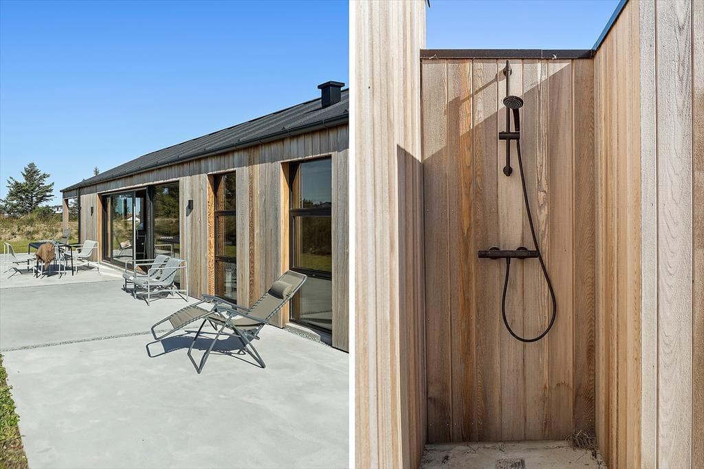 Die Zedernholzfassade des Ferienhauses wird durch große Fenster unterbrochen. Im Wohnzimmer bietet die Schiebetür einen direkten Zugang zur Terrasse mit einem großen und offenen Bereich, der sich nach Süden hin erstreckt. Im Westen erwartet Sie darüber hinaus ein überdachter Bereich, sodass Sie lange draußen sitzen und die Ruhe des Abends genießen können. Der Tag kann mit einem erfrischenden Morgenbad unter der Außendusche beginnen - natürlich können Sie diese auch nutzen, wenn Sie von Ihrem Strandausflug nach Hause zurückkehren.
