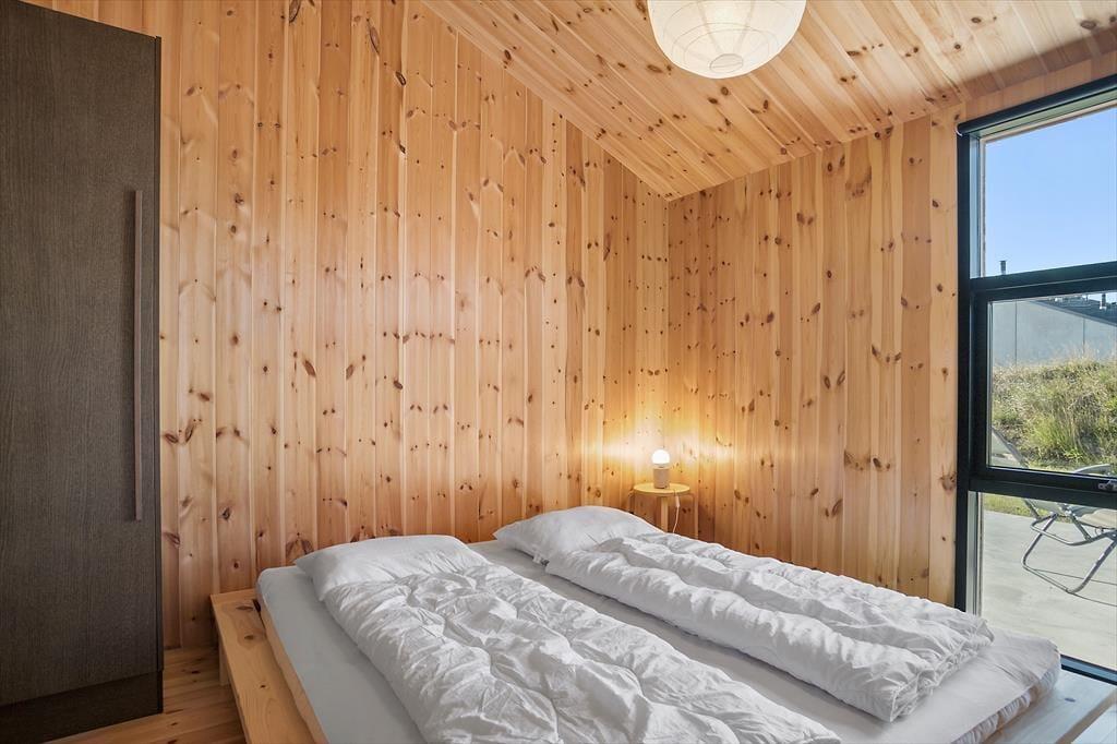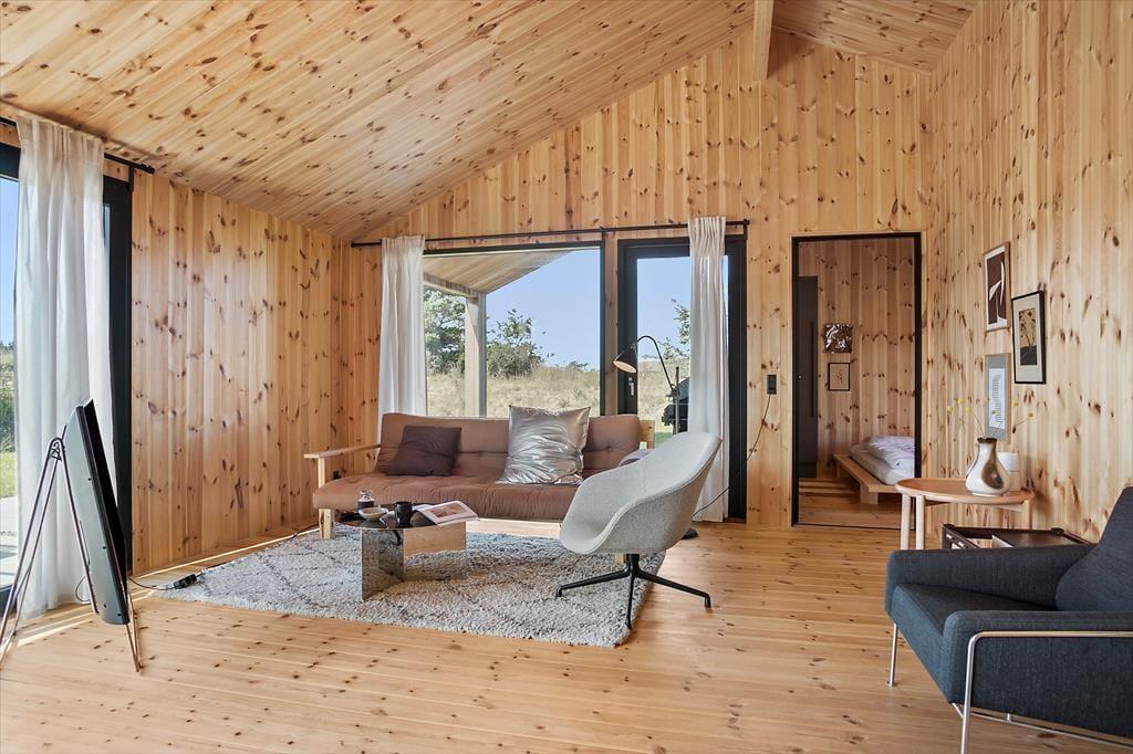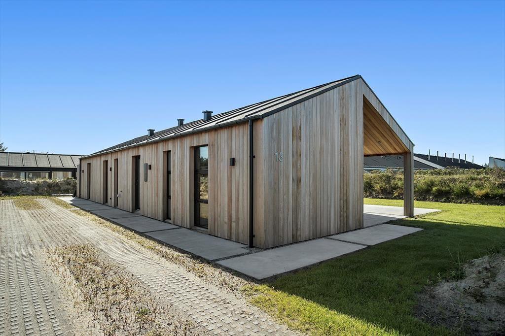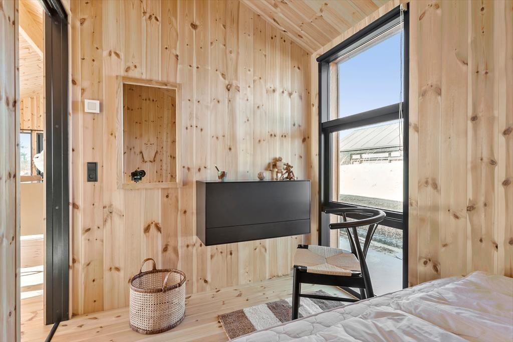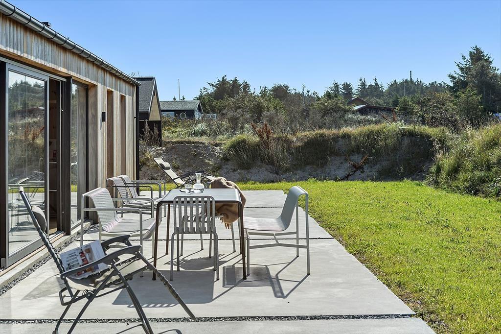 Die Zedernholzfassade des Ferienhauses wird durch große Fenster unterbrochen. Im Wohnzimmer bietet die Schiebetür einen direkten Zugang zur Terrasse mit einem großen und offenen Bereich, der sich nach Süden hin erstreckt. Im Westen erwartet Sie darüber hinaus ein überdachter Bereich, sodass Sie lange draußen sitzen und die Ruhe des Abends genießen können. Der Tag kann mit einem erfrischenden Morgenbad unter der Außendusche beginnen - natürlich können Sie diese auch nutzen, wenn Sie von Ihrem Strandausflug nach Hause zurückkehren.