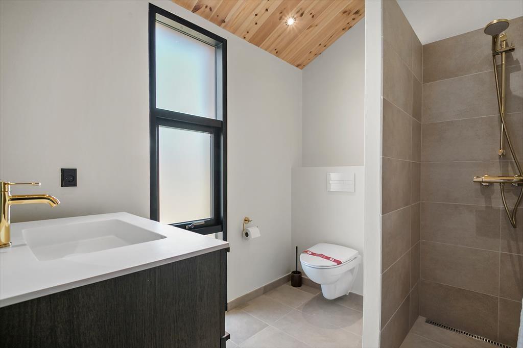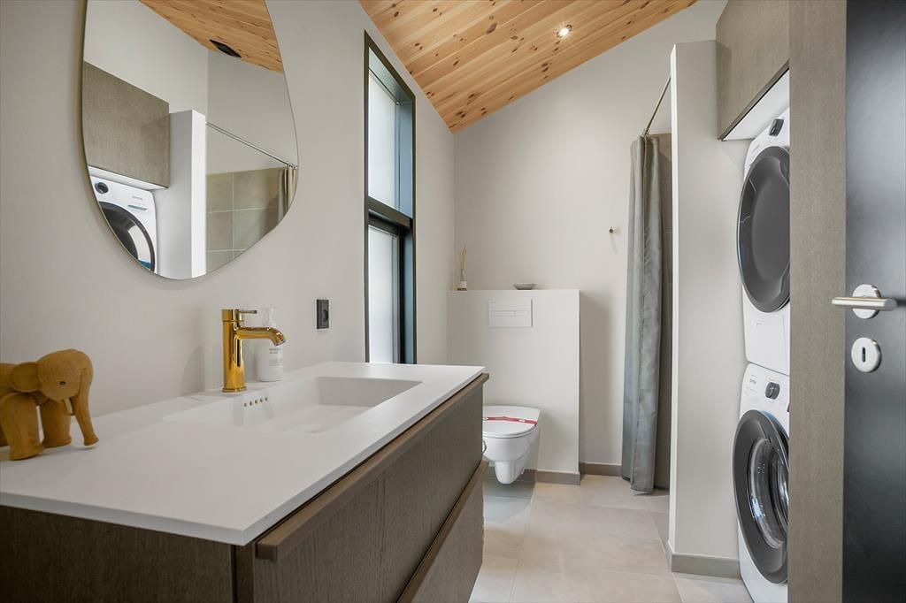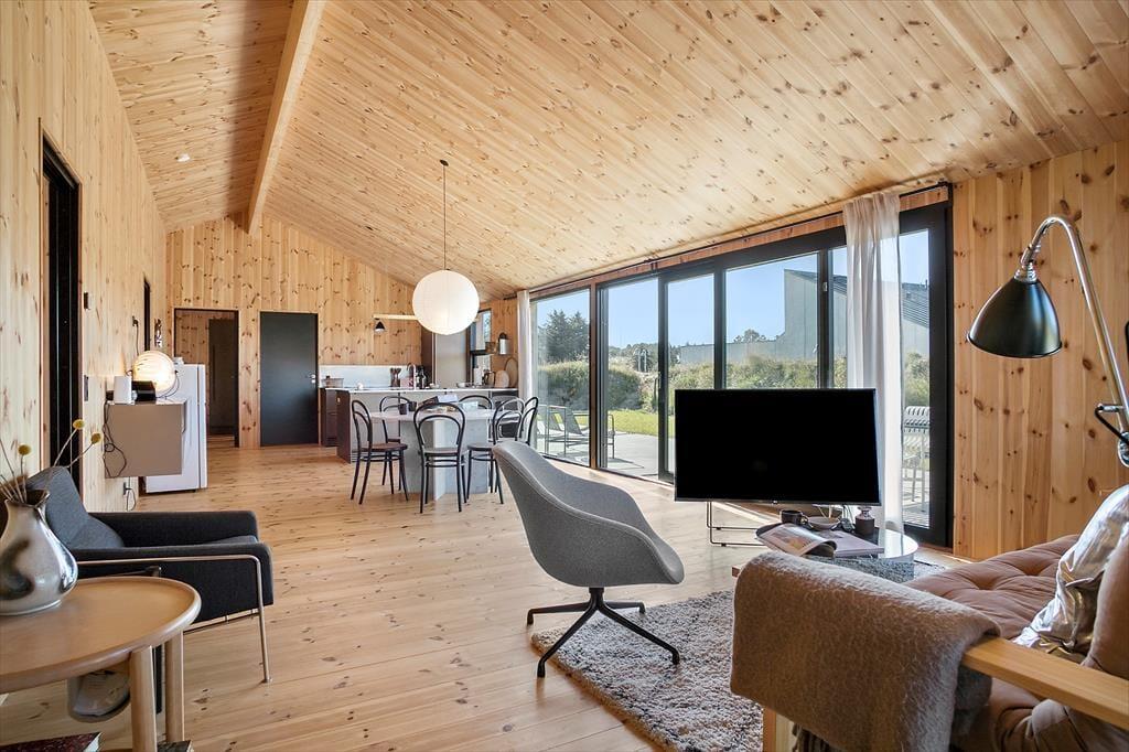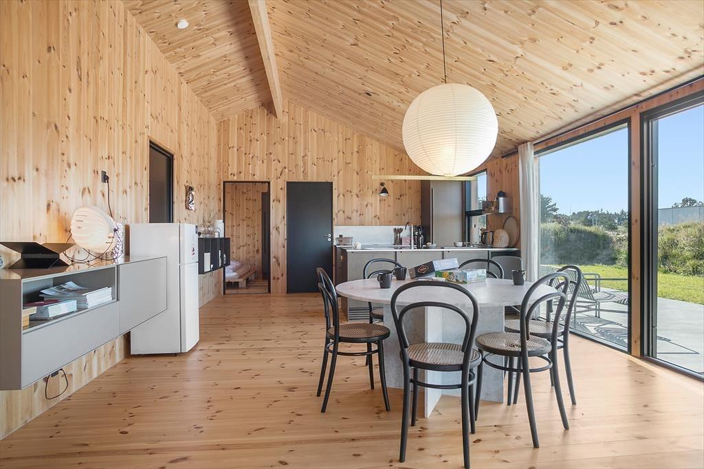 Die exquisite Auswahl an Materialien ist eines der wichtigsten Merkmale des 2022 erbauten, 110 m² großen Ferienhauses. Dunkle Astlöcher in den Paneelen sorgen für ein schönes Farbspiel an den ansonsten hellen Holzwänden und -decken. Der Duft der hier verarbeiteten Kiefer ist ein unsichtbares, aber wunderbares Detail. Das exklusive Interieur verleiht den hohen Räumen eine besondere Note und sorgt für ein angenehmes Wohngefühl - ob Sie nun auf der Sofalandschaft entspannen, in der offenen Küche kochen oder in den Doppelbetten der vier Schlafzimmer mal so richtig ausschlafen. Das Haus bietet Platz für bis zu acht Personen, wenn Sie also in größeren Gruppen reisen, ist es angenehm, dass Ihnen zwei Badezimmer zur Verfügung stehen. Beide sind mit einer Dusche ausgestattet, eines davon mit einer Waschmaschine und einem Wäschetrockner. Das Haus ist außerdem mit einem großen Flachbildfernseher mit Chromecast, einer schnellen Wi-Fi-Verbindung und anderen modernen Einrichtungen ausgestattet, die Sie während Ihres Urlaubs benötigen.