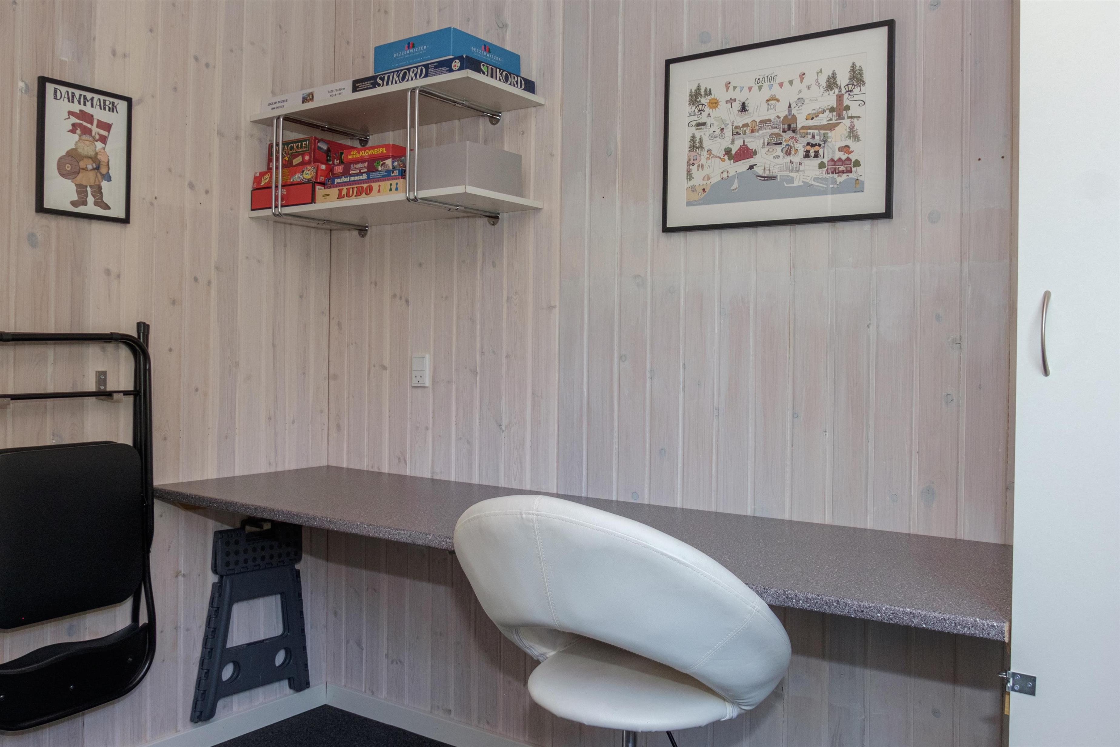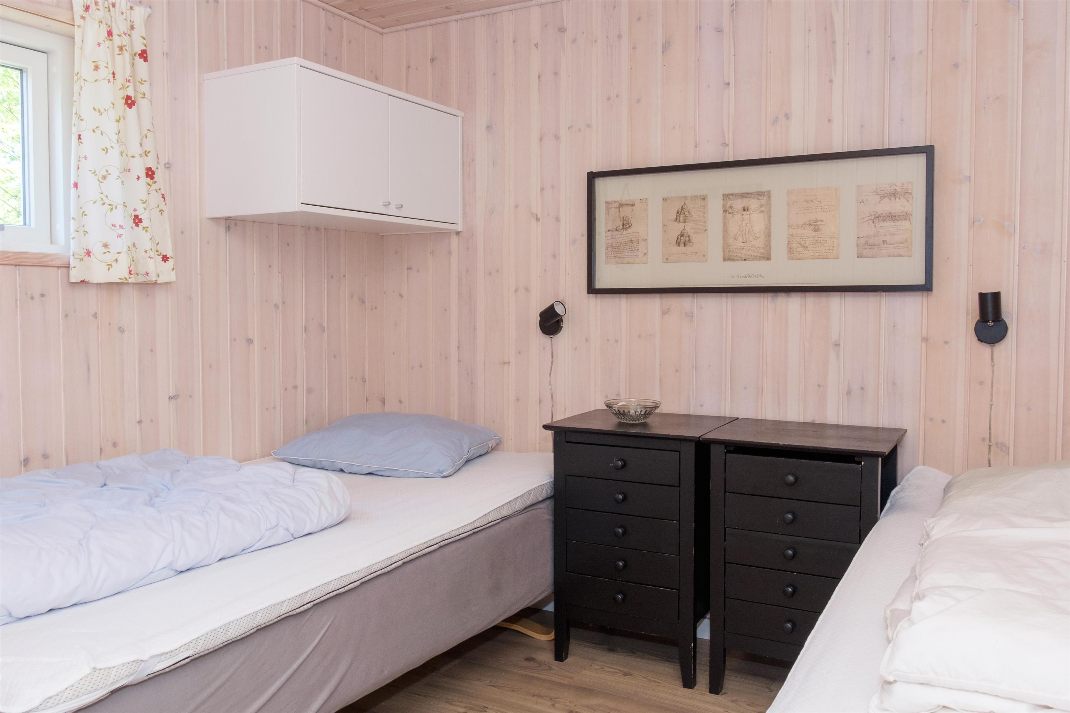 Bright and inviting living room with whitewashed walls and ceilings, in open connection with a newer, well-equipped kitchen. The living room has a comfortable sofa area and dining space for 5 people, as well as a TV with Danish (including TV2) and German channels. In the spacious kitchen, there are ceramic hobs, an oven, refrigerator/freezer, dishwasher, and microwave. The house has 1 bedroom with 2 single beds, 1 room with a 1½ person bed, and a room in the annex with 2 single beds, totaling 5 sleeping places. Neat bathroom with a shower. In the entrance hall, there is a washing machine. Internet access is available.