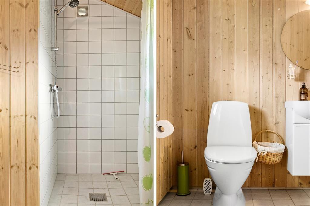 Badeværelse med toilet, håndvask og bruseniche.