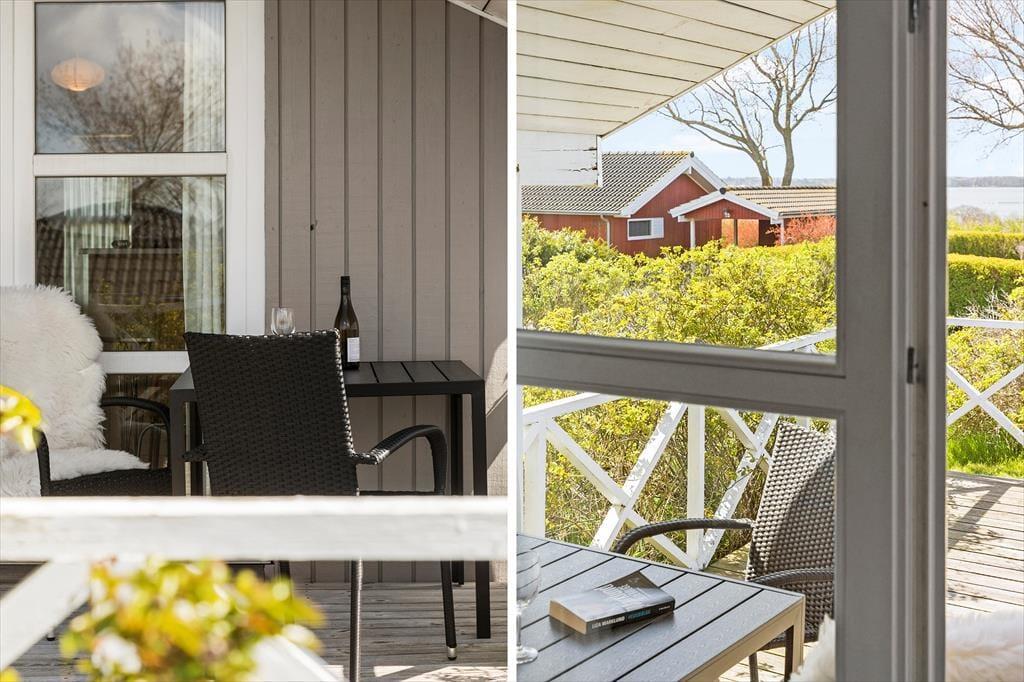 På terrassen kan man sidde og nyde udsigten over Grønsund, Bogø Færgen eller den