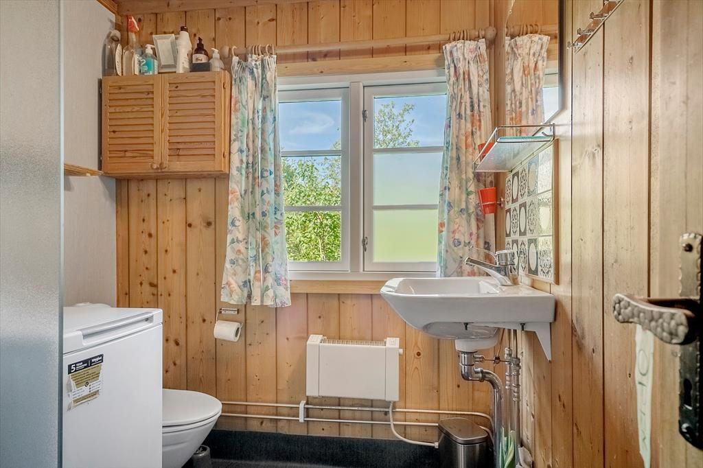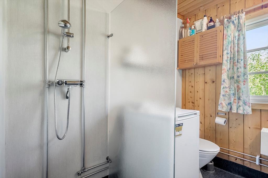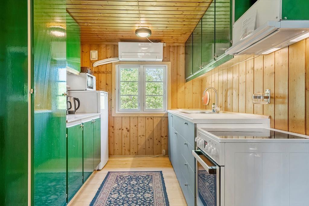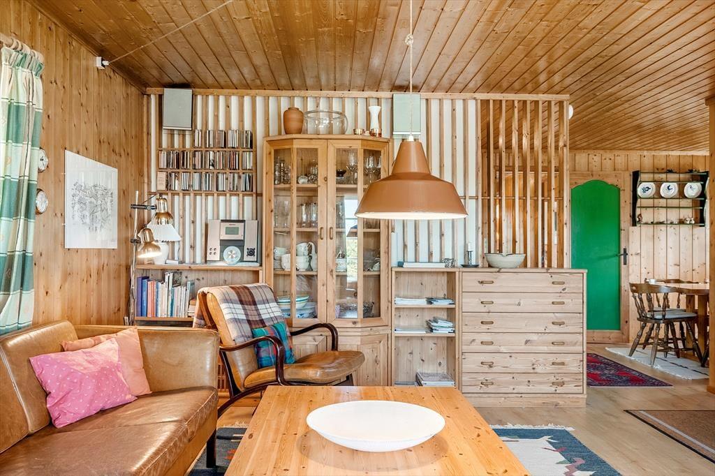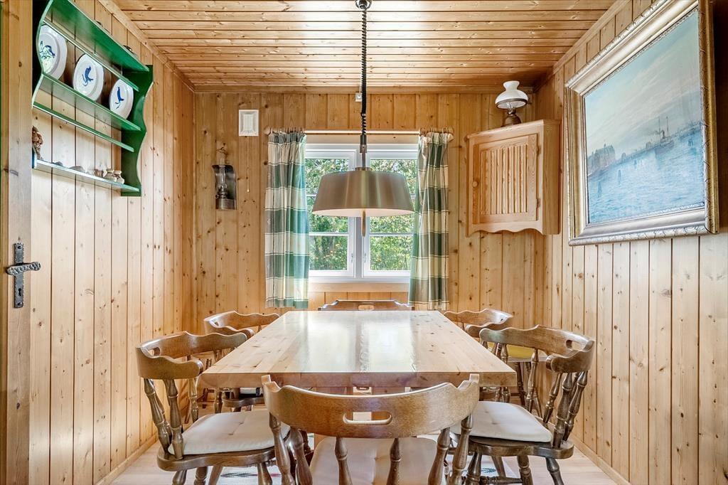Hier können Sie Ruhe und Frieden einkehren lassen und in den gemütlichen und einladenden Zimmern gemeinsam Ihren Urlaub genießen. Es gibt Platz für 4 Erwachsene und das Haus verfügt über eine Küche mit offener Verbindung zum Wohnzimmer, das mit einer guten Essecke und Sofagruppe sowie einem Fernseher und Wärmepumpe ausgestattet ist. Vom Wohnzimmer aus hat man einen Blick auf die alte Mühle auf Bogø. In der Küche können Sie die Mahlzeiten des Tages zubereiten und diese draußen auf der gemütlichen, überdachten Terrasse genießen. Es gibt 3 Zimmer, 1 mit einem Doppelbett und 2 mit einem Einzelbett. Hier können Sie sich zurückziehen und ein Nickerchen machen oder ein gutes Buch lesen. Das Sommerhaus verfügt über ein gutes und funktionelles Badezimmer mit Toilette, Waschbecken und Dusche, sowie einer von oben bedienbaren Waschmaschine.