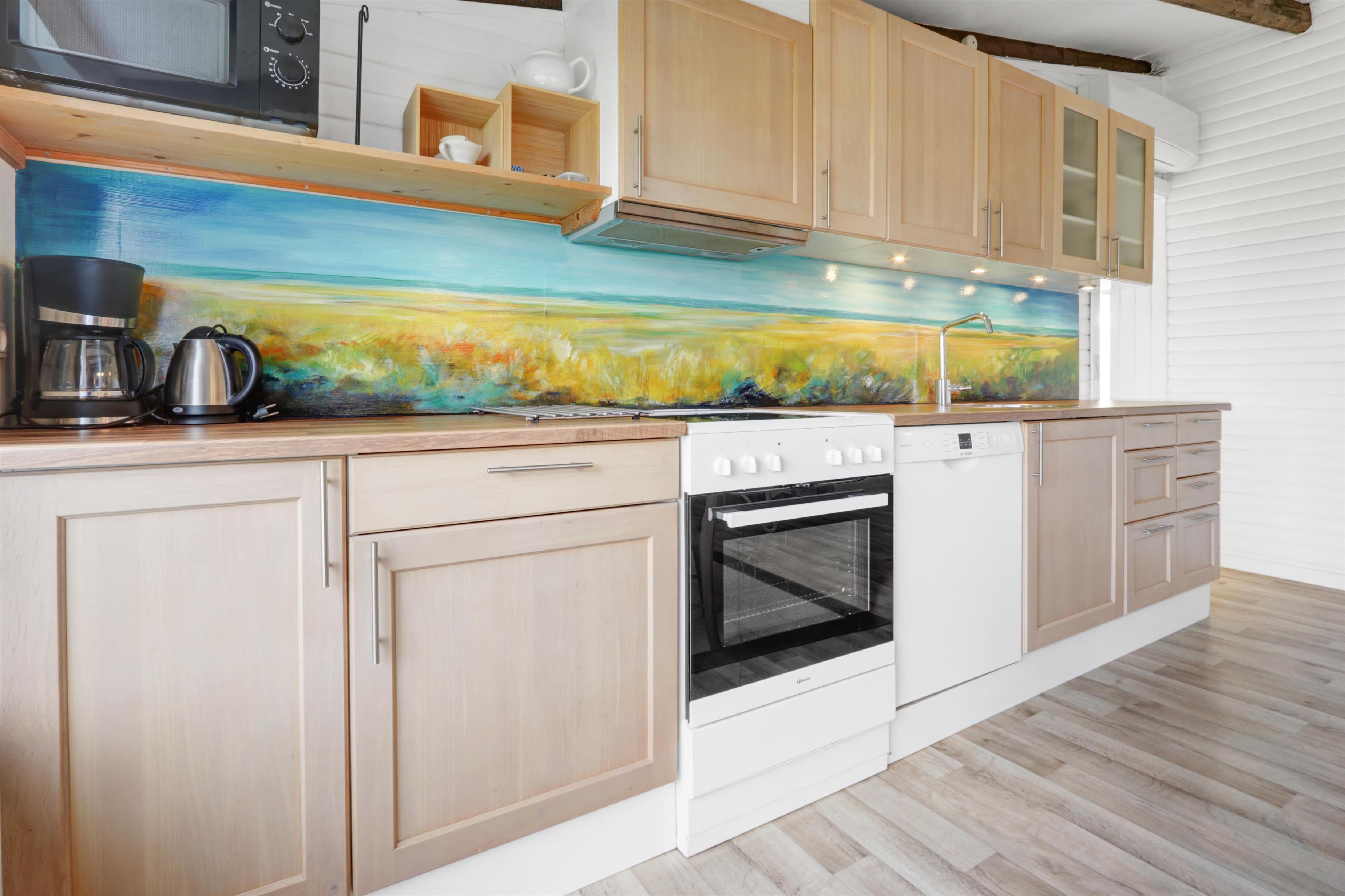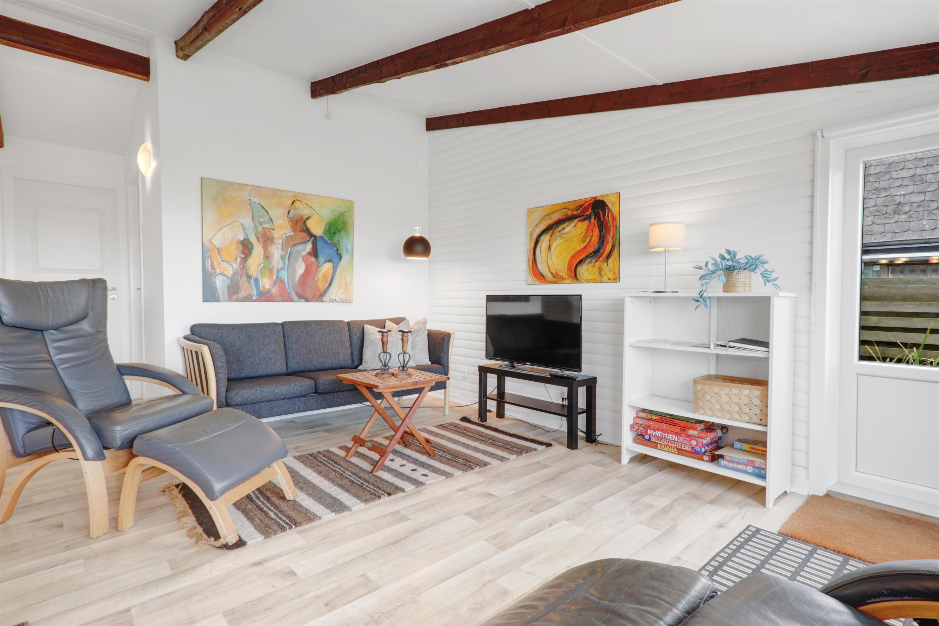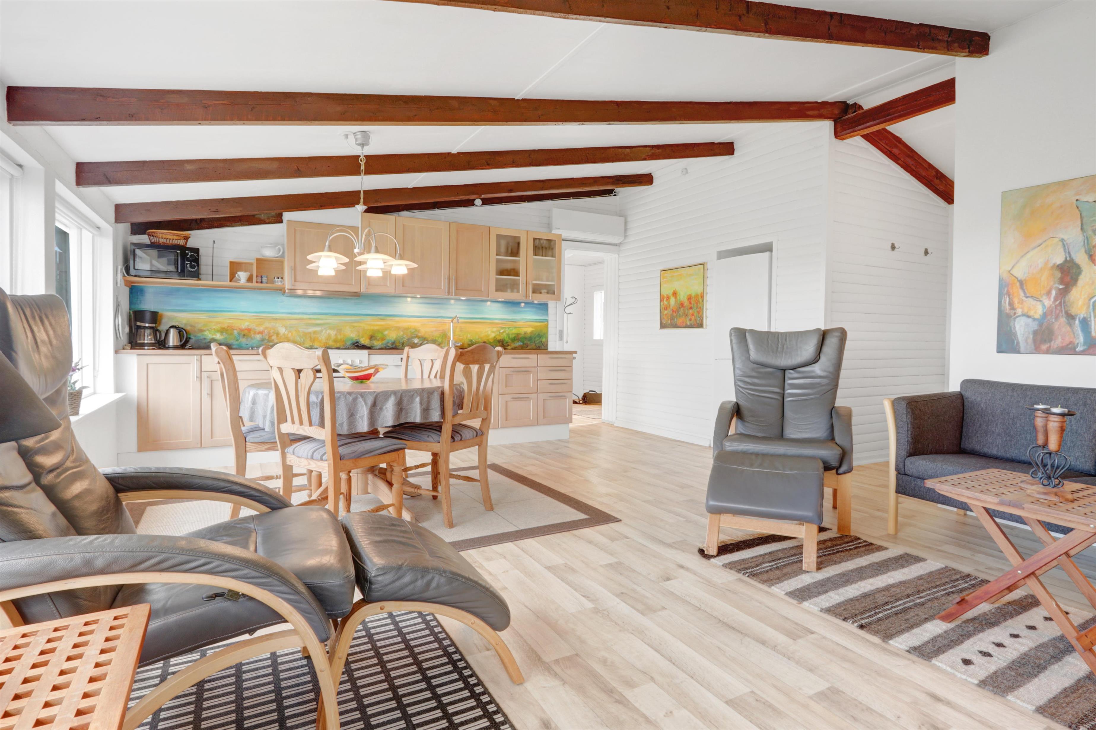 Die Küche ist vollständig ausgestattet mit einem Elektro-Keramikherd, Geschirrspüler, Kühlschrank, Mikrowelle und Dunstabzugshaube – perfekt sowohl für schnelle Mahlzeiten als auch für gemeinsames Kochen. Im Wohnbereich können Sie sich auf komfortablen Leder- und Polstermöbeln entspannen und dänische sowie deutsche TV-Sender genießen.