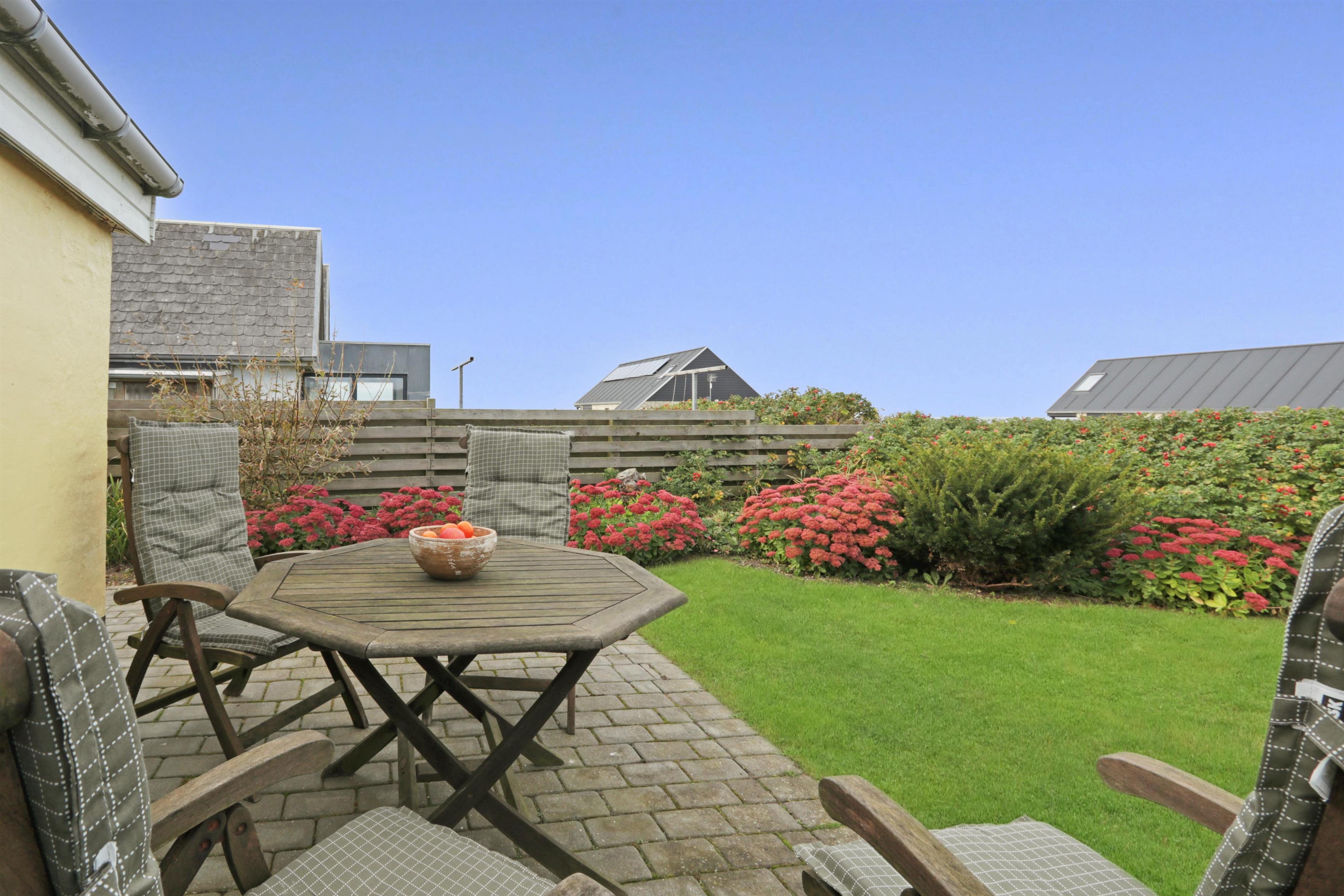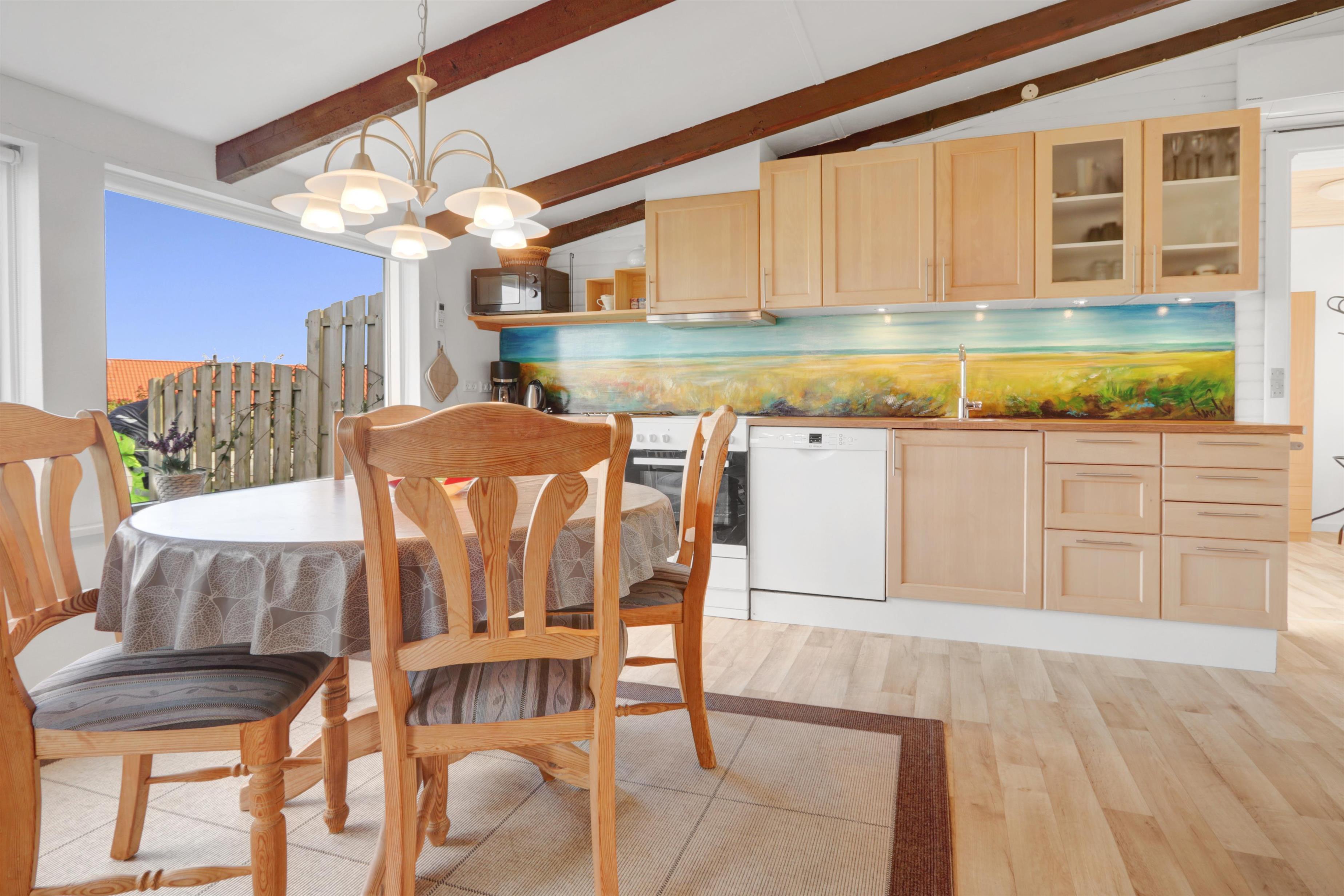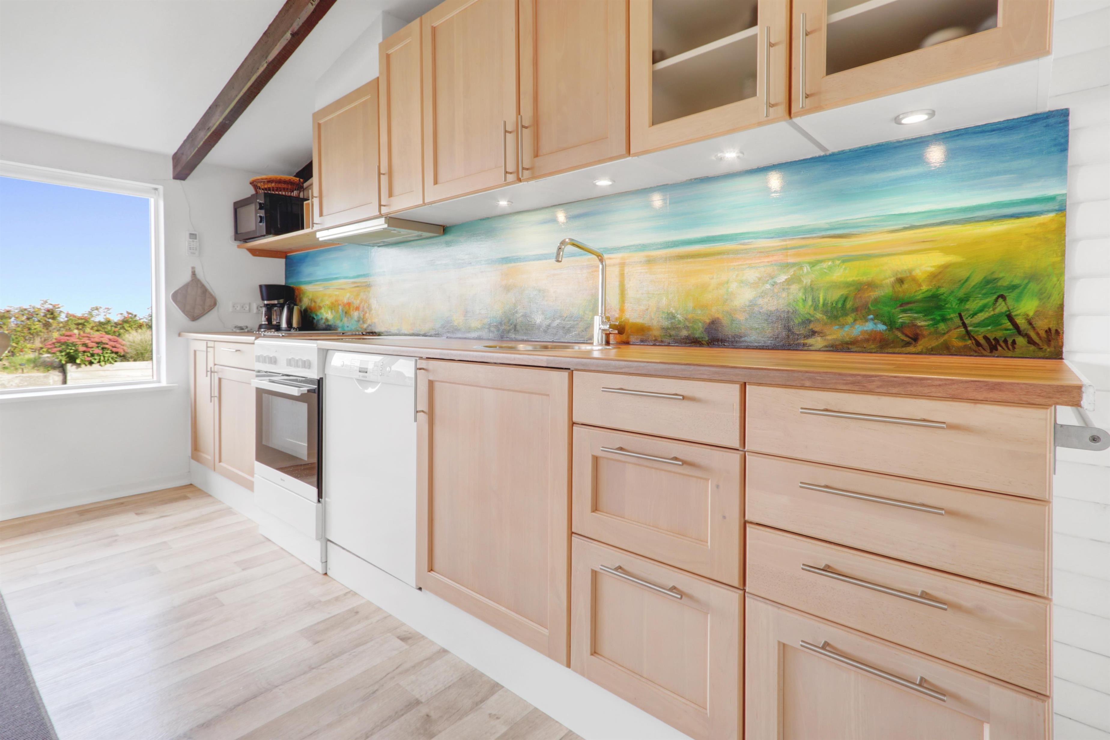 Die Küche ist vollständig ausgestattet mit einem Elektro-Keramikherd, Geschirrspüler, Kühlschrank, Mikrowelle und Dunstabzugshaube – perfekt sowohl für schnelle Mahlzeiten als auch für gemeinsames Kochen. Im Wohnbereich können Sie sich auf komfortablen Leder- und Polstermöbeln entspannen und dänische sowie deutsche TV-Sender genießen.