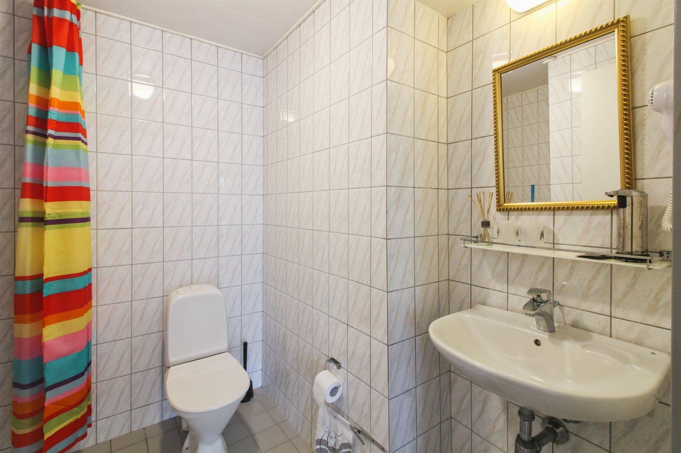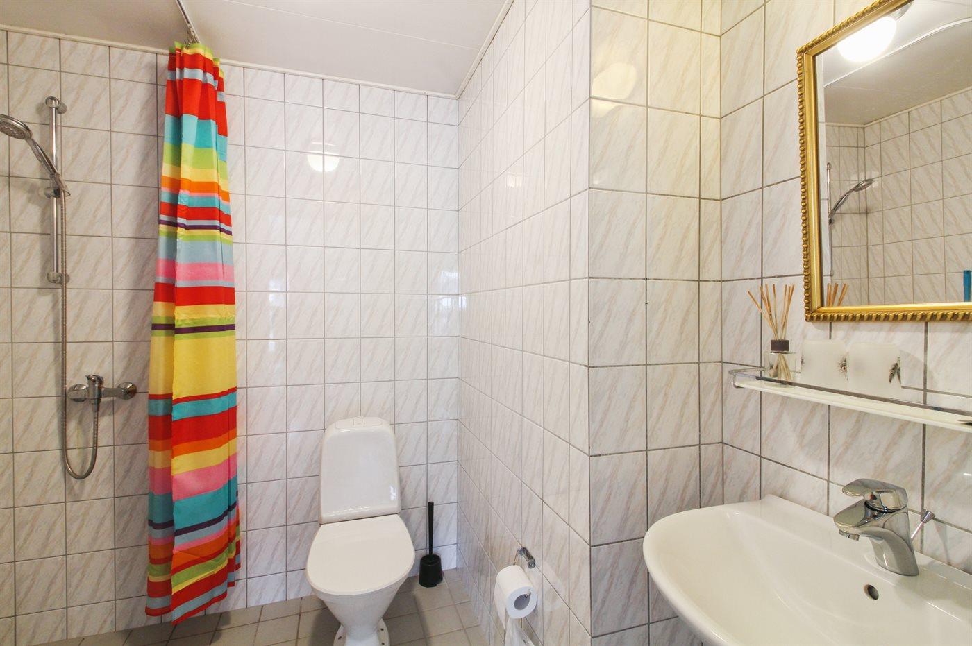 There is 1 bathroom with shower and 1 toilet.