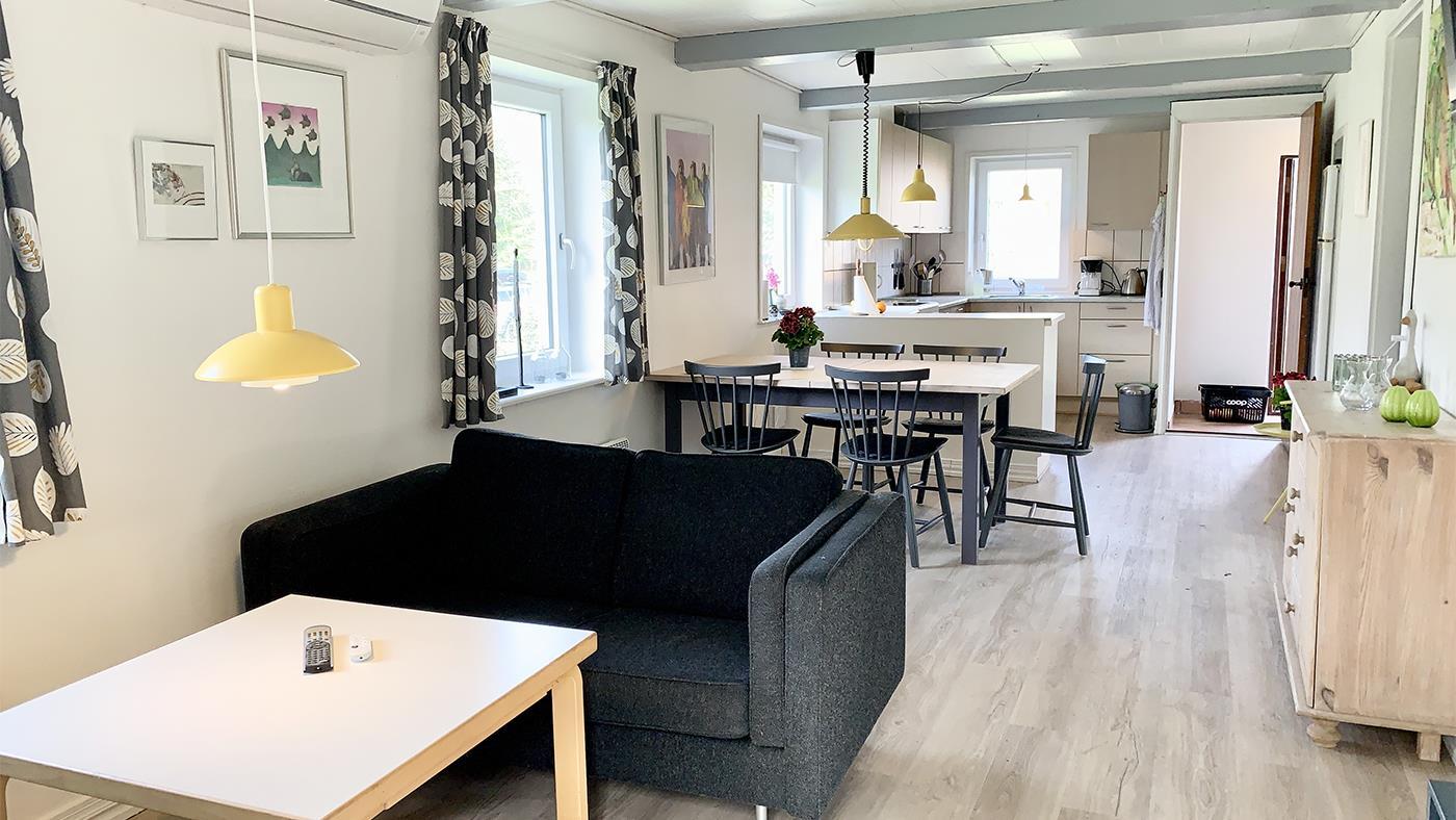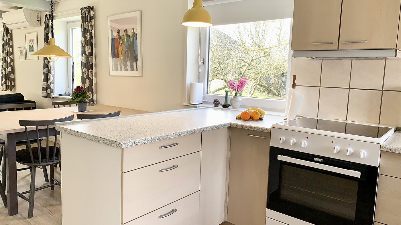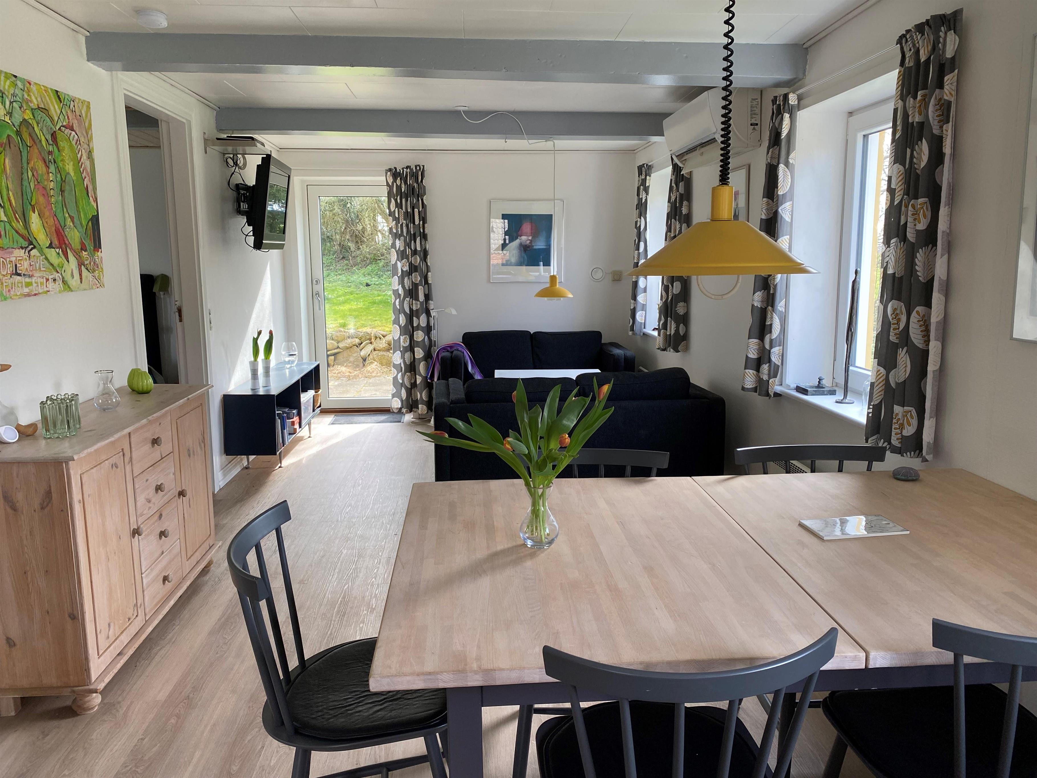 The house exudes summer atmosphere and personality. Inside, you are greeted by a bright and inviting living area, where the kitchen, dining area and living room merge into one cosy common room. The kitchen is well equipped with everything you need for your holiday – here you can easily prepare meals together while conversation and laughter flow around the dining table.