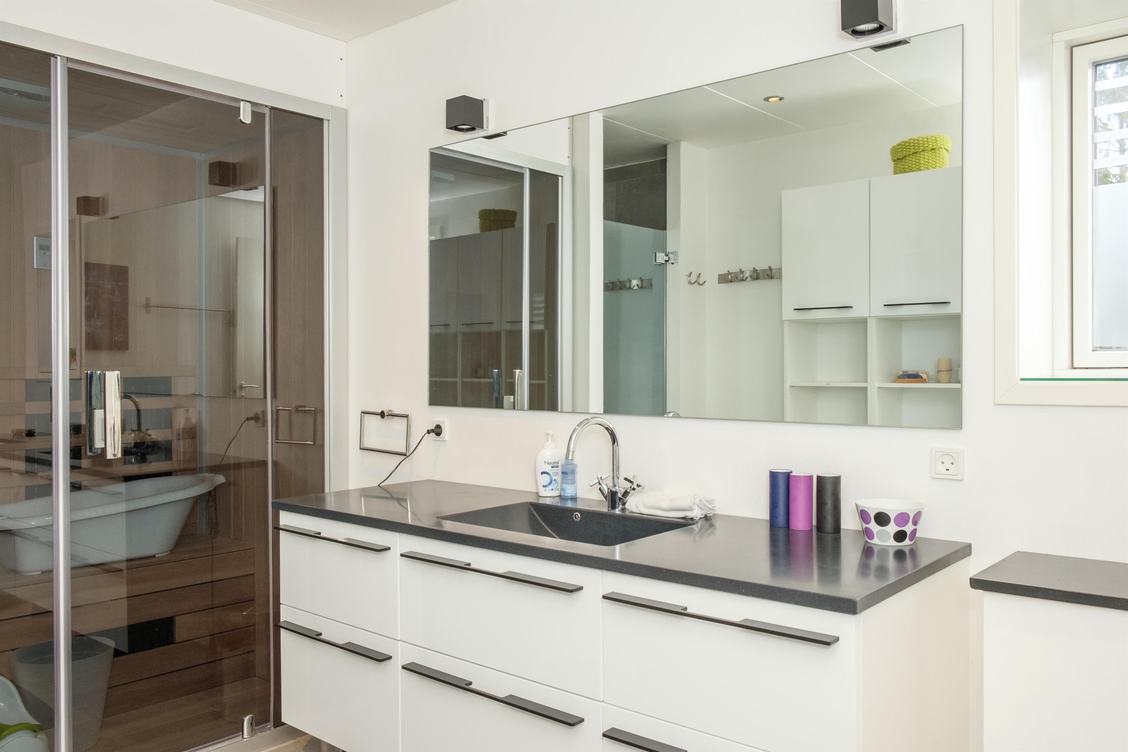 This spacious and almost new holiday home is situated high on a lovely, wooded natural plot in eastern Ebeltoft with a sea view of Ebeltoft Vig. A truly beautiful and well-designed house, which is also energy-efficient. There is an open and covered terrace as well as a balcony on the 1st floor with garden furniture, sun loungers, parasol, and grill.