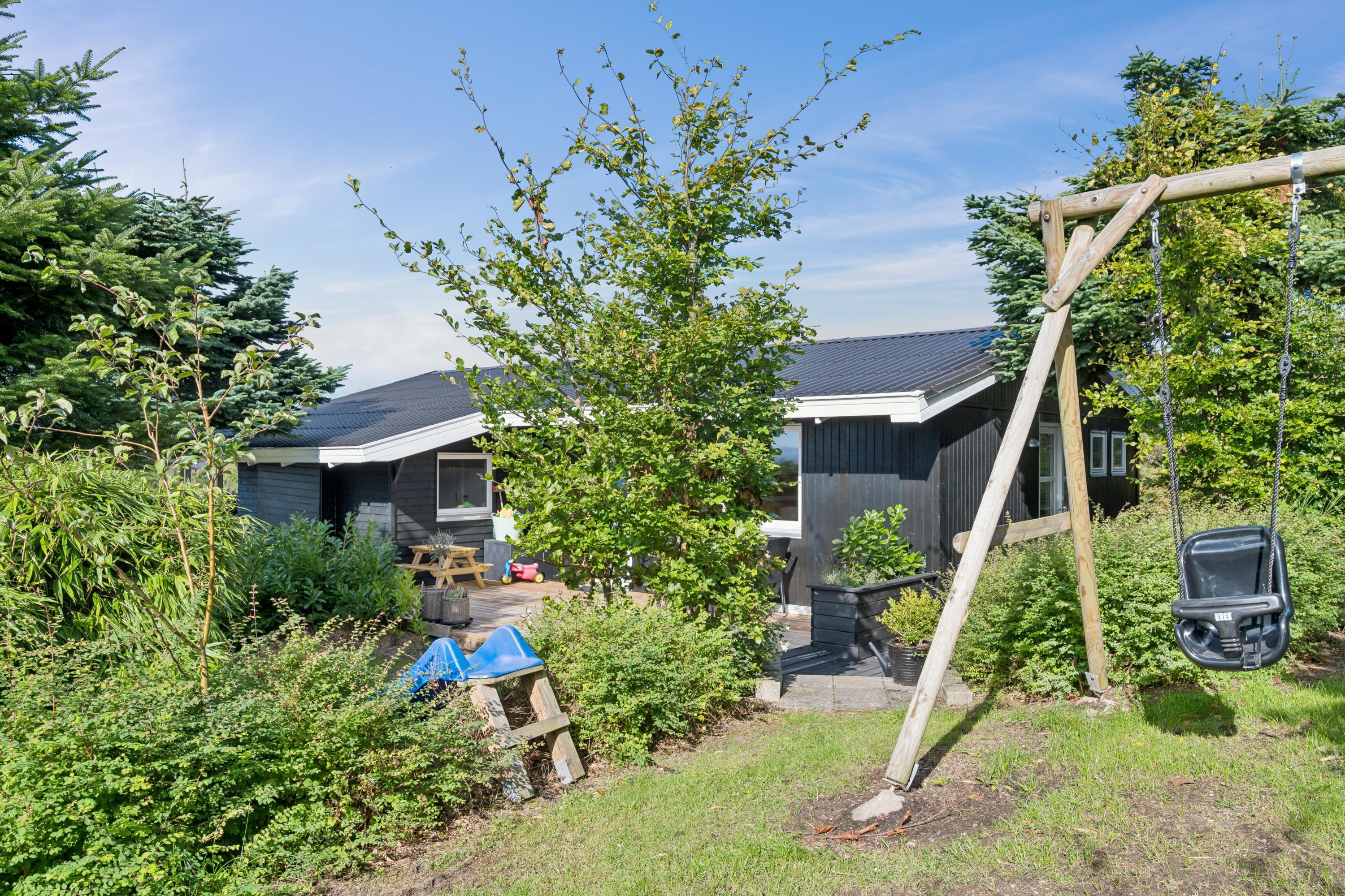 The house offers sleeping accommodation in three good bedrooms. For younger holiday guests, a highchair and cot are available. The property is elevated on a well-kept plot with a large lawn. Several sheltered terraces with garden furniture invite you to relax, while children will enjoy the swings, sandbox, and slide. If you are travelling with more families who wish to stay close to each other, five additional houses on the same street are available for rent.