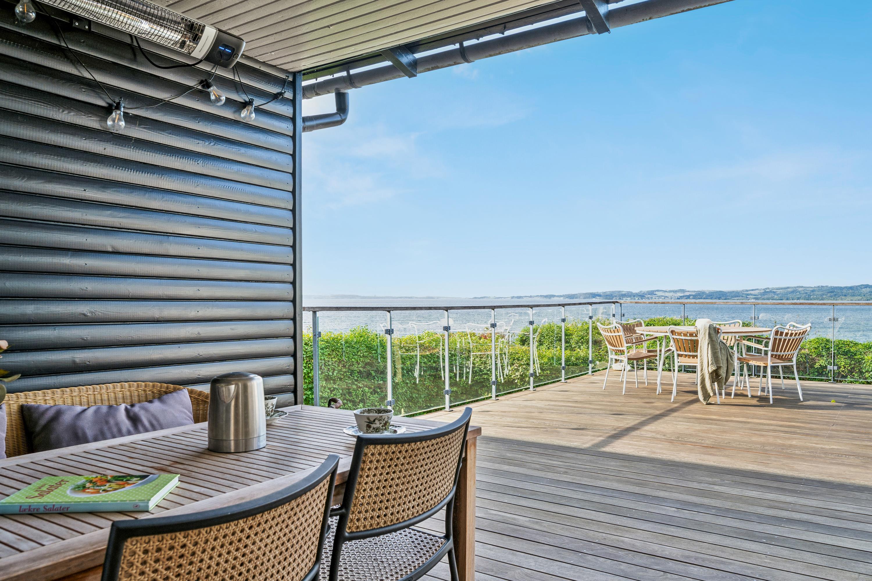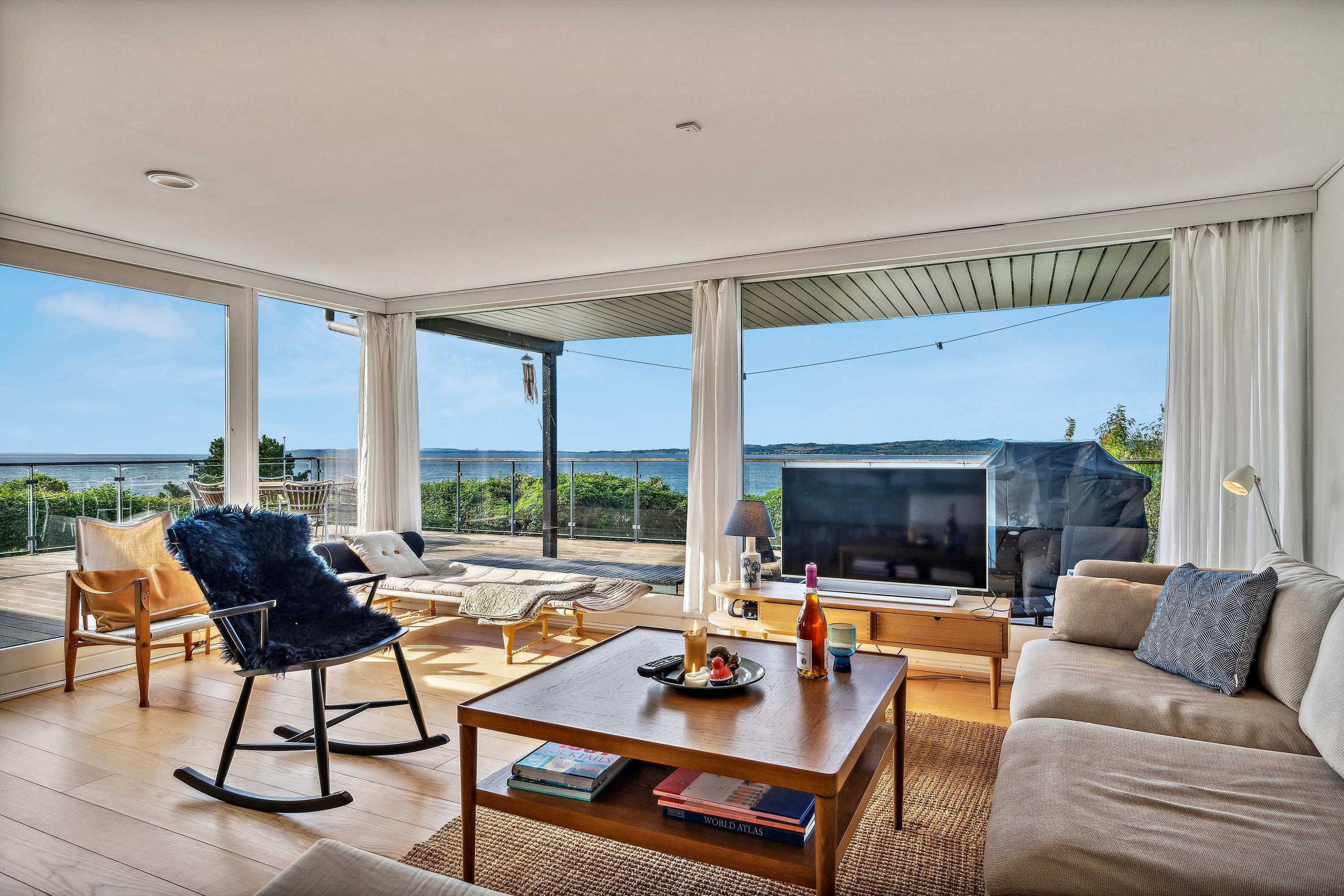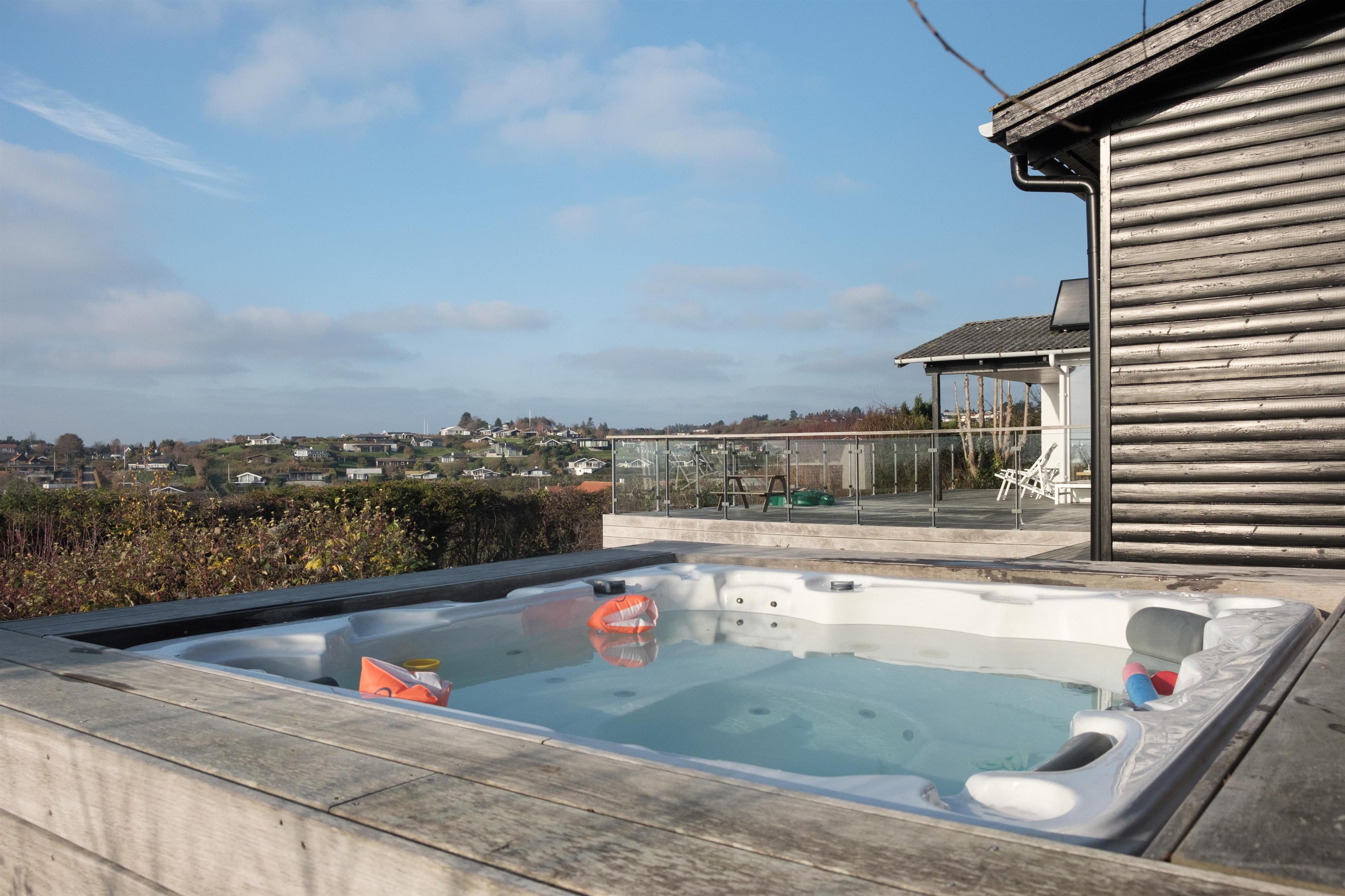 On an elevated natural plot with panoramic views over Ebeltoft Vig, this spacious and well-maintained house stands out as modern and luxurious after a complete renovation in 2011, showcasing quality materials and attention to detail. The house is surrounded by a lovely, sheltered wooden terrace, partially covered, with a large outdoor spa from which you can enjoy the view. It includes quality outdoor furniture, sun loungers, and a grill.