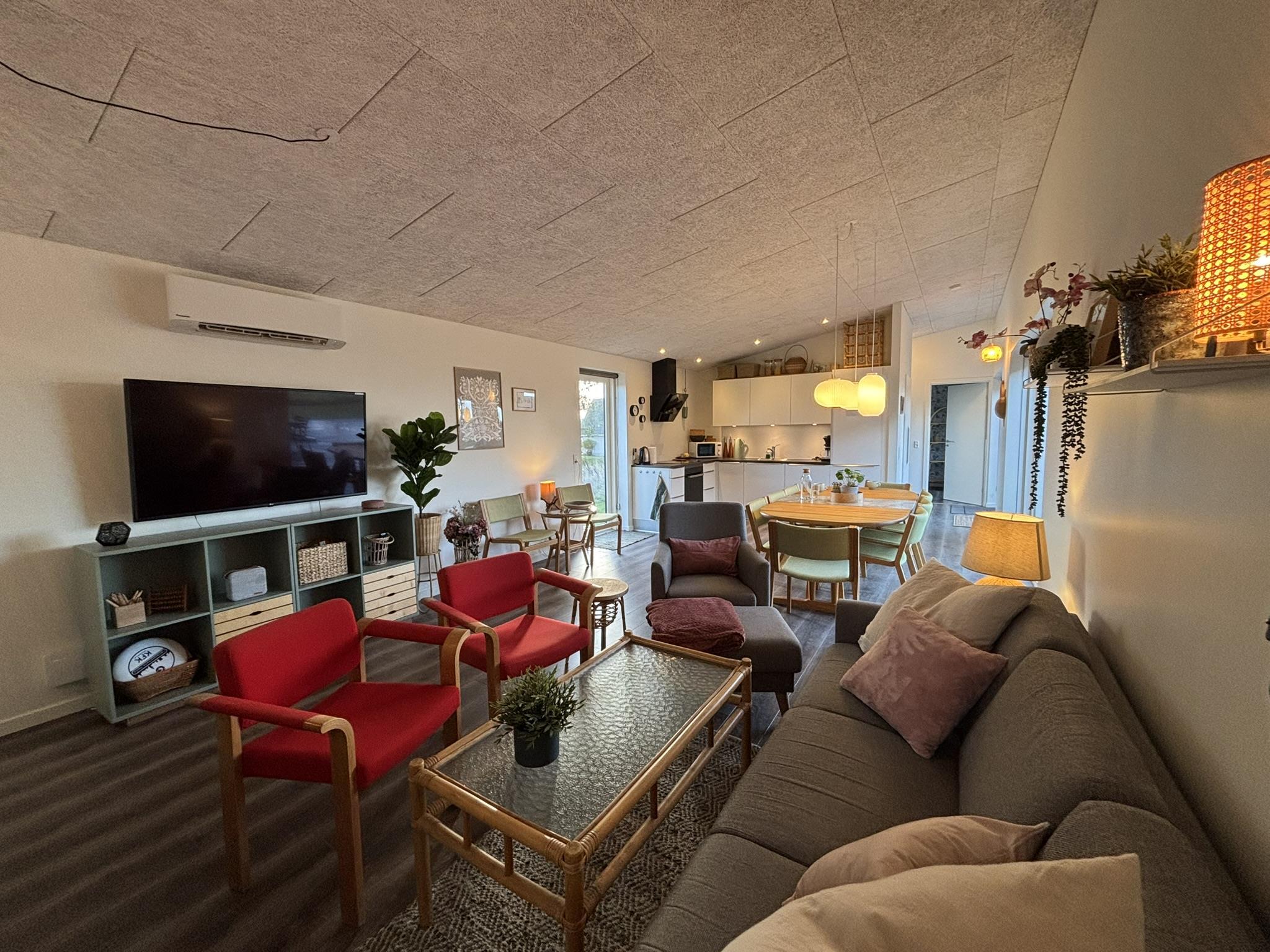 This spacious holiday home, accommodating up to 10 people, is situated on a large natural plot in the attractive Egsmark area north of Ebeltoft, close to a child-friendly sandy beach with a bathing jetty leading out to Ebeltoft Vig. The house is surrounded by a large southwest-facing wooden terrace furnished with outdoor furniture, sun loungers, a parasol, and a grill.