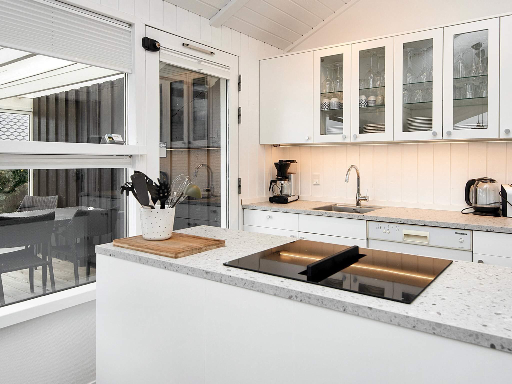 Das Ferienhaus ist mit komfortablem Mobiliar gut ausgestattet und hat einen offenen Küchen-/Wohnbereich für das Familienleben, inklusive Holzofen für kühlere Tage und Essbereich. Die überwiegend bodentiefen Fenster sorgen für viel Tageslicht und zugleich guten Ausblick.