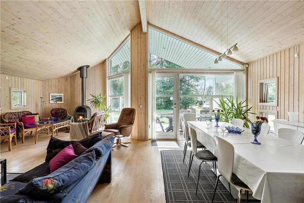Im hellen Wohnraum mit hohen Decken sorgen große Fenster vor der Terrasse für freien Blick in den Garten. Der lange Esstisch bietet ausreichend Platz für alle Mitreisenden. Der Esstisch ist direkt neben der offenen Küche platziert, sodass das Servieren der Mahlzeiten zum Kinderspiel wird. Mit zwei Polstersitzgruppen bieten sich dir und deinen Lieben viele Möglichkeiten für ruhige, entspannte Momente - beispielsweise mit dem Strickzeug, mit einem spannenden Buch oder auch mit einem Karten- oder Brettspiel. Ganz gleich, ob ihr mit einer befreundeten Familie, einem befreundeten Paar oder auch mit mehreren Generationen anreist, ihr werdet euch in diesem Ferienhaus alle im Nu heimisch und wohlfühlen. Beachte bitte, dass der Zugang zum Schlafboden sehr steil ist.