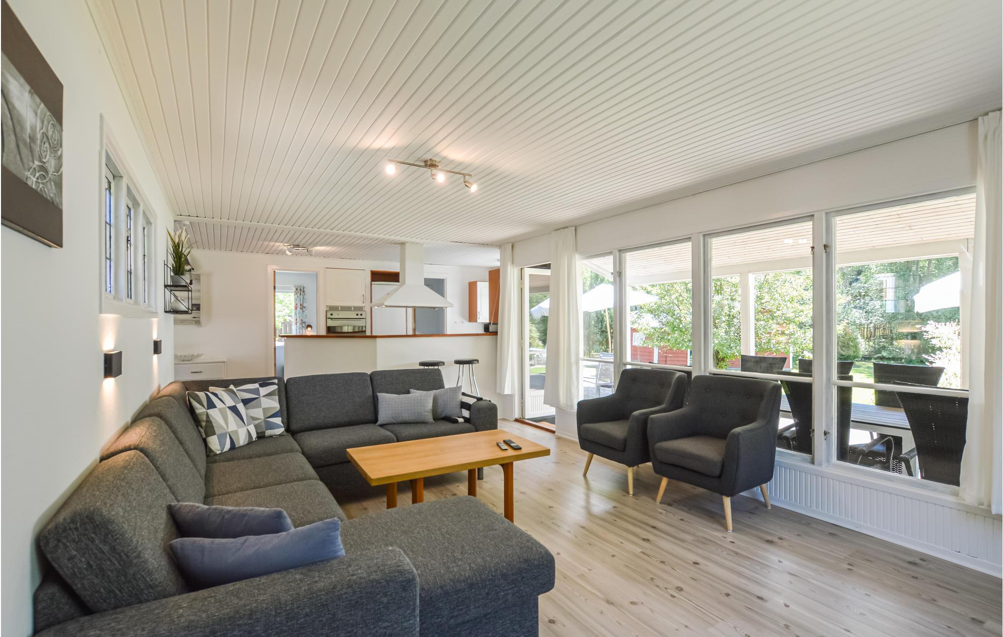 Großes Ferienhaus mit Sauna und vier Schlafzimmern, schöner Küche, die zum Ess- und Wohnzimmer offen ist.