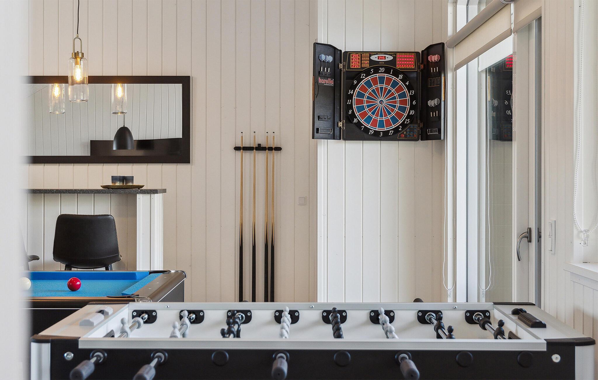 Das Ferienhaus selbst bietet dank des offenen Wohn- und Essbereichs eine einladende Atmosphäre für gemeinsame Abende. Die umfangreiche Ausstattung des Hauses sorgt dafür, dass keine Wünsche offenbleiben. Entspannen Sie sich in der Sauna, genießen Sie den Außen-Whirlpool oder erfrischen Sie sich im Außenpool im Garten. Für unterhaltsame Stunden für Groß und Klein gibt es einen Aktivitätsraum mit Tischtennis, Billard und Tischfußball. Im Garten warten zudem ein Trampolin und eine Schaukel auf die jüngeren Gäste.
