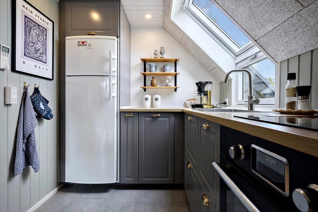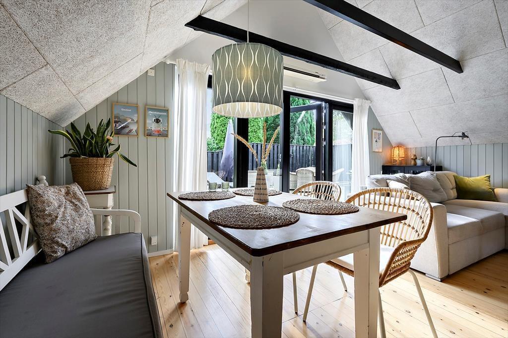 Genieße das Leben im Freien: Das Haus liegt auf einem 700 m² großen, sonnigen Grundstück in der Nähe des Fjords, wo Sie einen aktiven Urlaub mit Aktivitäten wie Kajakfahren und Surfen verbringen können. Die große Terrasse lädt zu Entspannung, Ruhe und gemütlichen Stunden ein.