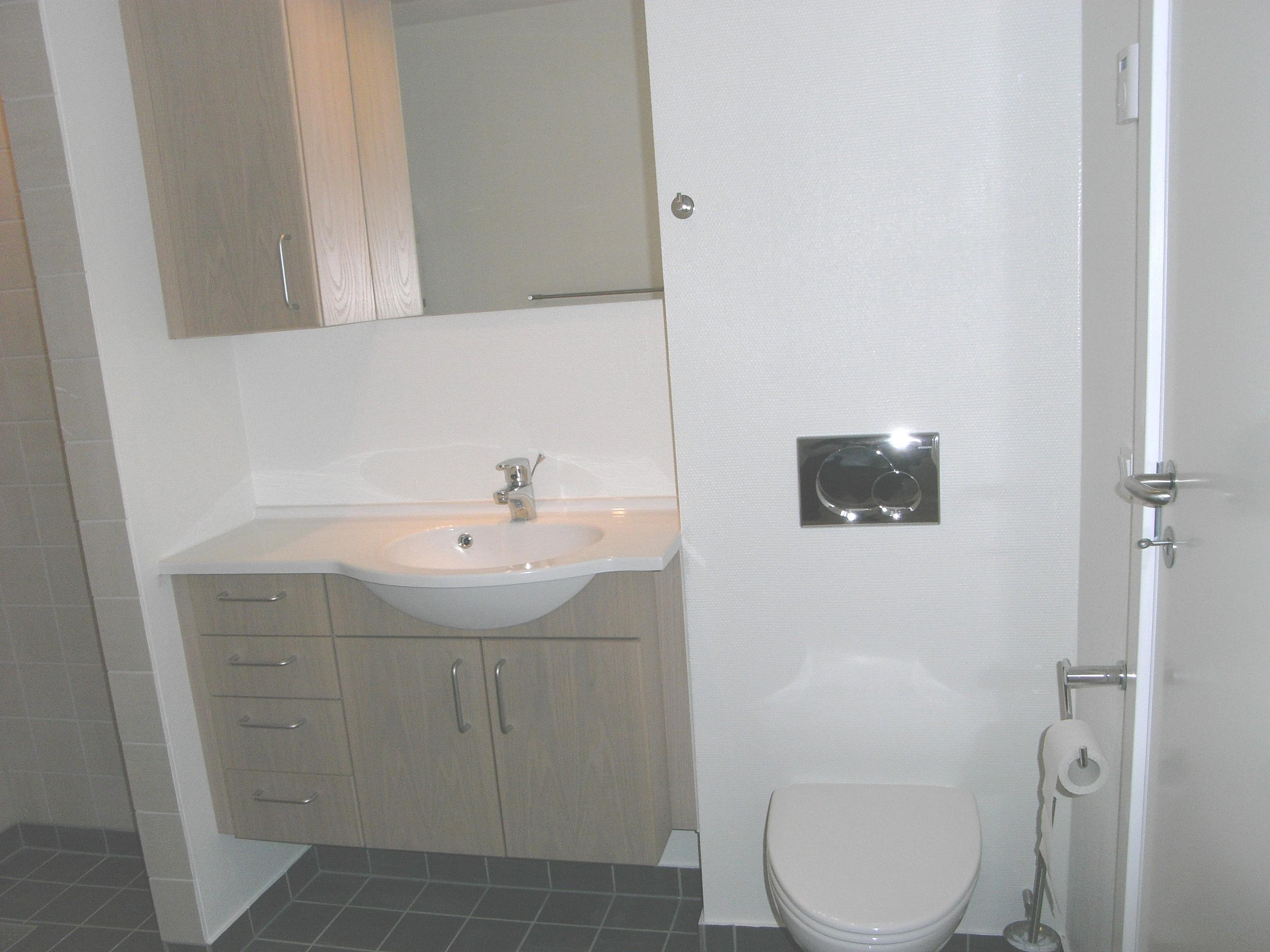 Beautiful bathroom with underfloor heating, washing machine and dryer, shower, sink and toilet.