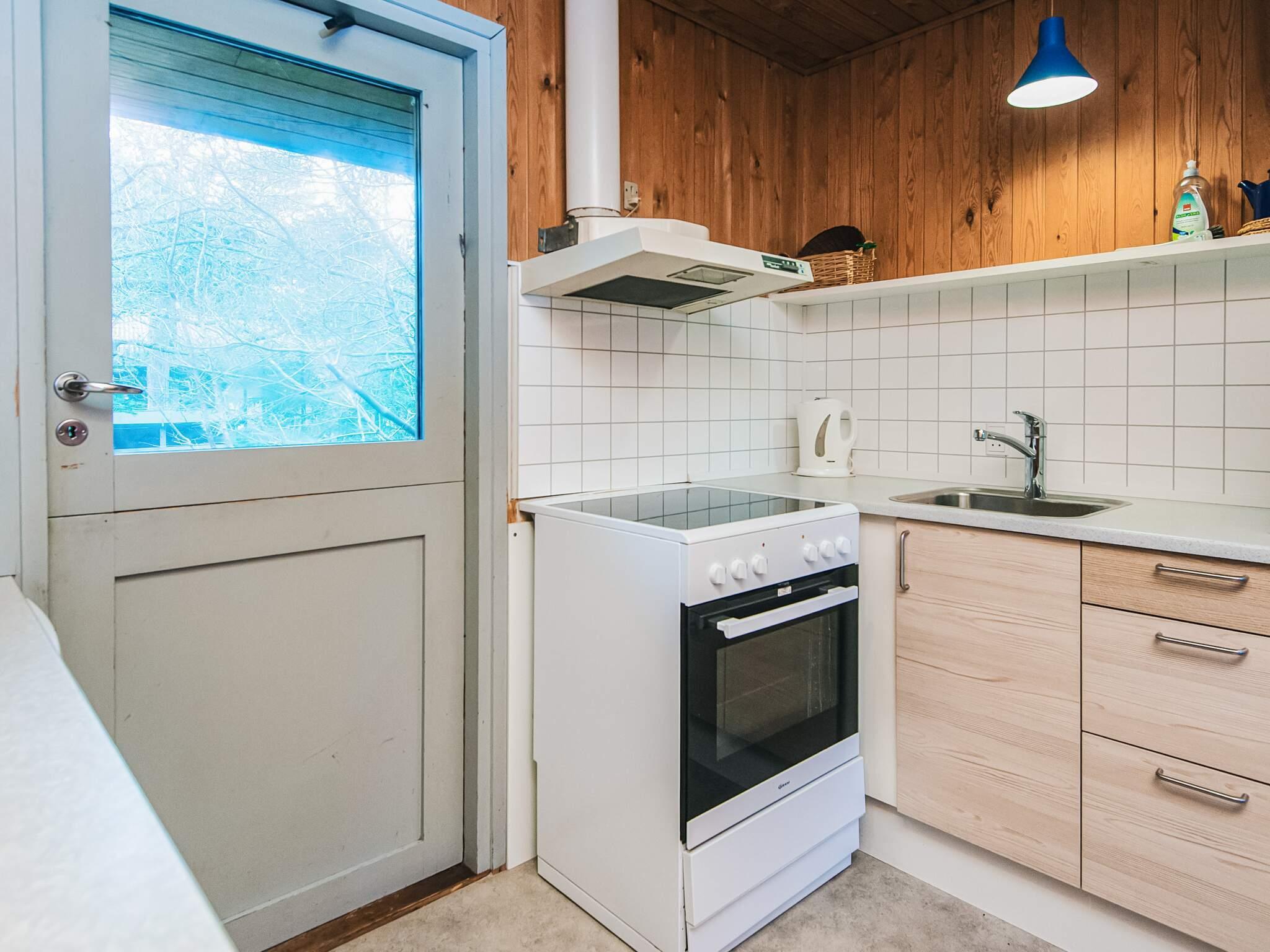 Küche: Eine einfache aber gut ausgestattete Küche mit Elektroherd, Gefrierschrank mit Gefrierfach und Kaffeemaschine für Ihren täglichen Komfort.
