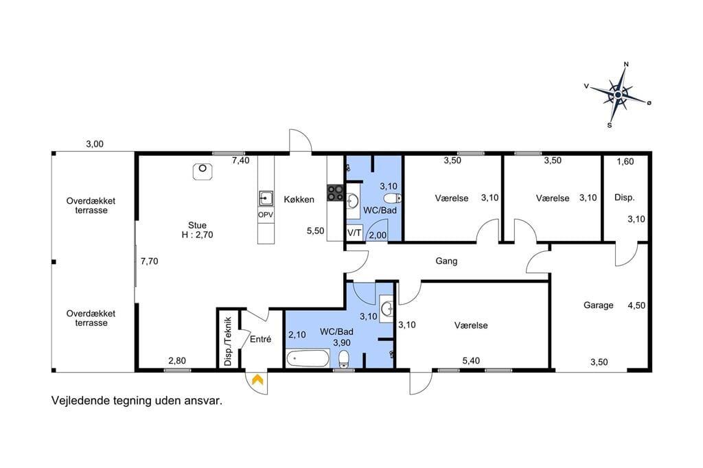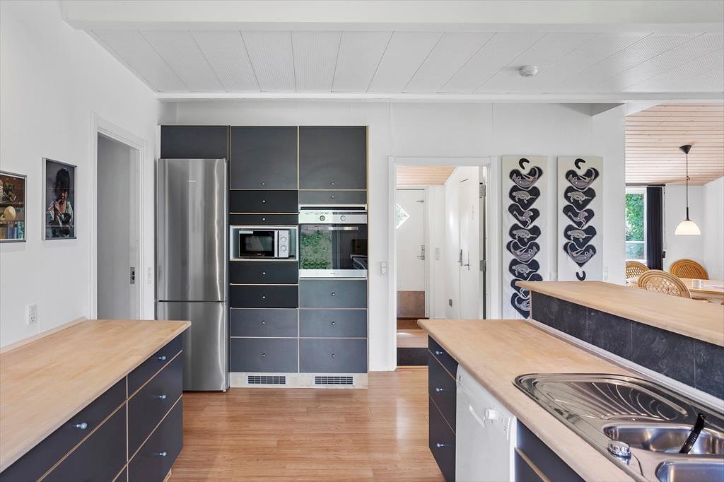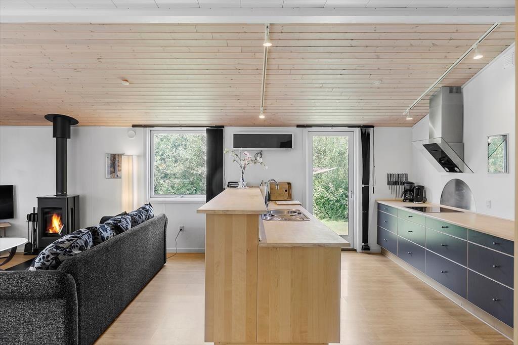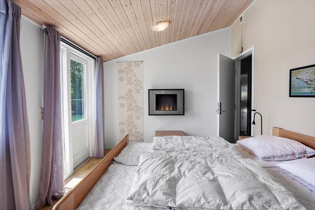 Das Ferienhaus, das gut isoliert ist und u.a. Auf einem großen Wohnzimmer mit schrägen Decken, Holzofen und Zugang zur schönen Südterrasse, von der aus Sie den Blick auf den Garten genießen können. Offene Küche-Esszimmer, 2 gute Badezimmer, eines mit Spa und Dusche, das andere mit Dusche. 3 große Schlafzimmer und direkter Zugang vom Haus zur großen Garage.
