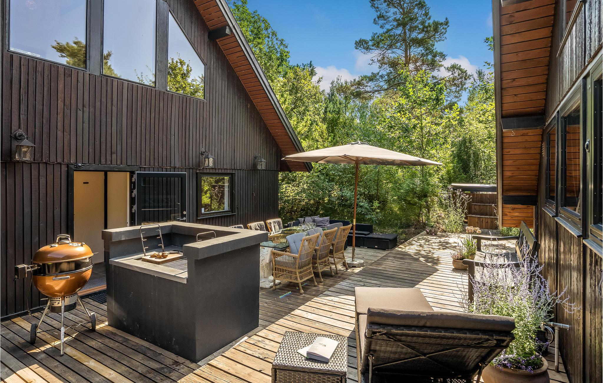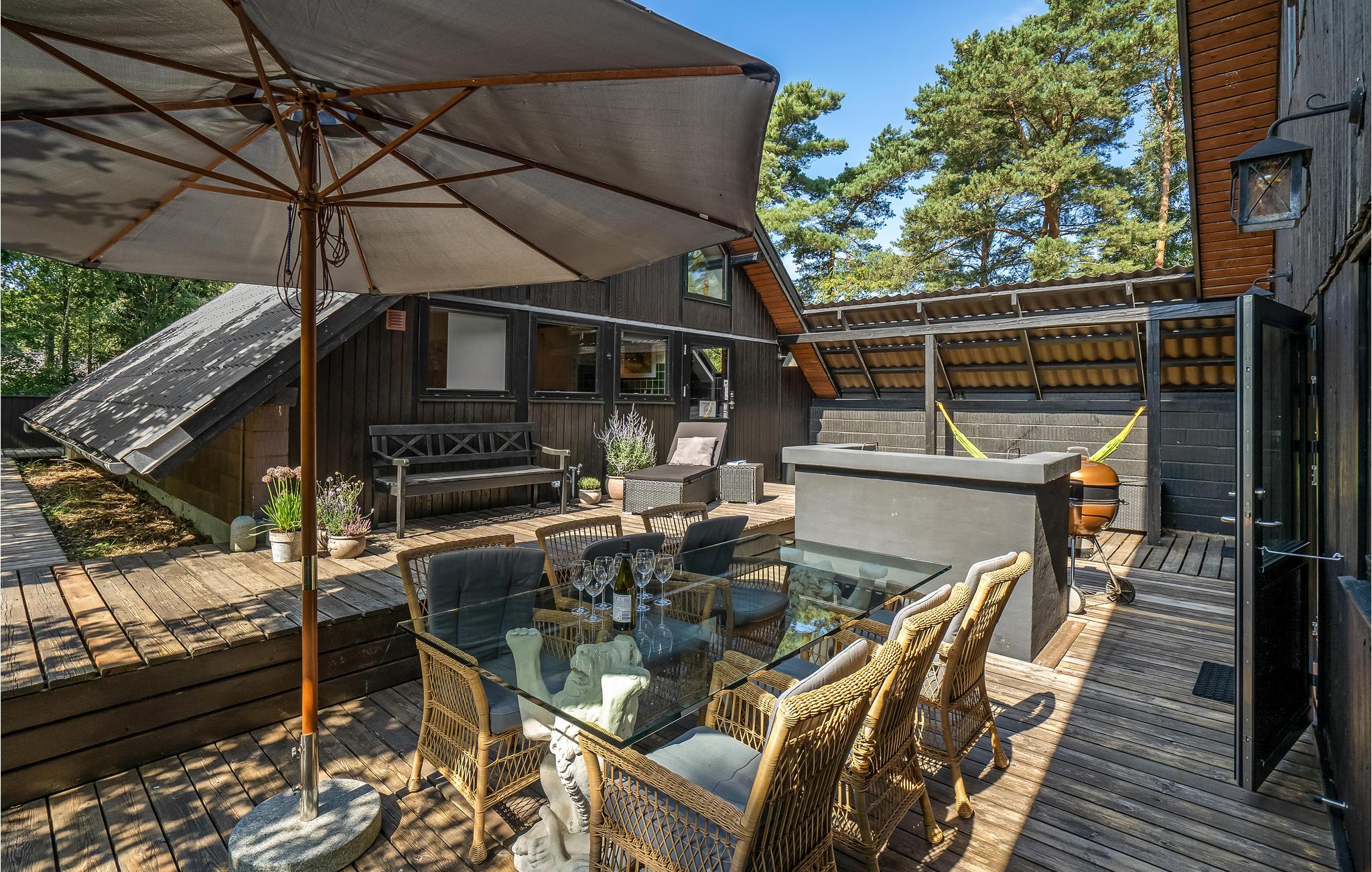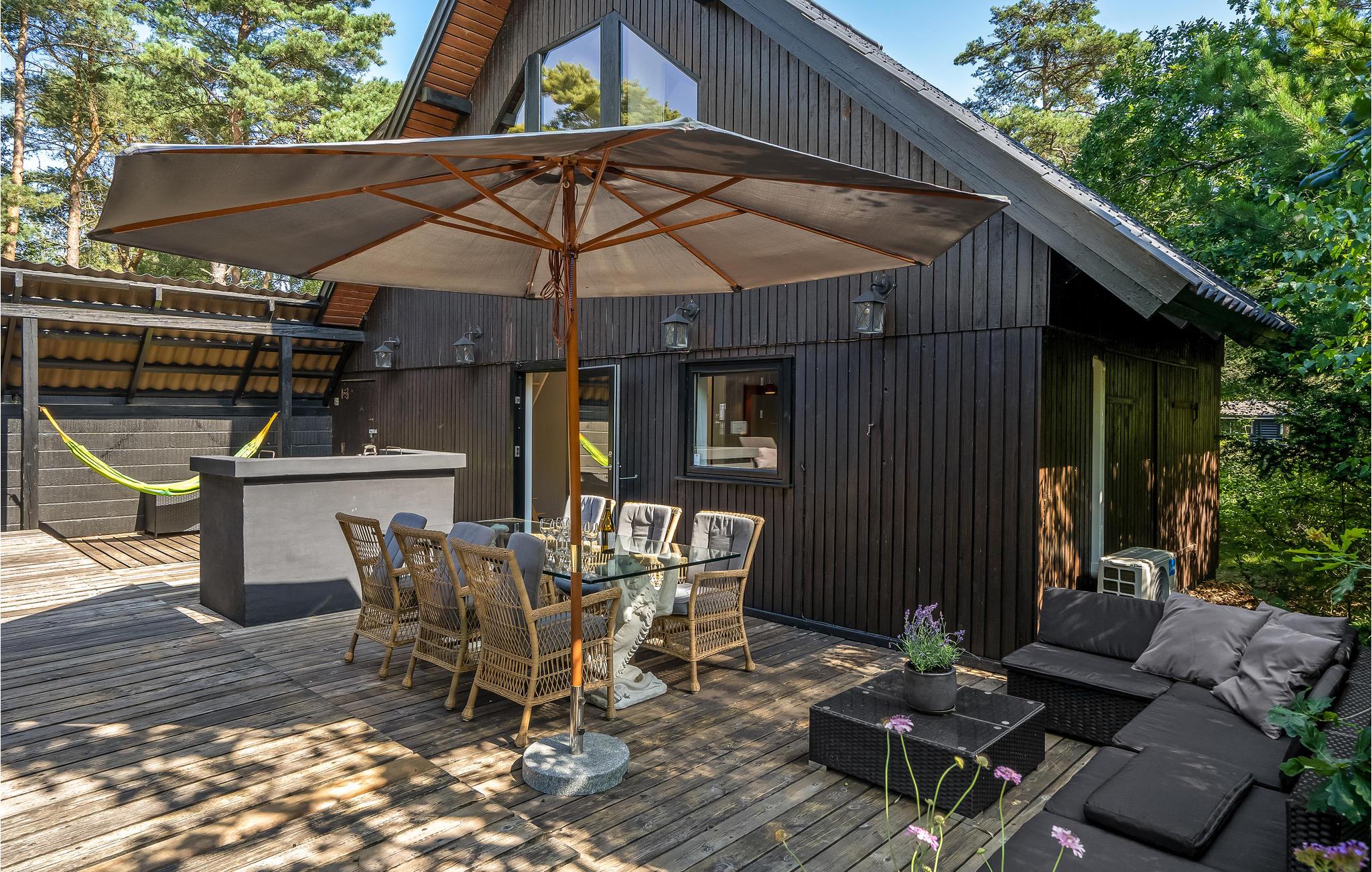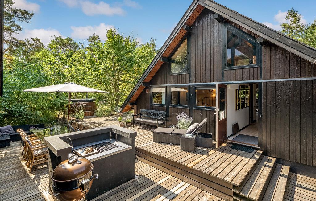 Charmantes Ferienhaus. Das Haus liegt in der Nähe von Gudmindrup Strand, einem der schönsten Strände an der Küste, der kinderfreundlich und mit Dünen ist. Das Haupthaus besteht aus Badezimmer mit Badewanne, 1 Schlafzimmer mit Zugang zum privaten Badezimmer mit Dusche, schöne Küche Familienzimmer in offener Kombination mit dem Wohnzimmer, über eine Treppe Zugang zum Fernsehzimmer. Vom Wohnzimmer Zugang zur offenen und überdachten Terrasse. Das Haus ist durch ein Nebengebäude mit einer schönen offenen Terrasse verbunden, auf der Sie viele Stunden mit angenehmen Grillabenden verbringen können. Genießen Sie nach einem Aufenthalt im finnischen Holzbad eine herrliche Abkühlung im kalten Tauchbecken.