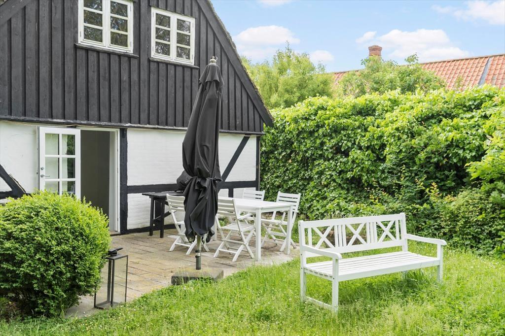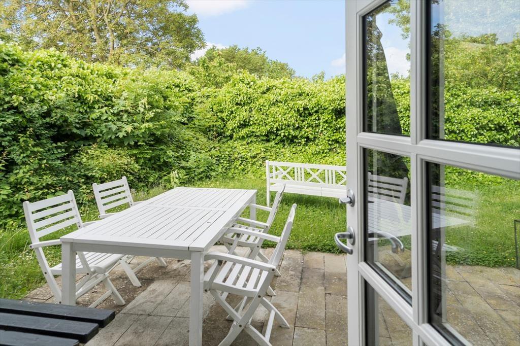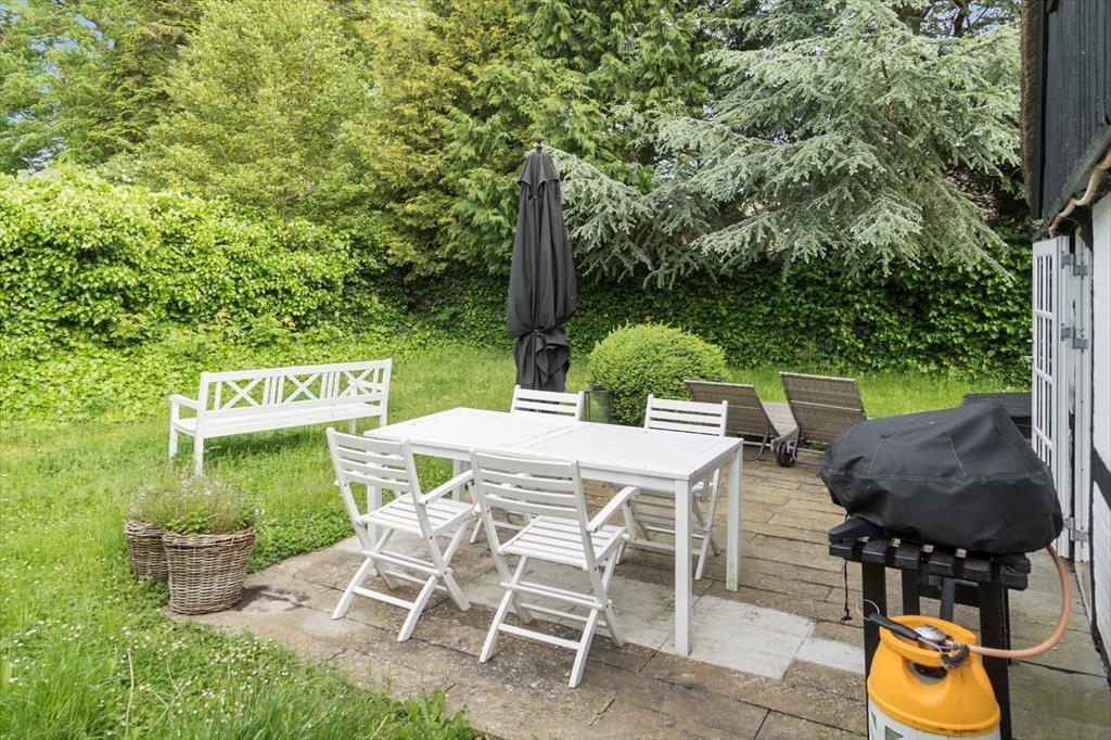 Bag huset finder I en dejlig, grøn og have med terrasse. Her er flere hyggekroge med havemøbler, så der er rig mulighed for at sidde ude og nyde omgivelserne.
