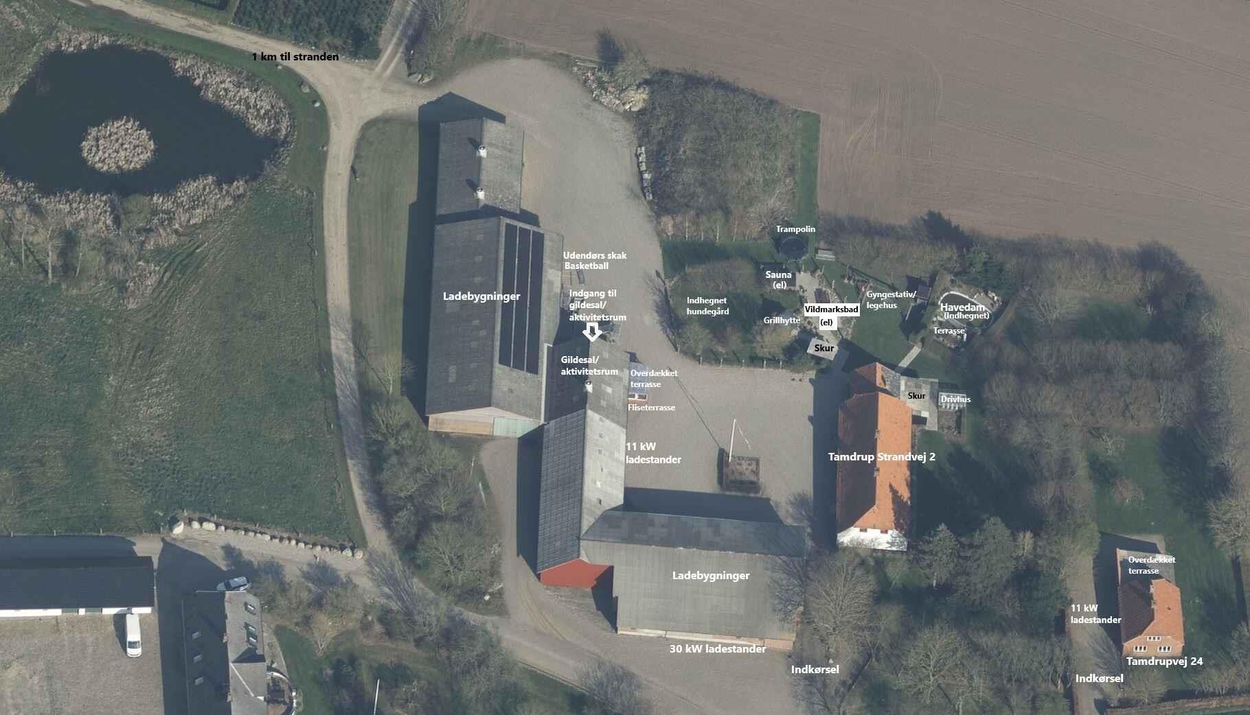 230 m² main house | 120 m² guest house | 18 beds | 100 m² banquet hall (50 guests) with kitchen | 110 m² activity room | 125 m² indoor mini golf (7 holes) | Hot tub | Barrel sauna | Grill hut (12) | 30 kW EV fast charger | Near child-friendly beach