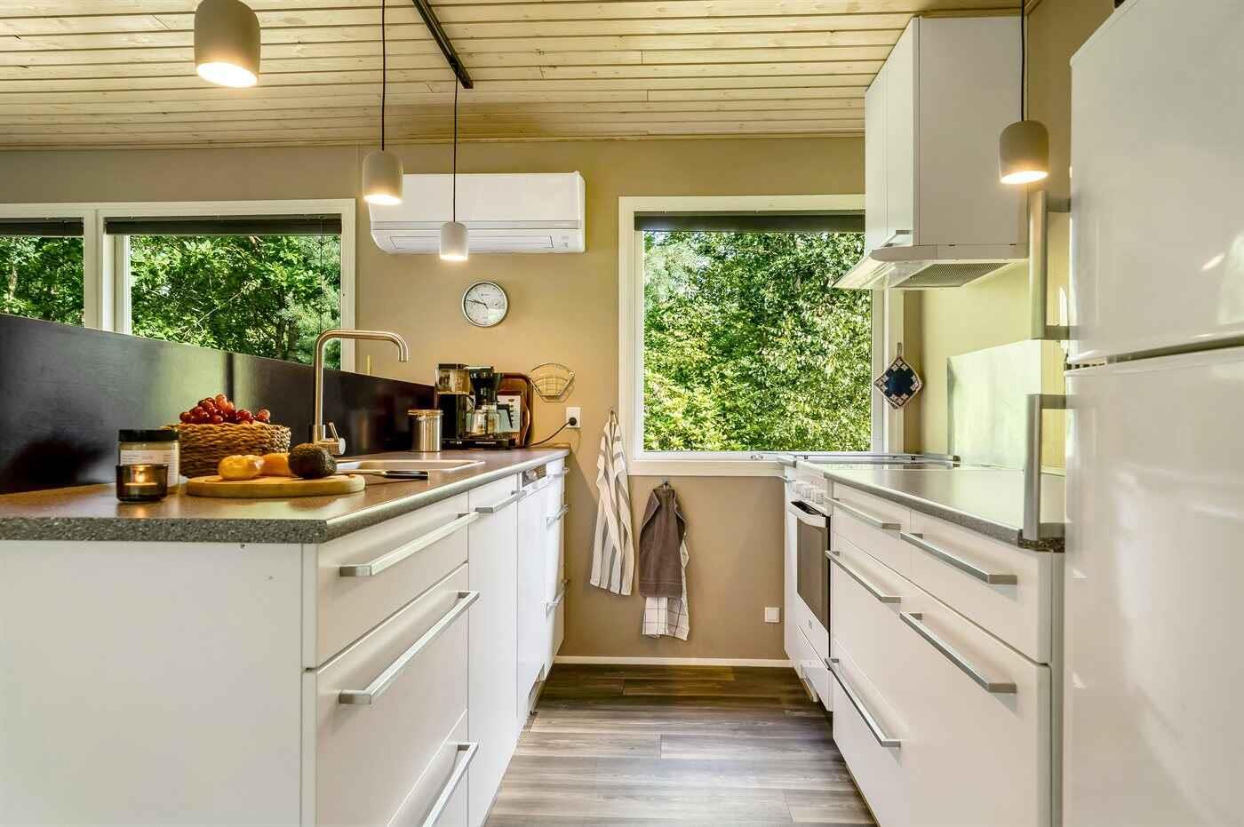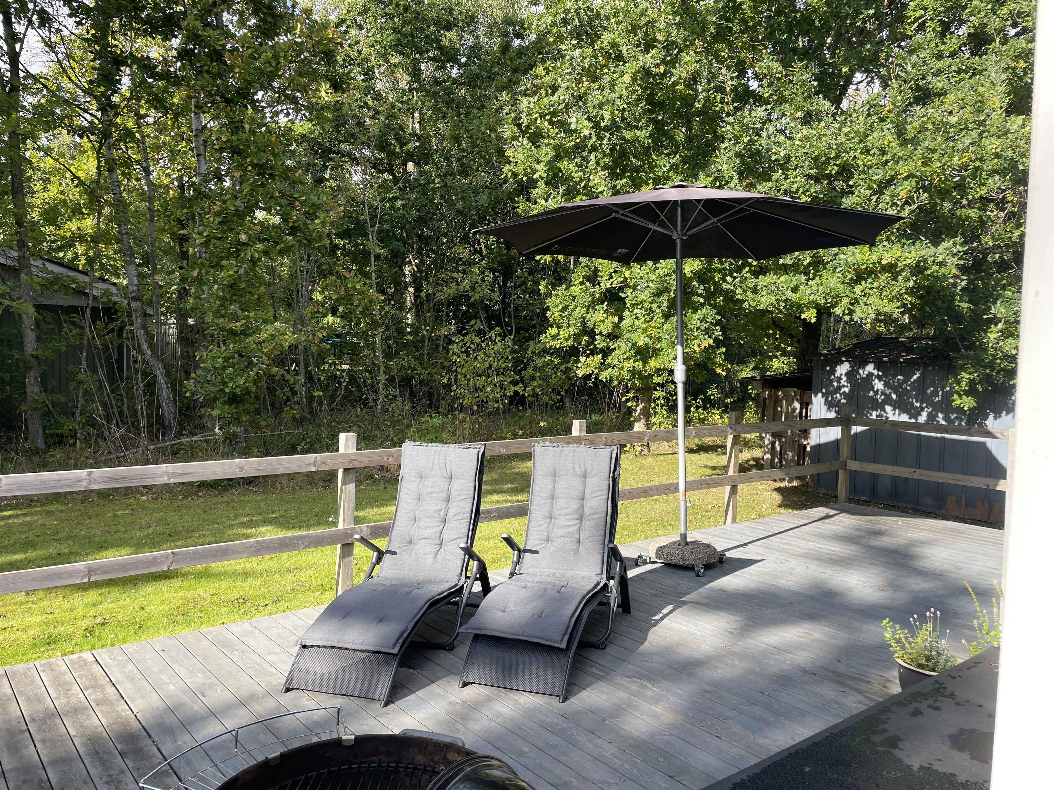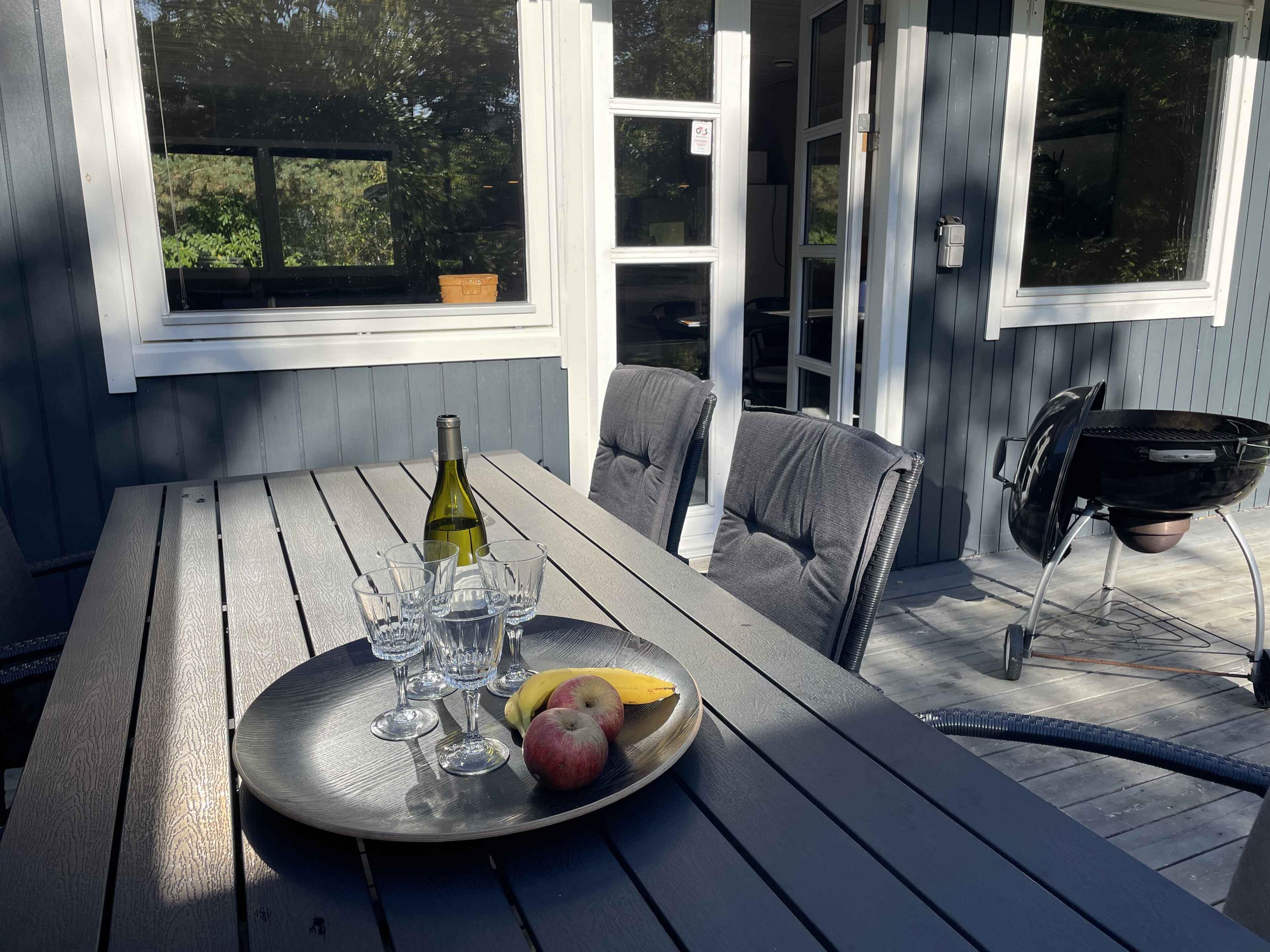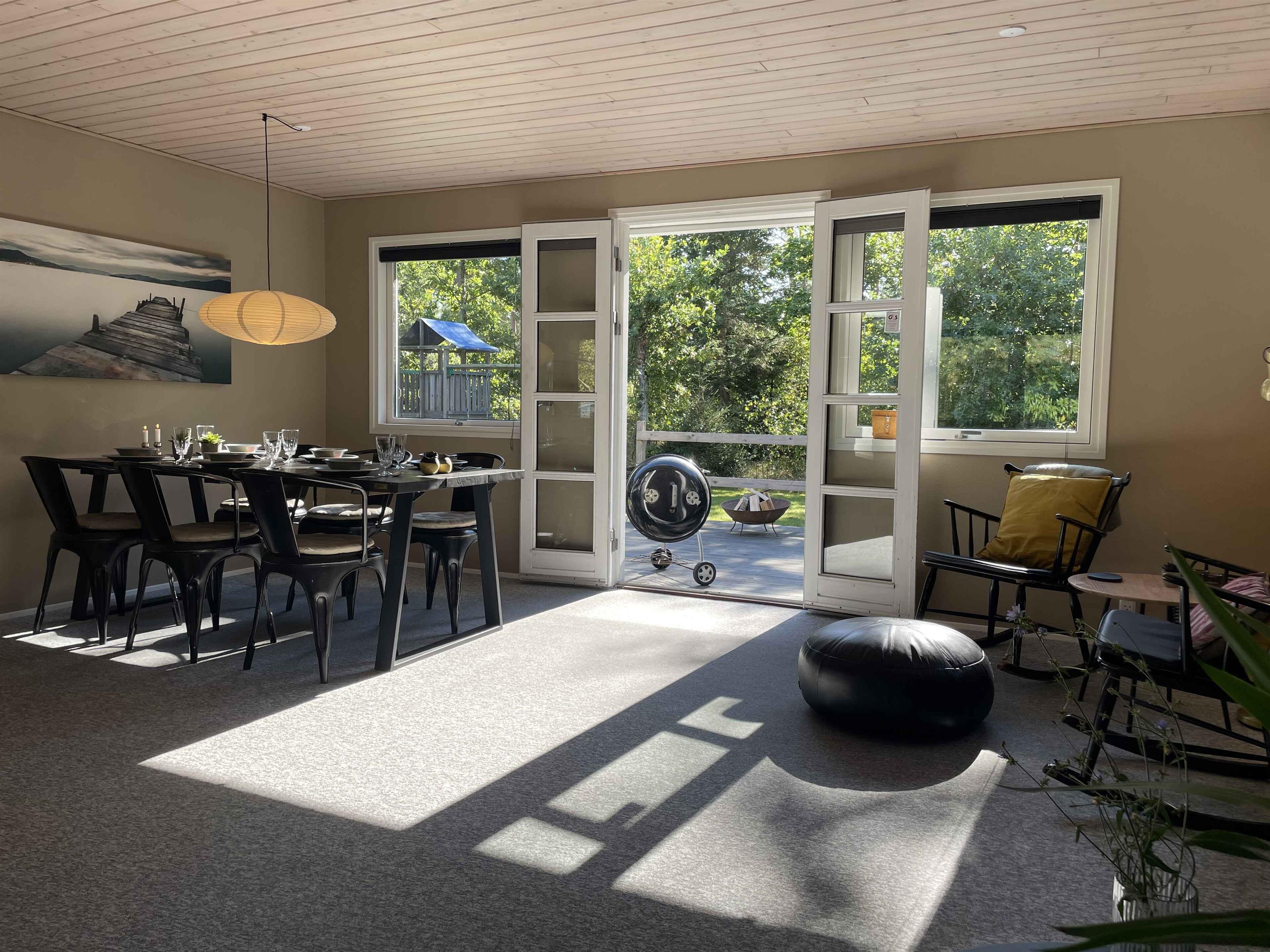 Bright holiday home near sea and fjord, next to the forest. Private plot with space to relax. Terrace with garden furniture, sun loungers and outdoor fireplace. Dishwasher, microwave, heat pump, wood stove, WiFi, smart TV.