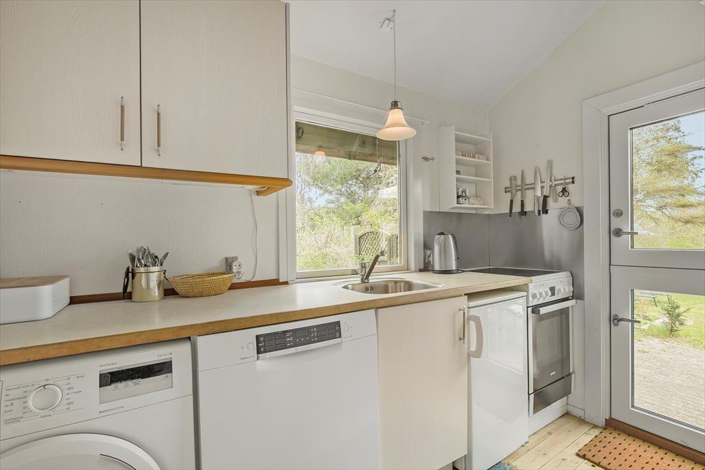 Sobald du das Ferienhaus betrittst, spürst du die entspannte Atmosphäre. Die kleine, praktische Küche eignet sich ideal für die Zubereitung köstlicher Urlaubsgerichte, und durch den direkten Zugang zur Terrasse kannst du dein Frühstück ganz einfach im Freien genießen. Das Wohnzimmer lädt mit bequemen Möbeln zum Entspannen ein – perfekt, um nach einem Tag am Strand die Sonne durch die großen Fenster scheinen zu lassen.