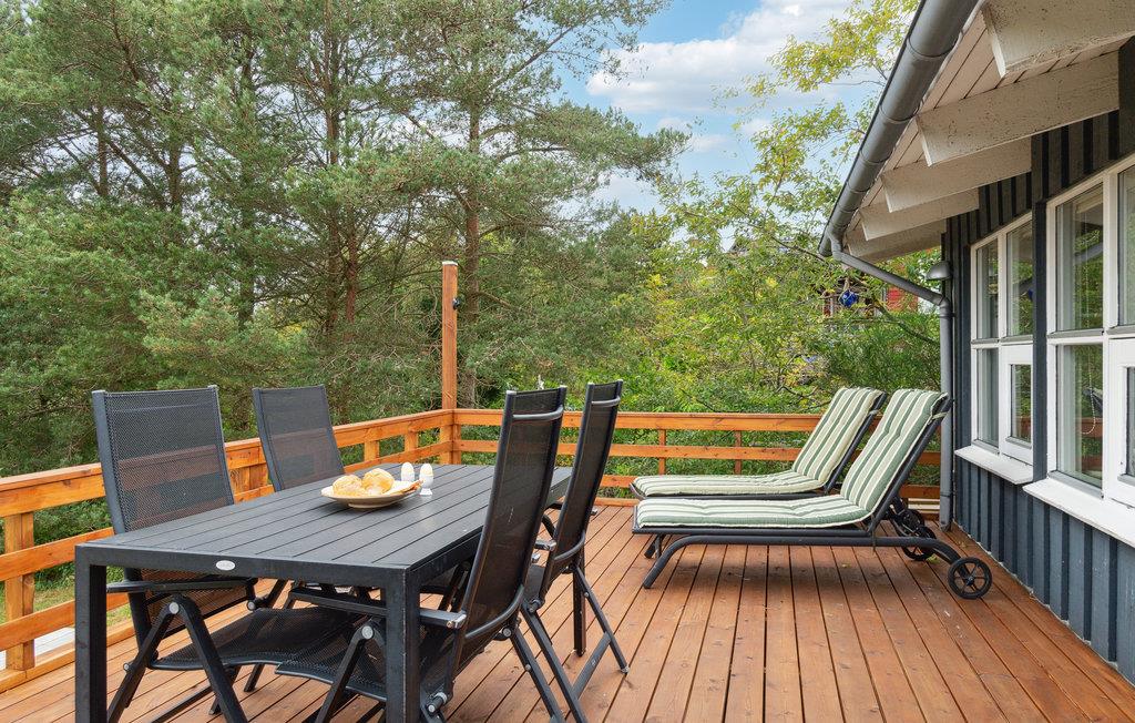 Rund um das Haus erstreckt sich eine Holzterrasse, auf der Sie Ihre Urlaubsessen im Freien genießen oder an heißen Tagen ein Sonnenbad nehmen können. Hier stehen Ihnen Gartenmöbel und Grill zur Verfügung.