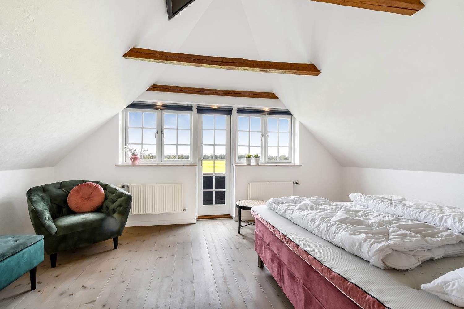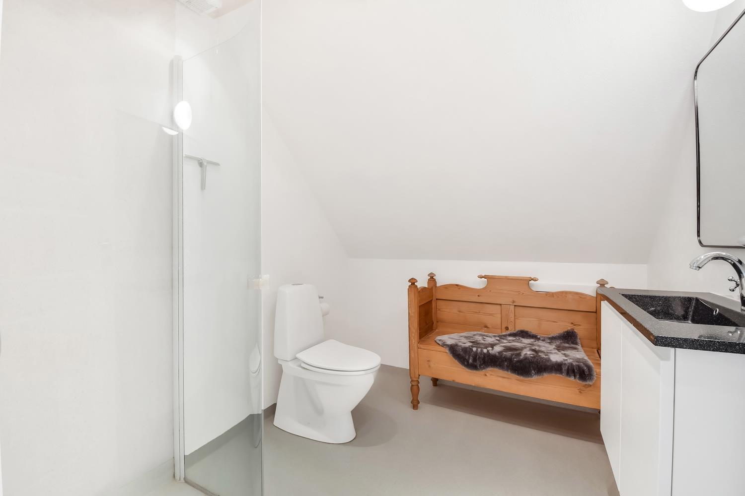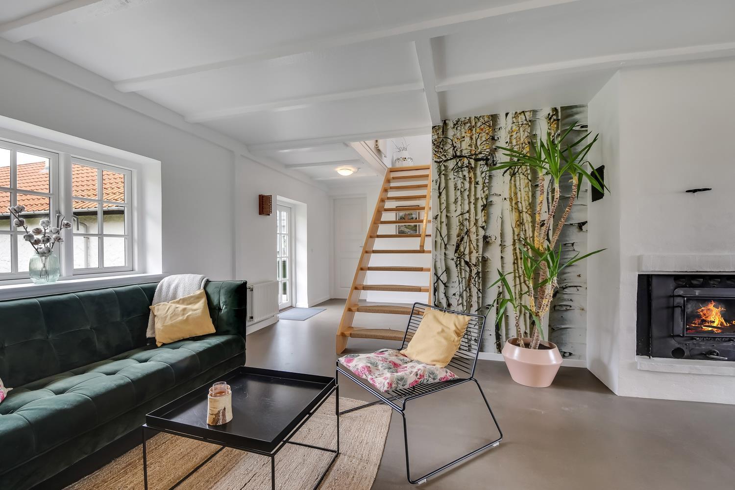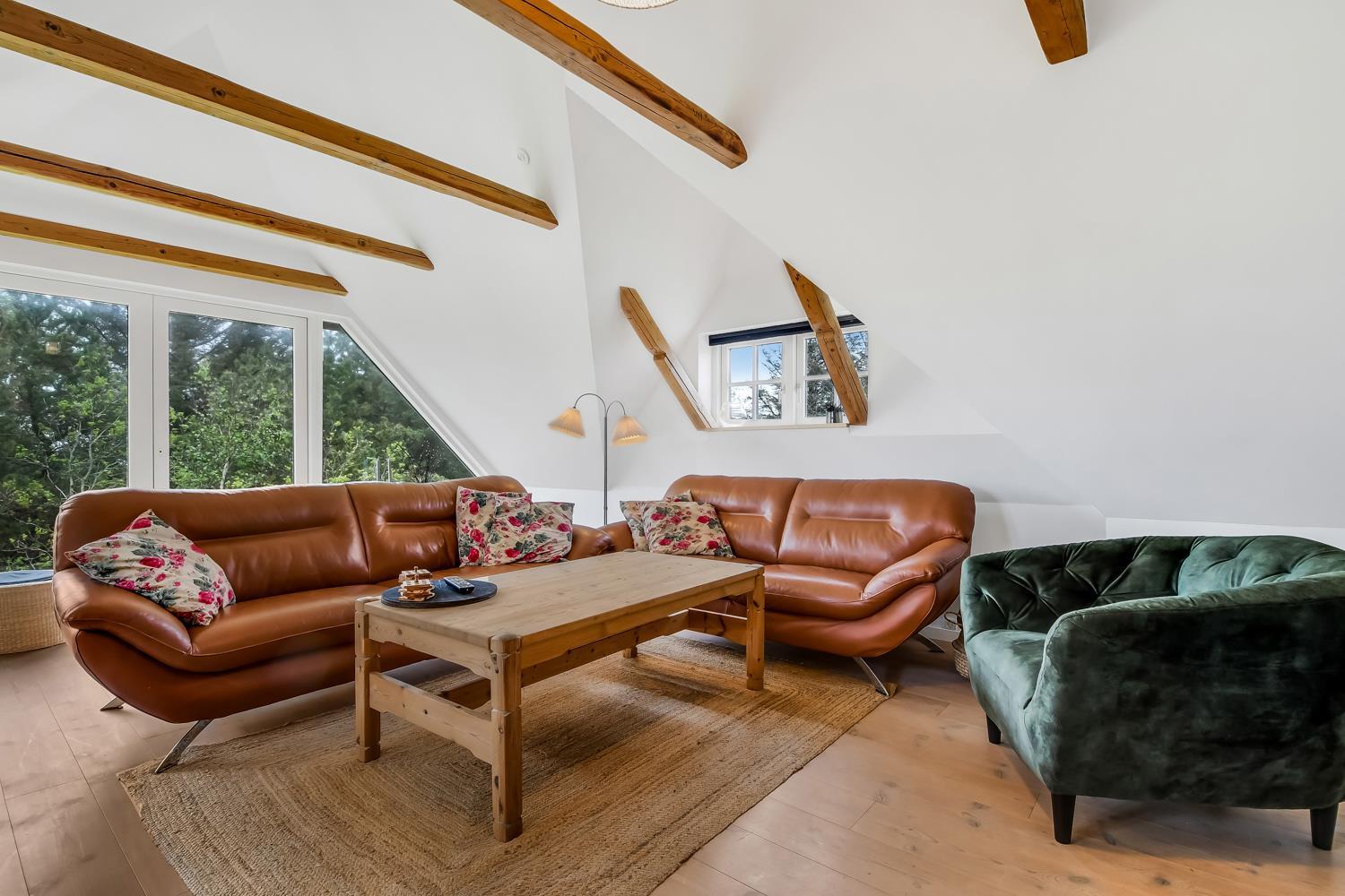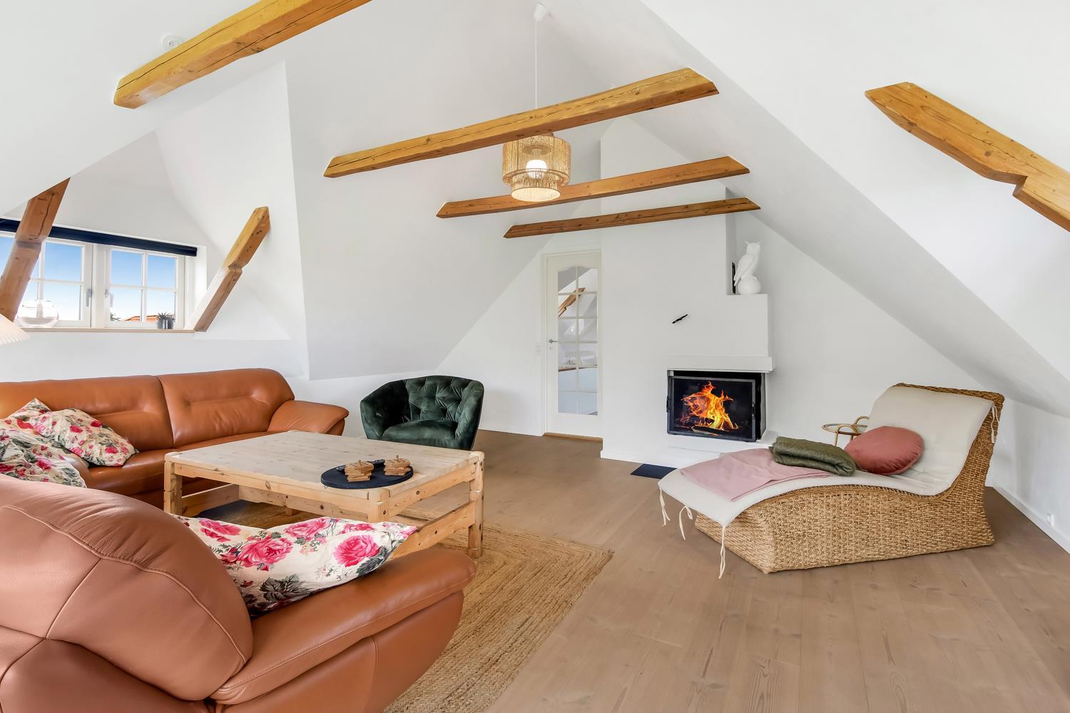 Über die Treppe an der Küche kommen Sie in den 1. Stock. Hier gibt es einen offenen Treppenabsatz mit einer Doppelschlafcouch. Schöner Wohnraum mit fantastichem Blick über die Landschaft und zum Fjord. Wohnraum ist mit schönen Möbeln, Smart-TV mit dänischen und deutschen Programmen sowie der Möglichkeit TV / Radio / Apps über Chromecast zu streamen. Wenn Sie ein Mobiltelefon oder ein anderes Gerät bei sich haben, können Sie streamen, wofür Sie ein Abonnement haben. Badezimmer mit Toilette, Waschbecken und Dusche. grosser Schlafraum mit 1 DB und TV an der Wand mit dänischen und deutschen Programmen und Ausgang zum prachtvollen Balkon mit Blick zum Wasser und über die Landschaft.