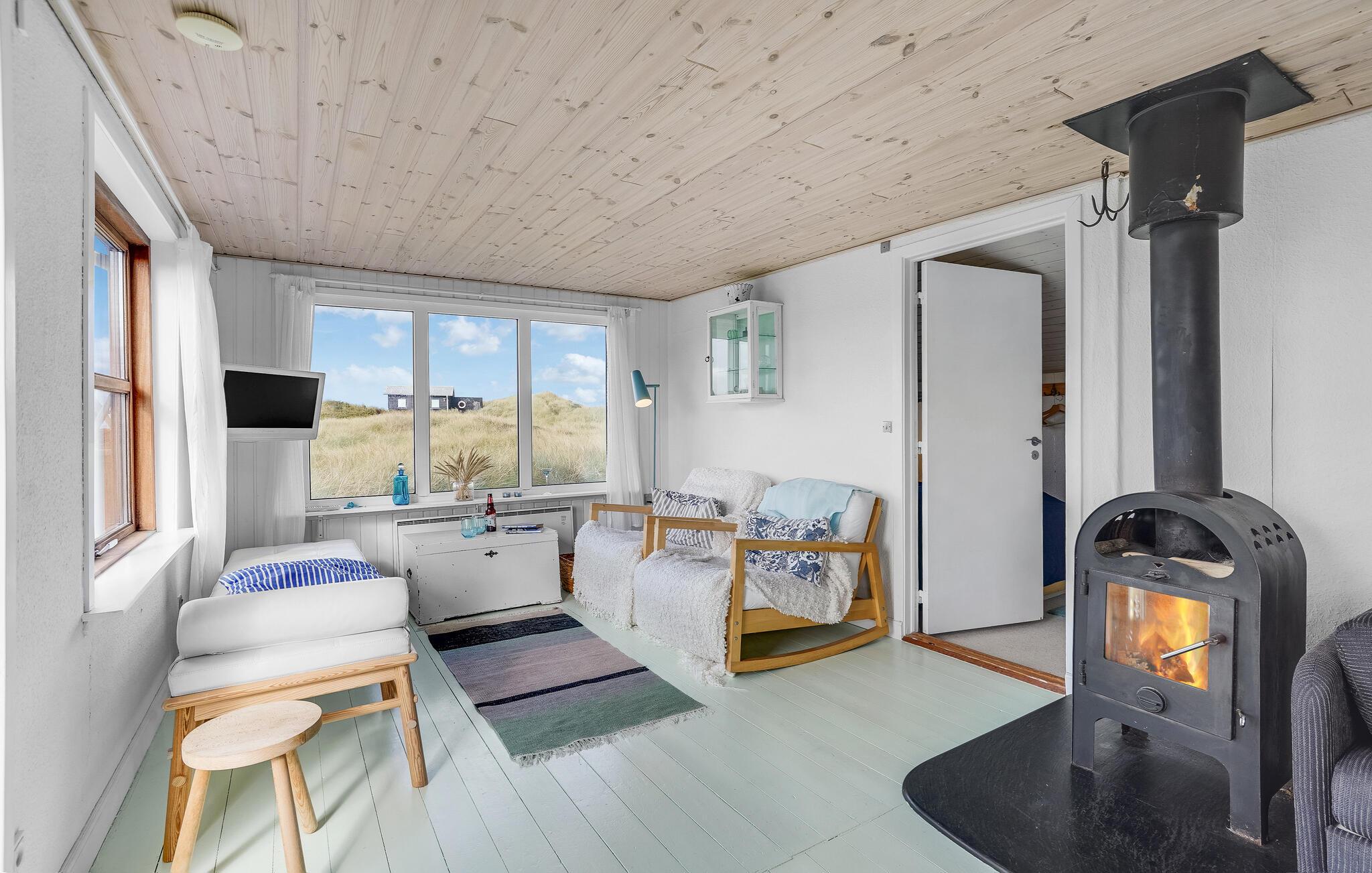 Die klare Architektur des Hauses, große Fenster und eine helle Holzvertäfelung schaffen eine behagliche Atmosphäre, in der Sie schnell zur Ruhe kommen. An kühleren Tagen sorgt der Kaminofen für wohlige Wärme, während Sie sich auf dem Sofa entspannen oder in der praktischen Küche gemeinsam Mahlzeiten mit Ihren Lieben zubereiten. Ob beim Lesen, Musikhören oder Plaudern – hier fällt das Abschalten leicht.