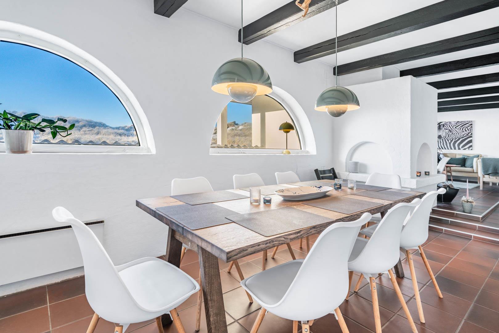 Gemeinsame Abendessen, Gesellschaftsspiele und Entspannung werden im offenen Wohnbereich des Hauses geboten, der aus einem hellen Essbereich, einer gepflegten Küche und einem leicht erhöhten Wohnzimmer besteht. In der Mitte des Raumes verbreitet ein rundbogiger offener Kamin Wärme und spanisches Flair.