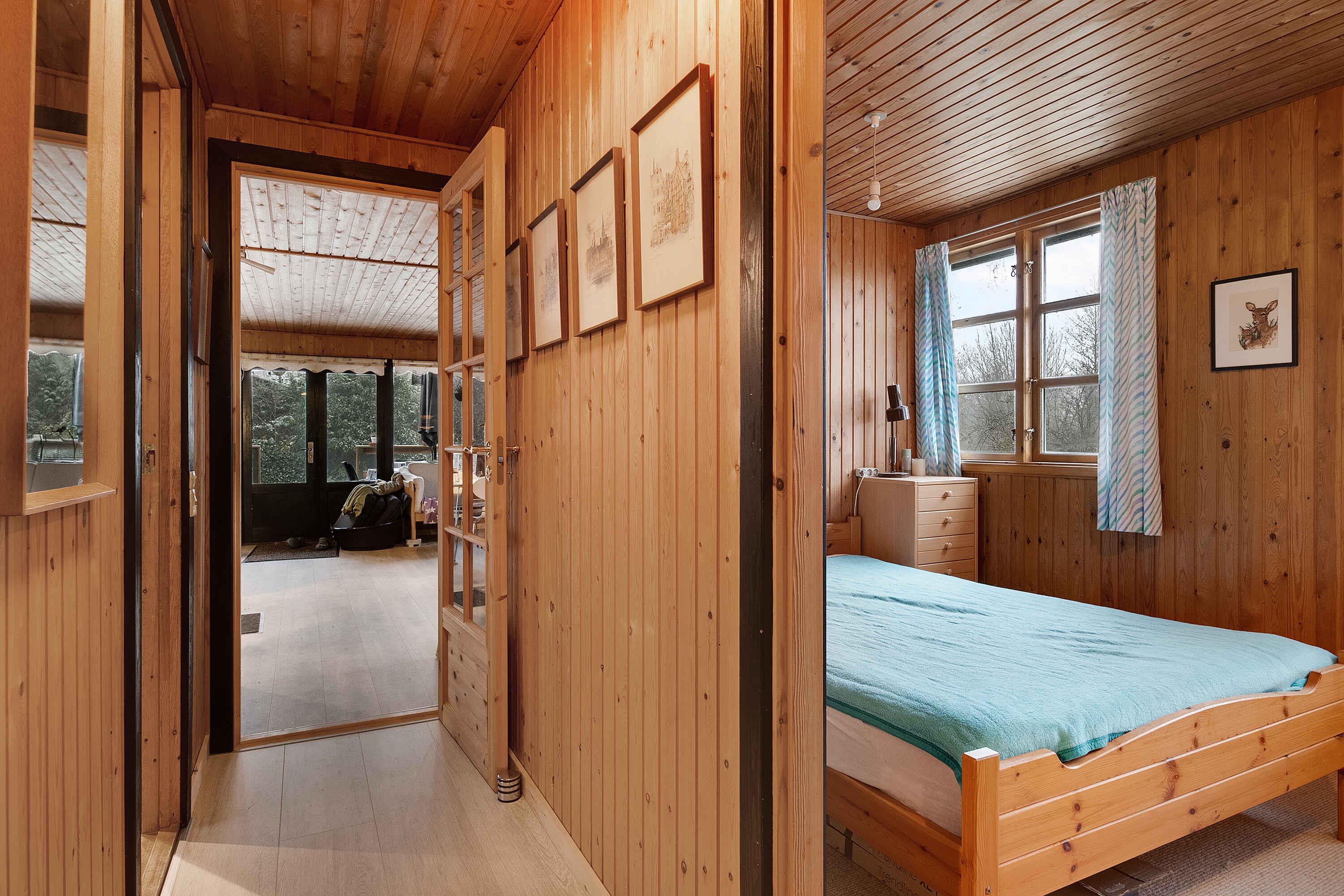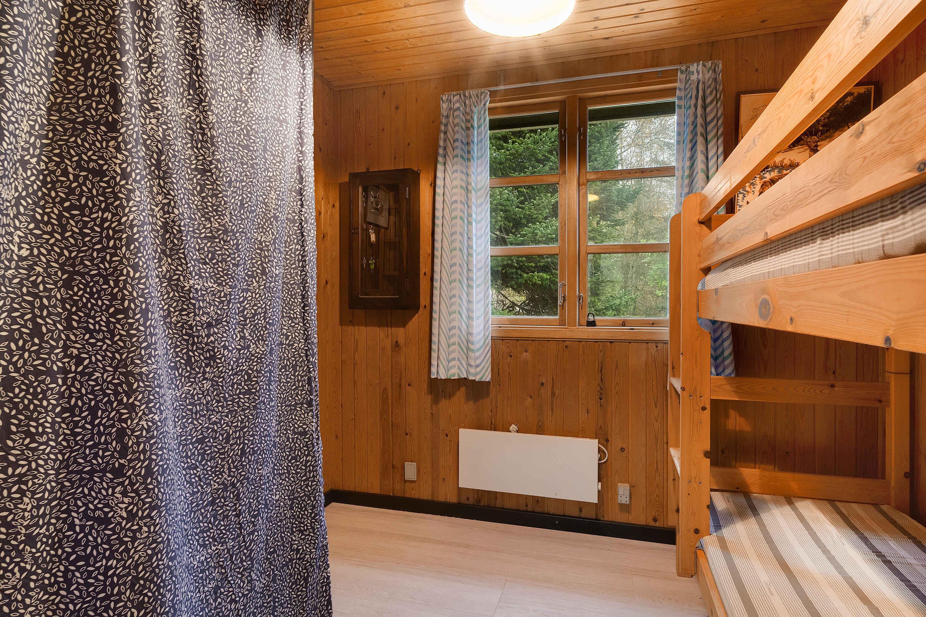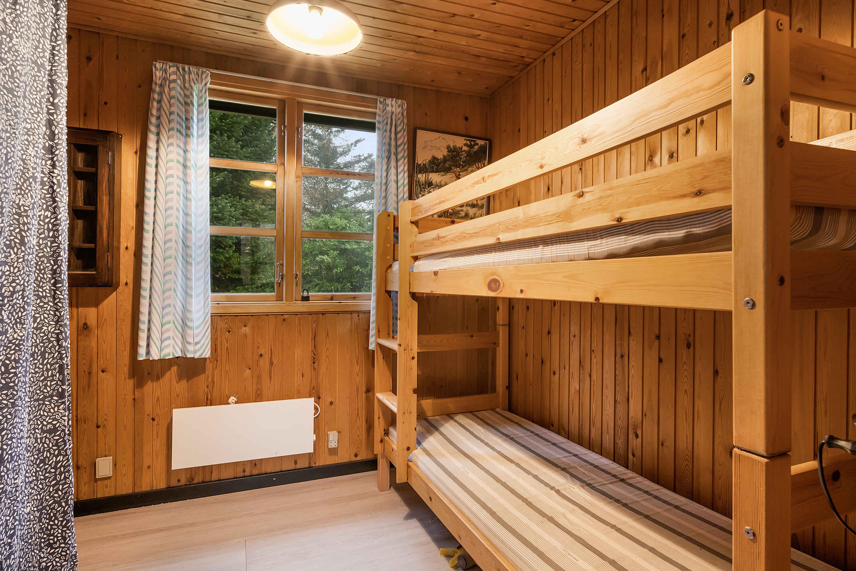 Cozy cottage only 600 meters from the water, with two bedrooms, one with a double bed and one with a bunk bed, and a bathroom.