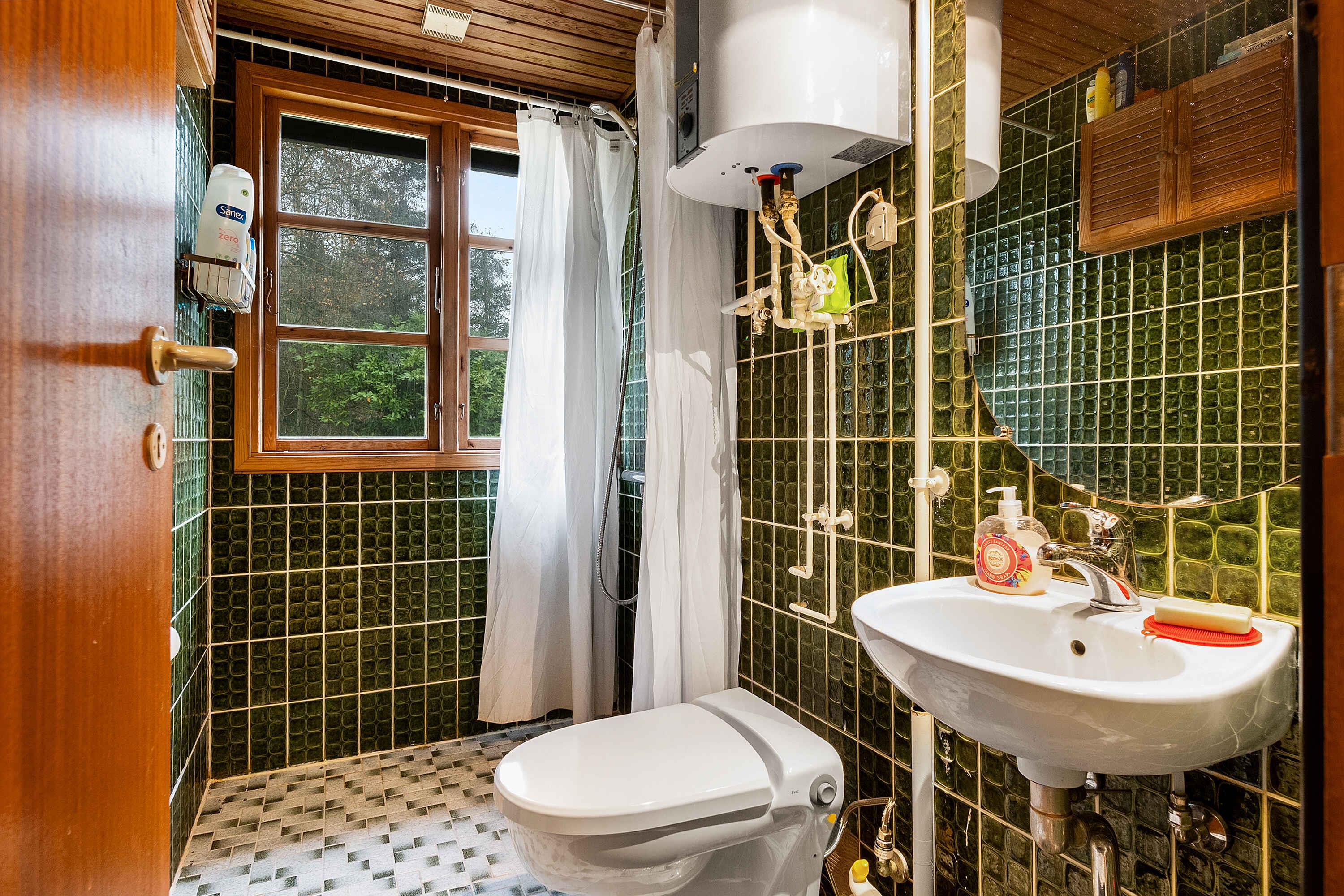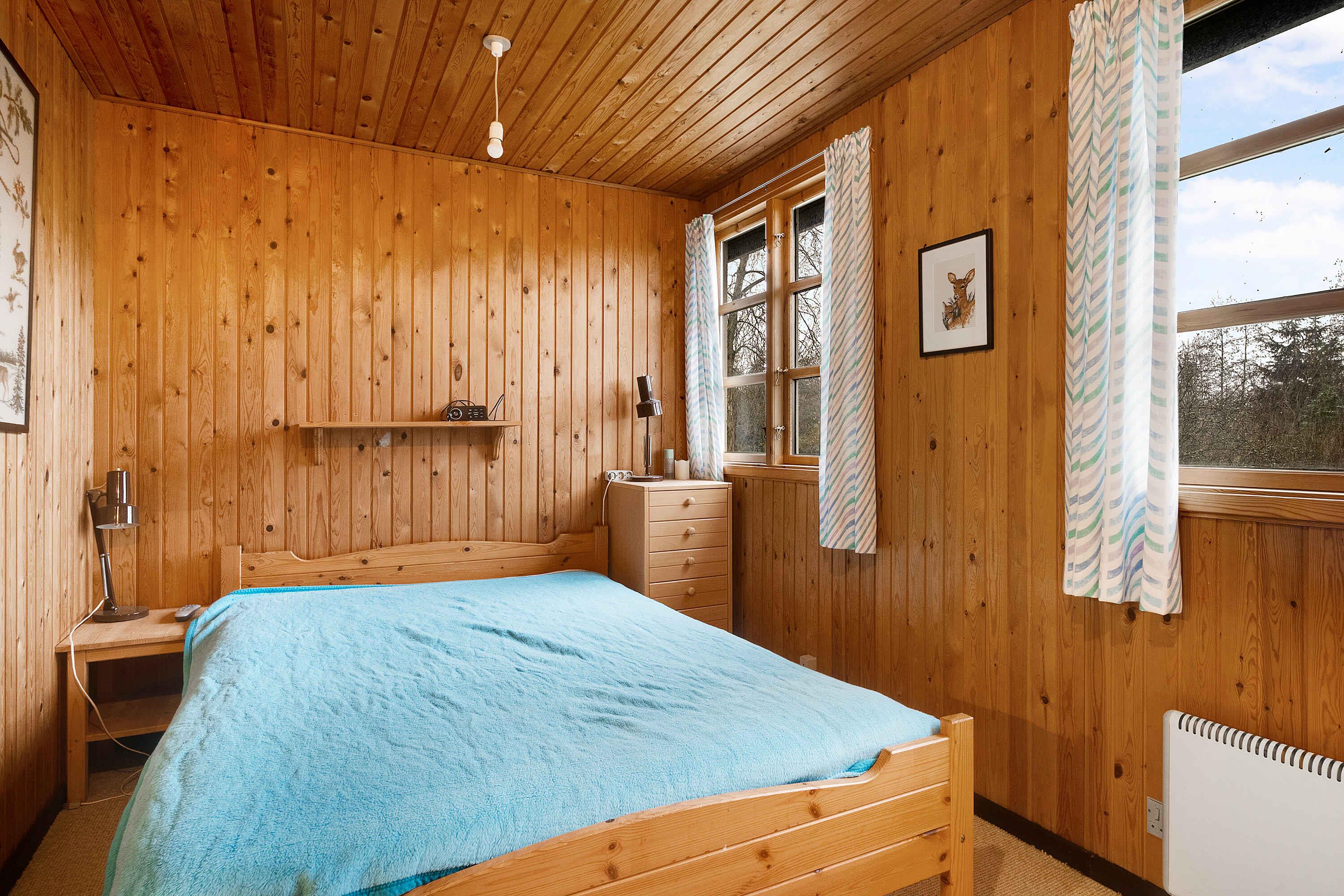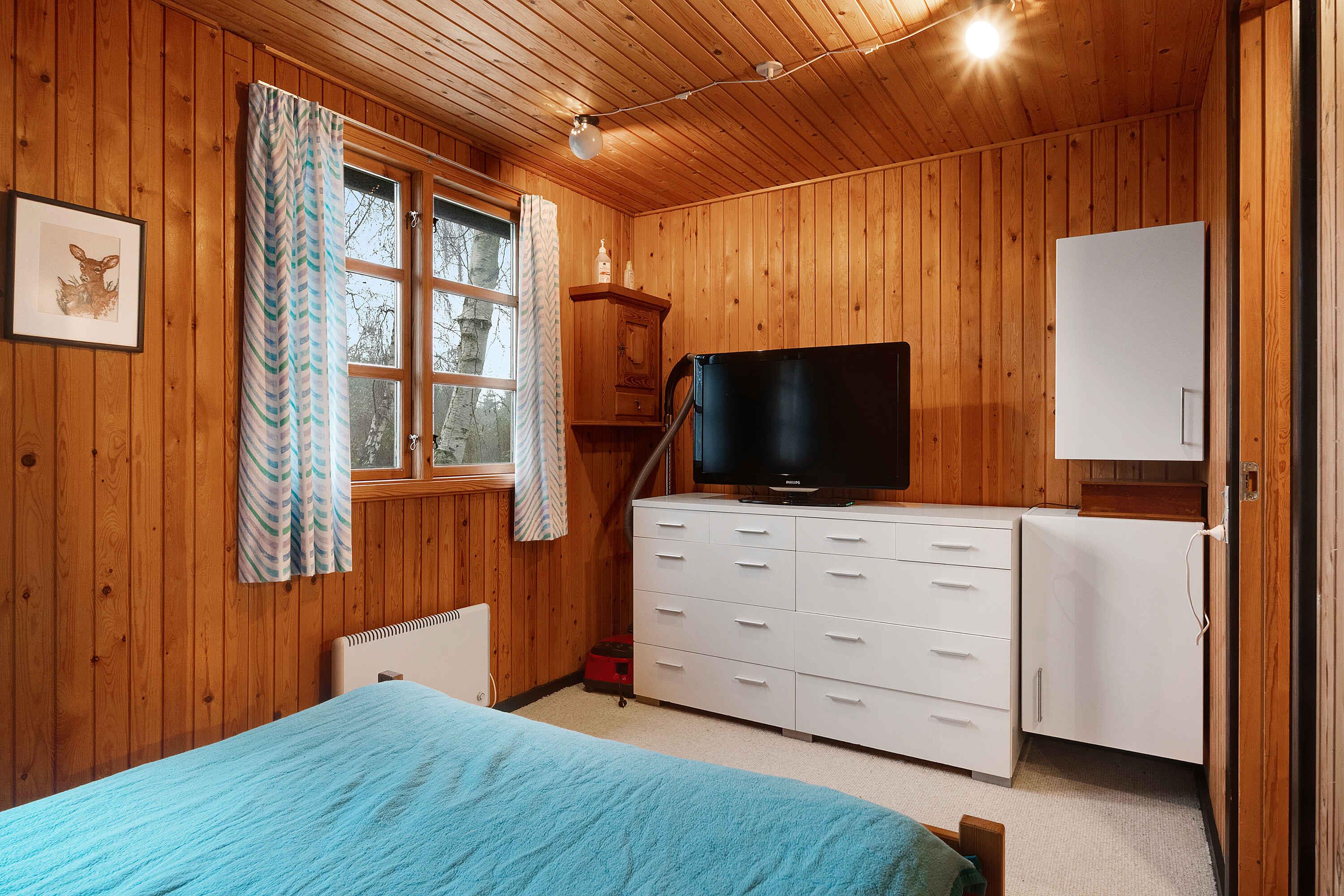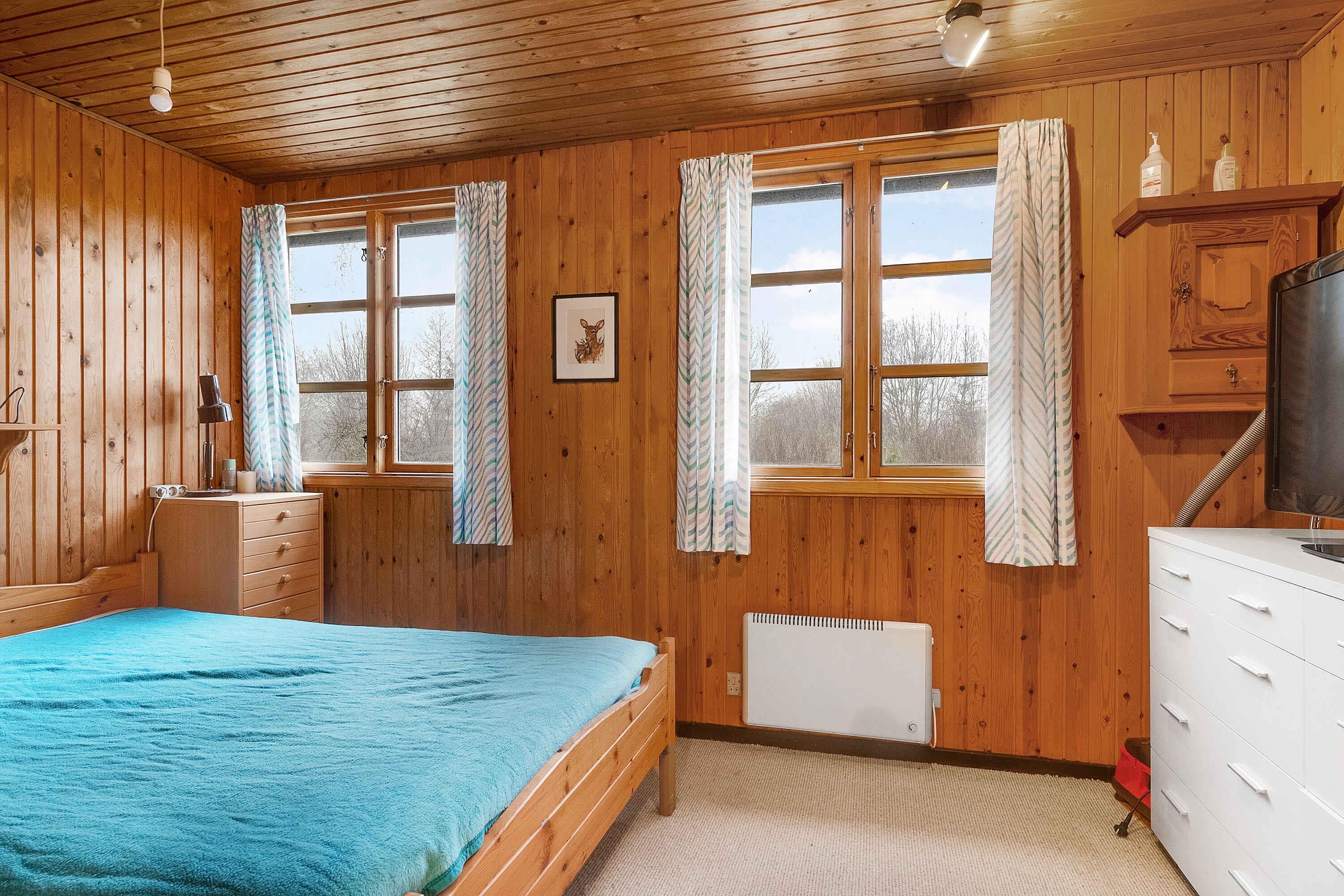 Cozy cottage only 600 meters from the water, with two bedrooms, one with a double bed and one with a bunk bed, and a bathroom.