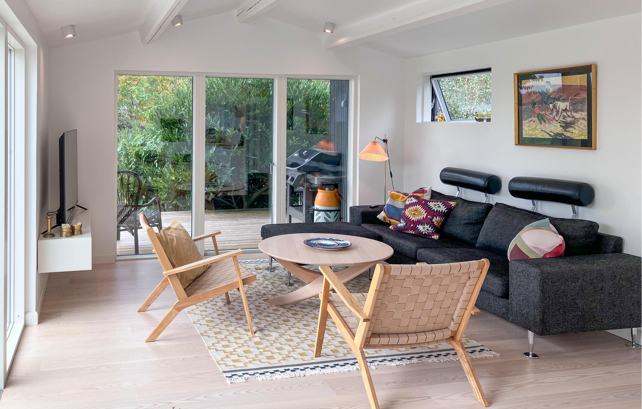 Erleben Sie erholsame Tage in Ihrem lichtdurchfluteten Ferienhaus, das Komfort mit einer herrlichen Lage am Isefjord verbindet. Hier verbringen Sie Ihren Urlaub in ruhiger Umgebung, mit viel Platz zum Entspannen und einem wunderbaren Ausblick auf die sanfte Landschaft. Der offene Wohnbereich mit großen Fensterfronten verbindet drinnen und draußen zu einem harmonischen Ganzen. Machen Sie es sich auf dem Sofa gemütlich und genießen Sie den Blick ins Grüne oder einen Film auf dem Fernseher. Die Küche ist ideal für gemeinsame Kochabende, bei denen Sie am großen Esstisch zusammenkommen.