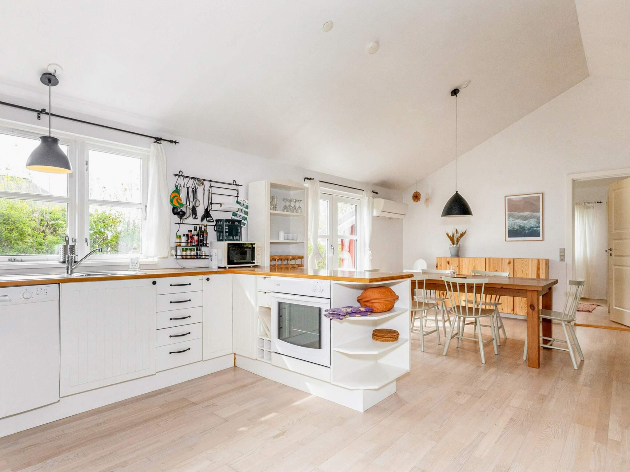 Das Ferienhaus ist gut eingerichtet und verfügt über eine offene Küche in Verbindung mit dem Wohnzimmer. Hier finden Sie u.a. Spülmaschine, Mikrowelle und Kühl-Gefrierkombination vor. Vom Esszimmer aus haben Sie Zugang zu einer kleinen Terrasse, auf der Sie die Morgensonne genießen können. Im Wohnzimmer gibt es reichlich Gelegenheit zum Entspannen auf dem Ecksofa. Darüber hinaus gibt es die Möglichkeit, den Holzofen anzuzünden, um an einem kühlen Abend für zusätzliche Gemütlichkeit und Wärme zu sorgen. Beim Fernseher handelt es sich um Google TV, auf dem Sie Ihre eigenen Lieblingsfilme über das blitzschnelle Glasfaser-Internet des Hauses streamen können, indem Sie sich einfach über das eigene Benutzerkonto des Gastes anmelden, um z.B. Netflix, HBO max, Amazon Prime usw. zu sehen. Darüber hinaus gibt es ein TV-Paket von Altibox mit deutschen, norwegischen und dänischen Sendern.
