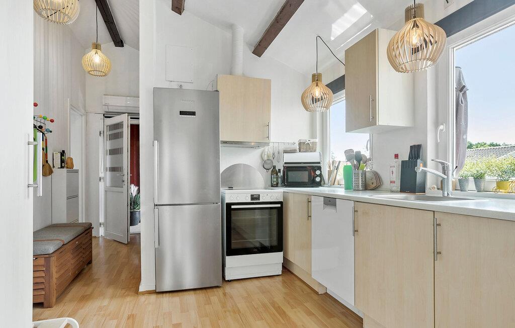 Dieses einladende Ferienhaus vermittelt typisch dänisches Urlaubsflair. Der helle Wohnbereich mit großen Fenstern und geräumiger Küche bietet den idealen Rahmen, um gemeinsame Stunden zu verbringen, sei es beim Kochen, Spielen oder gemütlichen Beisammensein. Am Esstisch findet die ganze Familie Platz, um Mahlzeiten in geselliger Runde zu genießen. Machen Sie es sich auf dem Sofa oder den Sesseln bequem, schauen Sie einen Film, spielen Sie Karten oder lassen Sie den Blick in den Garten schweifen.