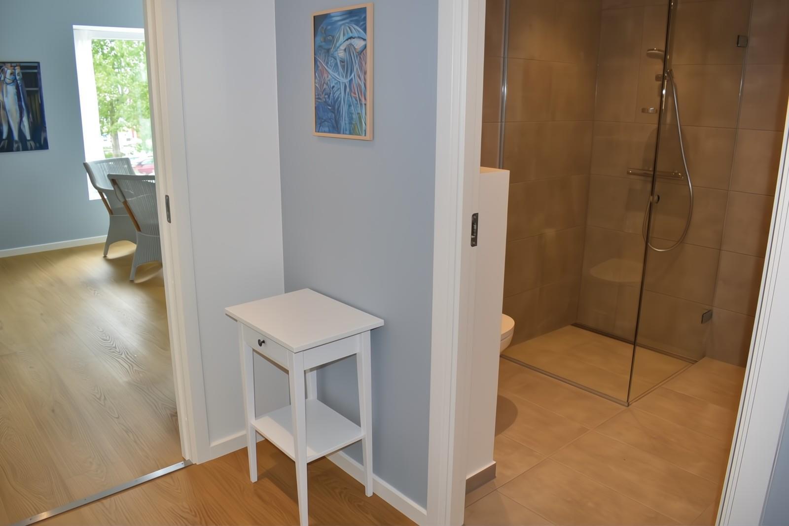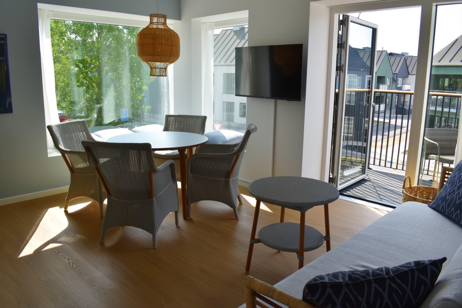 Situated on the first floor, the apartment features a bright living room with a smart TV (streaming only), a fully equipped kitchen, a spacious bathroom with a shower and underfloor heating, and a large bedroom with a double bed and views of the marina and water. The living room provides direct access to a private balcony with comfortable outdoor furniture.