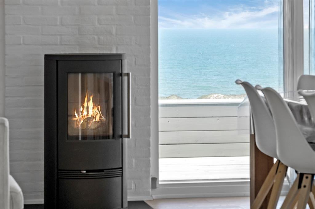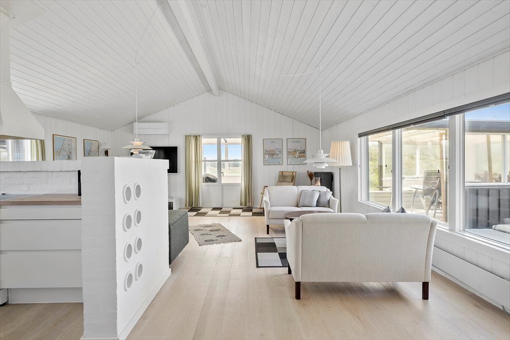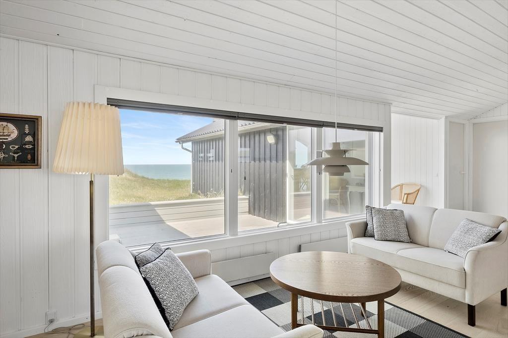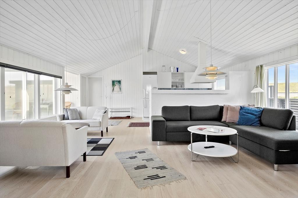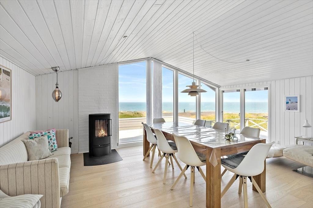Der Blick auf die Nordsee beeindruckt besonders vom Esszimmer, da das Wohnzimmer am westlichsten Teil des Hauses liegt und mit einer großen Fensterfront ausgestattet ist, die freien Blick auf die tosenden Wellen des Meeres und das Dünengras bietet. Das Esszimmer ist zudem ein paar Stufen höher als der restliche Wohnbereich, der aus einer offenen Küche und einem Wohnzimmer besteht. Überall ist die Atmosphäre hell, da Wände und Decken frisch gestrichen wurden und auch neue Böden im Jahr 2020 verlegt wurden. Im Wohnbereich gibt es außerdem einen Kaminofen und eine Wärmepumpe, und auf dem Smart-TV ist Chromecast verfügbar. Ein Doppel-Schlafsofa ist ebenfalls hier, und es dient als gute Ergänzung zu den vier Schlafplätzen in den Schlafzimmern. Schließlich bietet der Grundriss ein geräumiges Badezimmer mit Dusche, Fußbodenheizung und Waschmaschine.