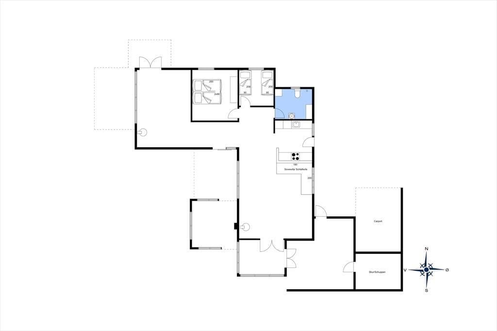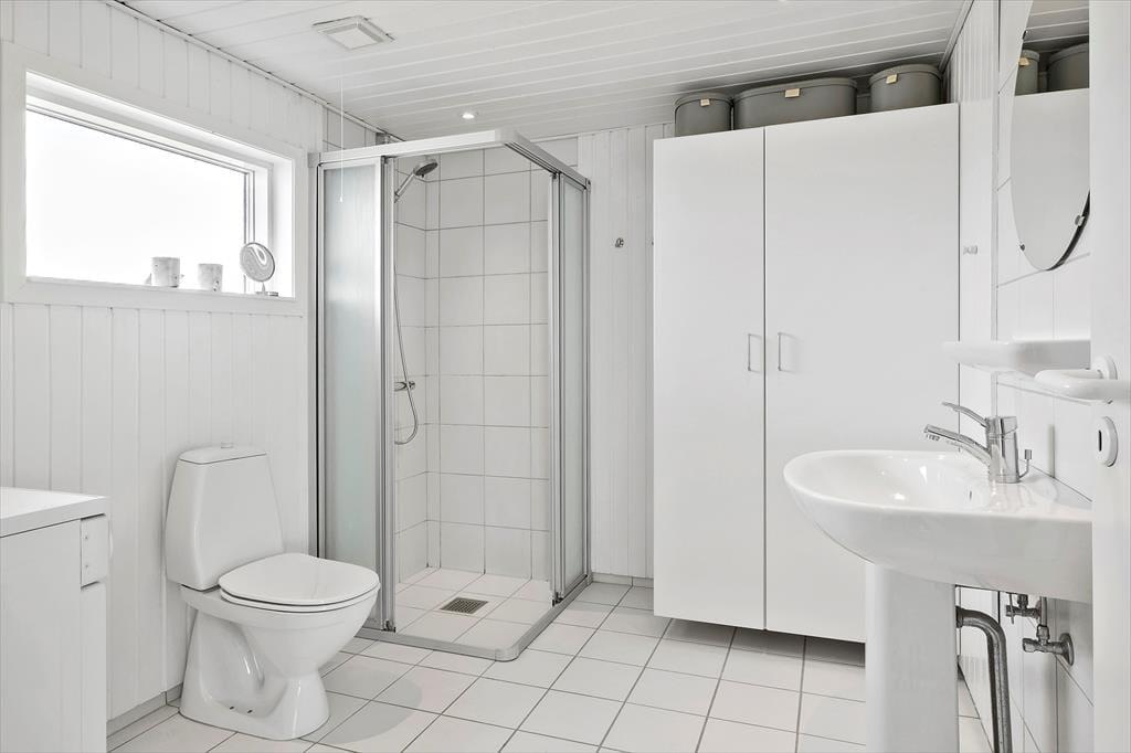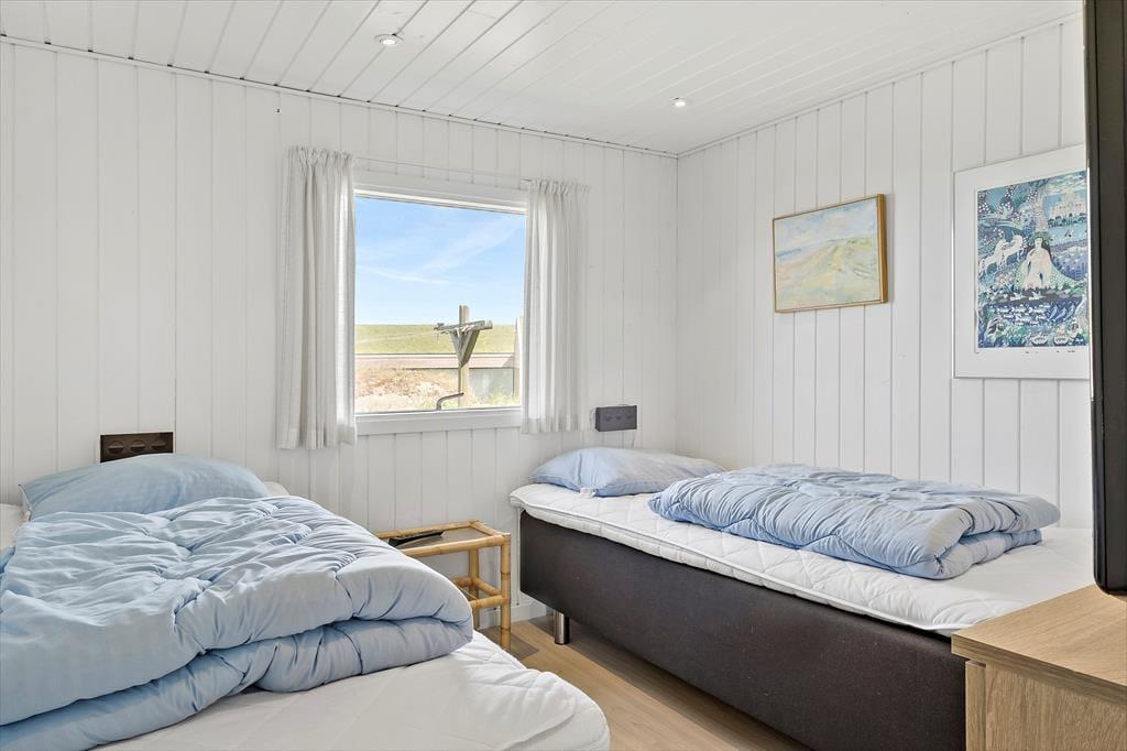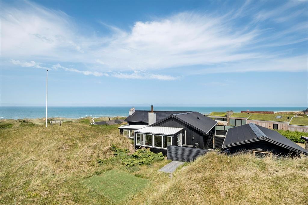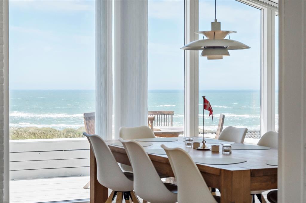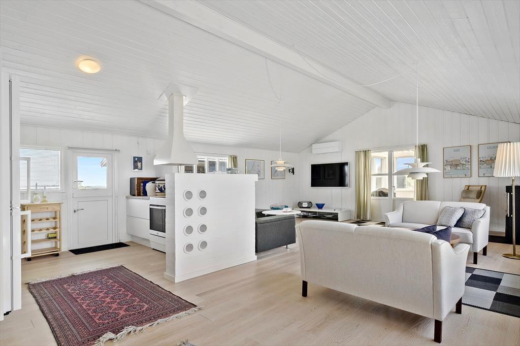 Der Blick auf die Nordsee beeindruckt besonders vom Esszimmer, da das Wohnzimmer am westlichsten Teil des Hauses liegt und mit einer großen Fensterfront ausgestattet ist, die freien Blick auf die tosenden Wellen des Meeres und das Dünengras bietet. Das Esszimmer ist zudem ein paar Stufen höher als der restliche Wohnbereich, der aus einer offenen Küche und einem Wohnzimmer besteht. Überall ist die Atmosphäre hell, da Wände und Decken frisch gestrichen wurden und auch neue Böden im Jahr 2020 verlegt wurden. Im Wohnbereich gibt es außerdem einen Kaminofen und eine Wärmepumpe, und auf dem Smart-TV ist Chromecast verfügbar. Ein Doppel-Schlafsofa ist ebenfalls hier, und es dient als gute Ergänzung zu den vier Schlafplätzen in den Schlafzimmern. Schließlich bietet der Grundriss ein geräumiges Badezimmer mit Dusche, Fußbodenheizung und Waschmaschine.